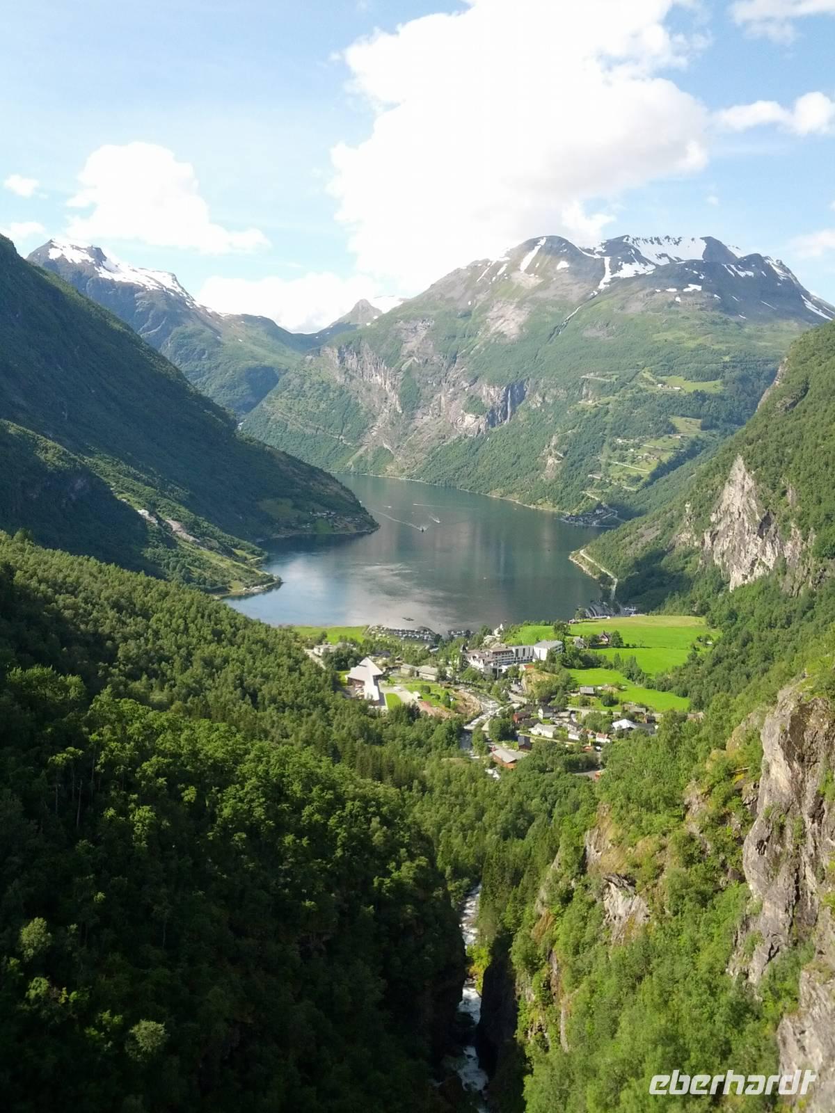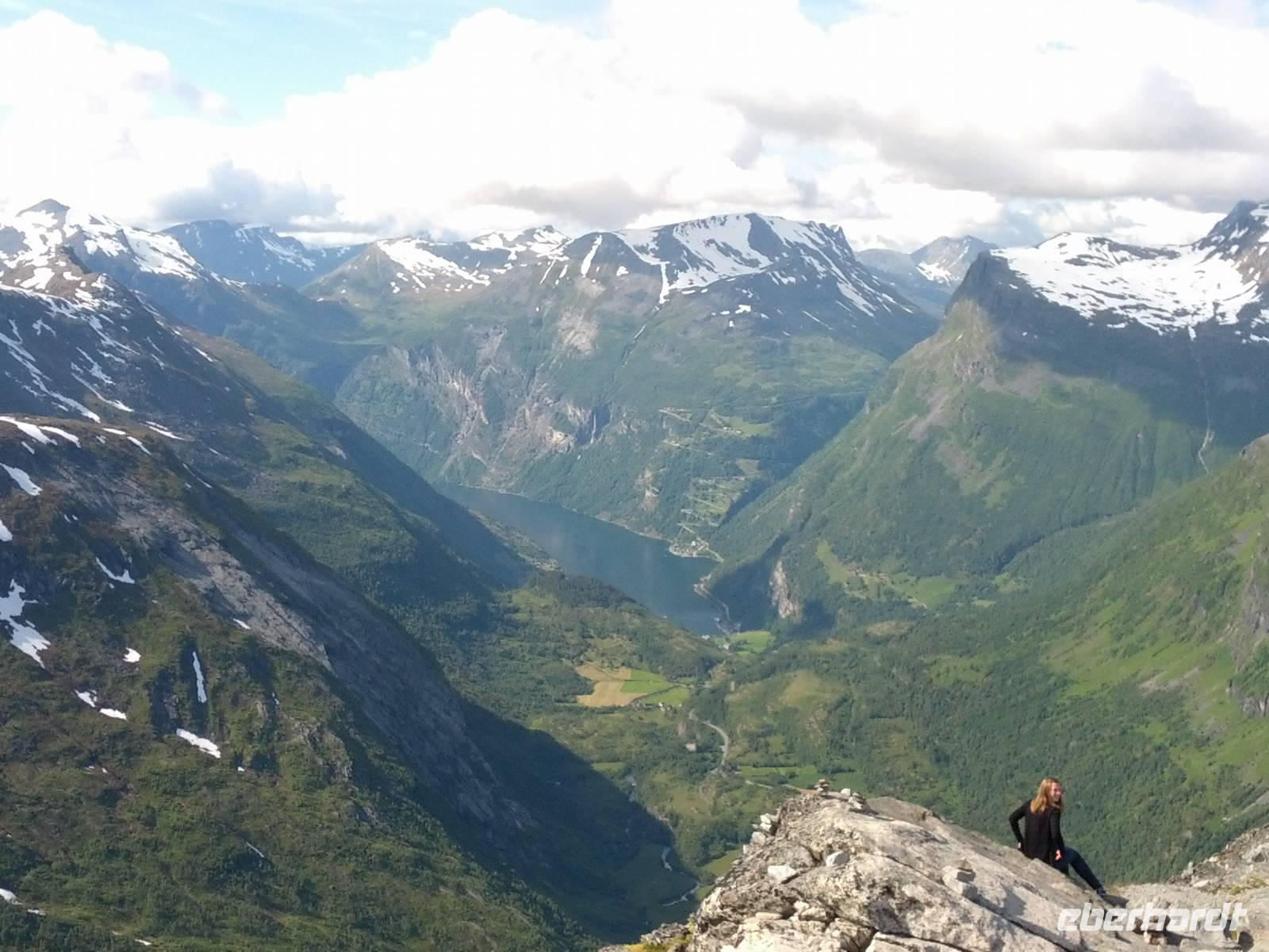 tief unter uns glänzt der Geirangerfjord, ein Bild das man nicht vergisst.