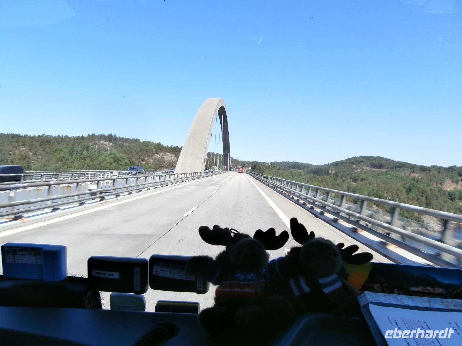 Pünktlich legt unsere Fähre in Göteborg an und gemeinsam gehen wir von Bord. Erste Fotos von der fantastischen Älvsborgbron werden geschossen und im Anschluss fahren wir auch über diese schöne Brücke von Göteborg weg. Entlang der schwedischen Küste über Sarpsborg bis hinein nach Oslo geht unsere Fahrt. Über die Neue Svinesundbrücke, eine