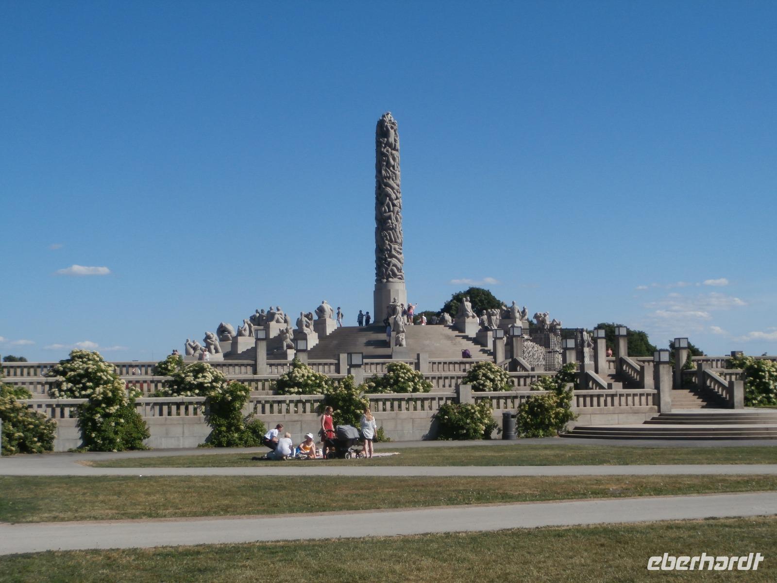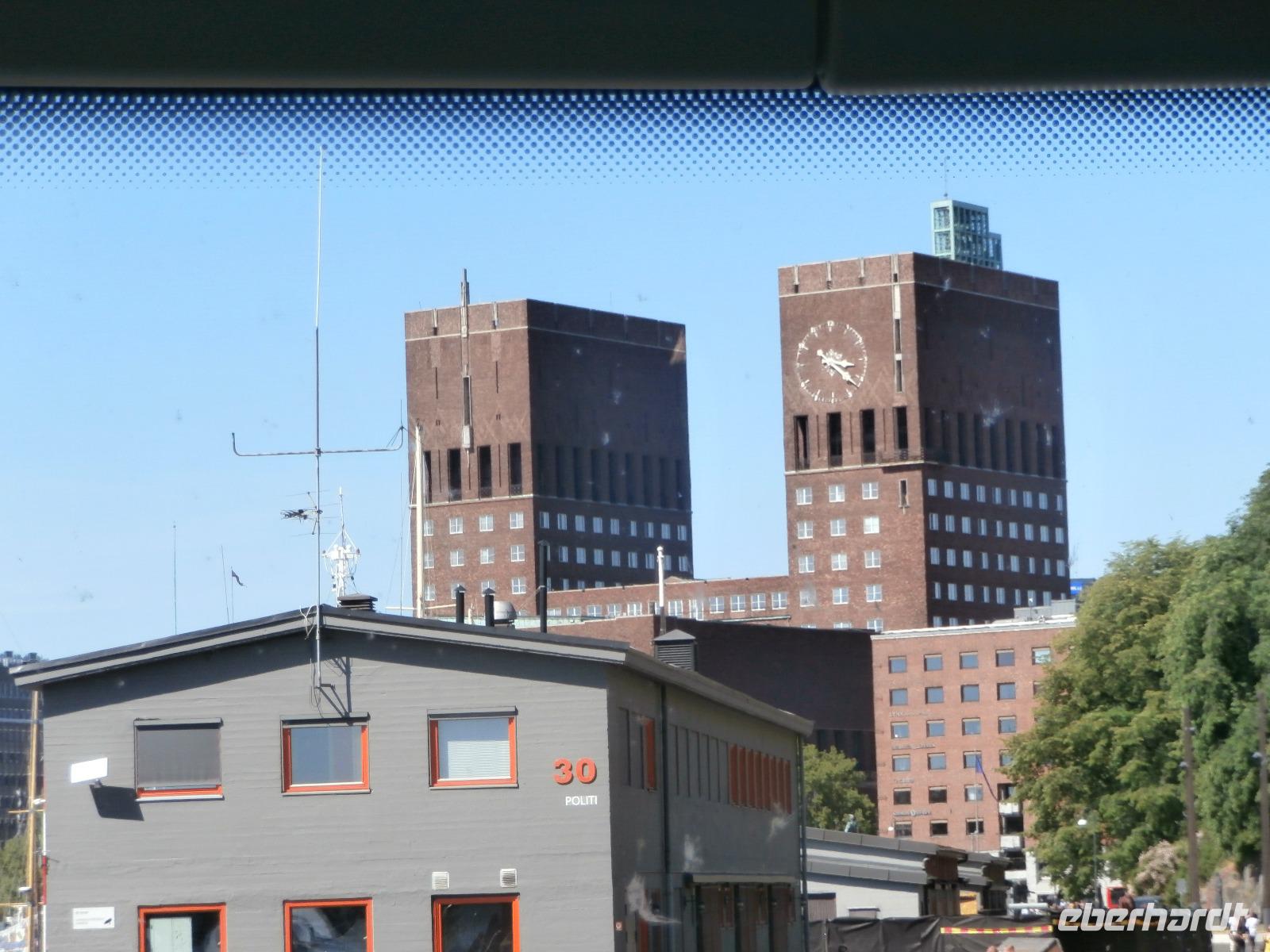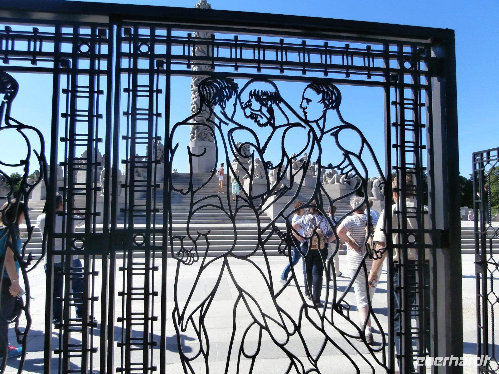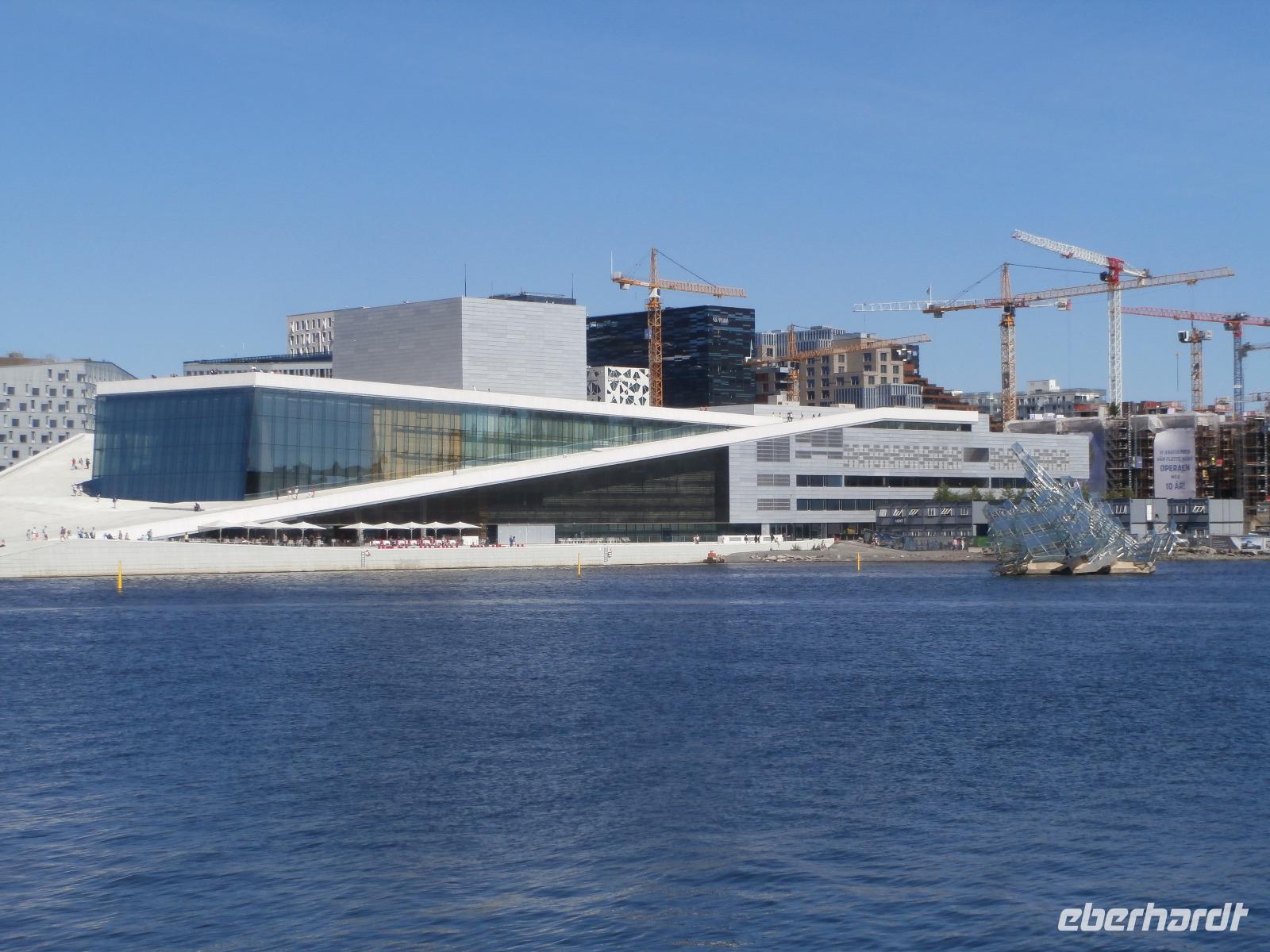Einbogen Brücke, an der links und rechts die Fahrbahnen hängen, reisen wir in Norwegen ein. Ingrid spielt auch hier wie schon bei Ankunft in Schweden, die Nationalhymne ab. Wir haben einen schönen Blick auf die alte Brücke und den Svinesund, er markiert die Grenze zu Norwegen. Die norwegische Hauptstadt am Oslofjord erwartet uns mit Sommertemperaturen und azurblauen Himmel. Im Osloer Rathaus wird jährlich im Dezember der Friedensnobelpreis verliehen. Leider ist es heute nicht möglich hinein zugehen. Mit Gudrun, unserer örtlichen Führerin, fahren wir durch die Stadt, legen in Nähe der fantastischen Oper in weißen Marmor einen Foto Stopp ein und dann geht es zum Vigelandpark. Dieser Skulpturenpark zeigt unter anderem das Leben eines Menschen, ein ganz toller Zyklus geschaffen von Gustav Vigeland. Berühmteste Skulptur ist sicher der kleine Trotzkopf.