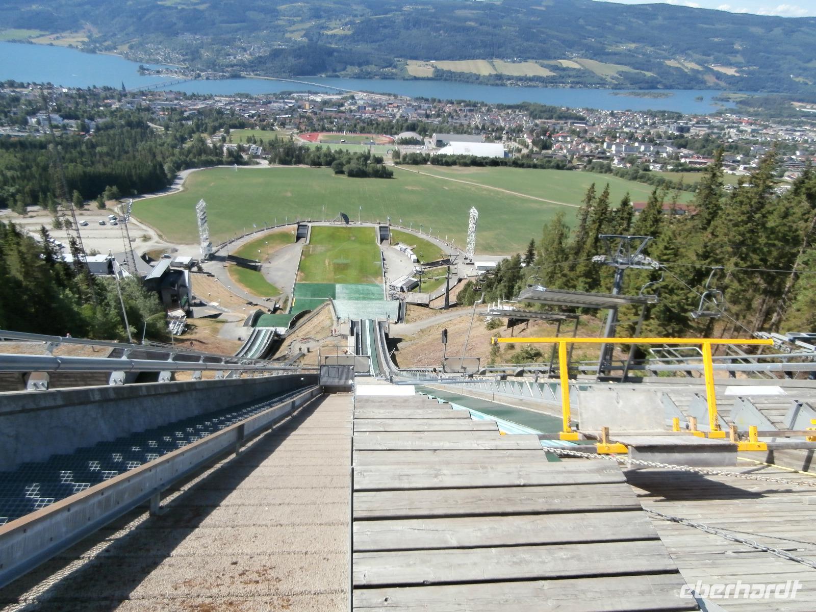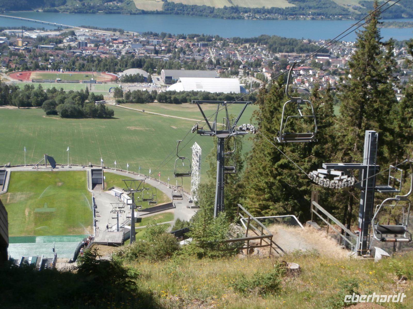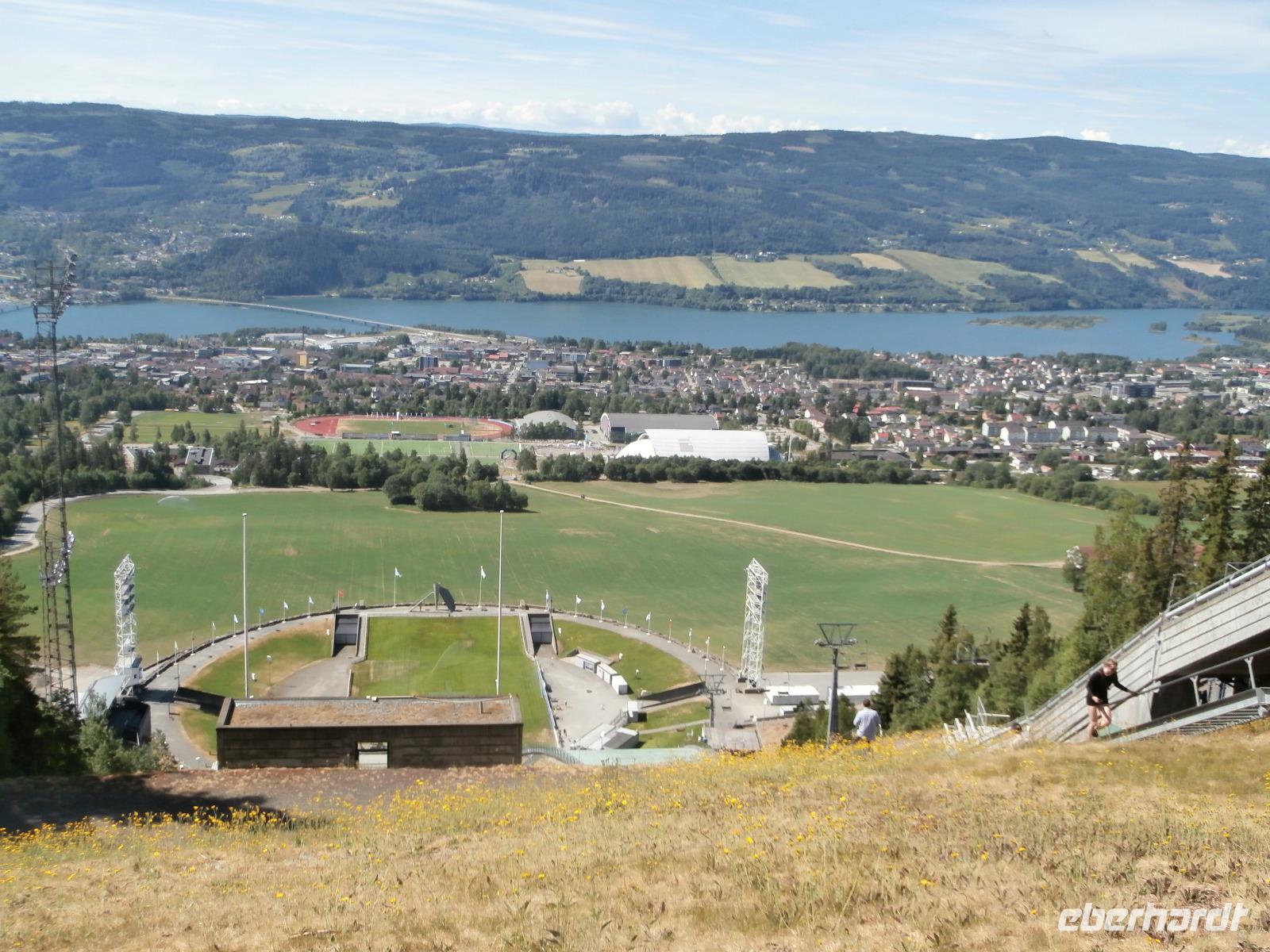 Wir erleben eine Riesenbaustelle an der E 6, der Ausbau geht voran und heute zum Samstag wird kräftig gebaut. In der Vorbeifahrt sehen wir die Olympiahalle Wikingship, ein Foto zu schießen gelingt vereinzelt. Erster großer Höhepunkt unserer Reise ist heute der Besuch der Schanzenanlagen in Lillehammer. Wir können wegen einer sportlichen Großveranstaltung mit dem Bus nicht wie gewohnt bis ran an die Schanzen fahren. Die Möglichkeit mit dem Bus bis ganz nach Oben zum Absprungbereich zu fahren, nutzen wir natürlich. Hier eröffnet sich uns eine gigantische Aussicht auf Lillehammer und den Mjösasee. Im Freilichtmuseum Maihaugen haben wir im Anschluss eine Führung in der Stabkirche, der alten Schule und auf dem Bauernhof. Etwas Freizeit verbringen wir im Anschluss in der Fußgängerzone von Lillehammer.
