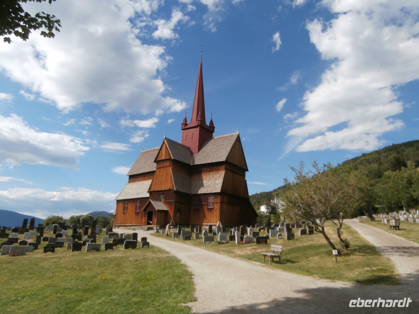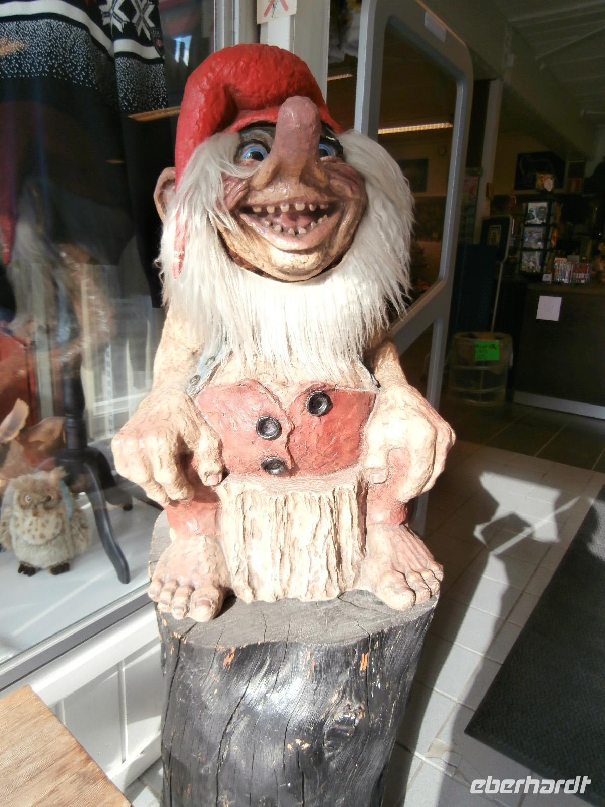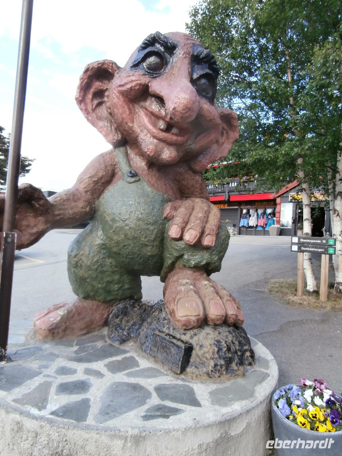 Weiter geht es auf der E6 in Richtung Norden durch Norwegens bekanntes Tal, das Gudbrandsdal, es ist Schauplatz vieler alter Legenden, von Kunst und Kultur, hier verläuft auch der Peer Gynt Weg. In Ringebu verlassen wir kurz die nordwärts führende E6 und richten unseren Blick gen Stabkirche oben am Berg. Wir dürfen für paar Minuten kostenfrei in die Kirche schauen. Sie begeistert mit ihrer dezenten Ausstattung, dazu gehören auch sehr schöne Bilder und ein Leuchter. In Dombas erreichen wir am Abend unser Dombas Hotel, mit einem leckeren Büffet Essen lassen wir den Tag ausklingen. Vorm Einkaufszentrum nehmen wir ein erstes Foto von einem Troll auf.