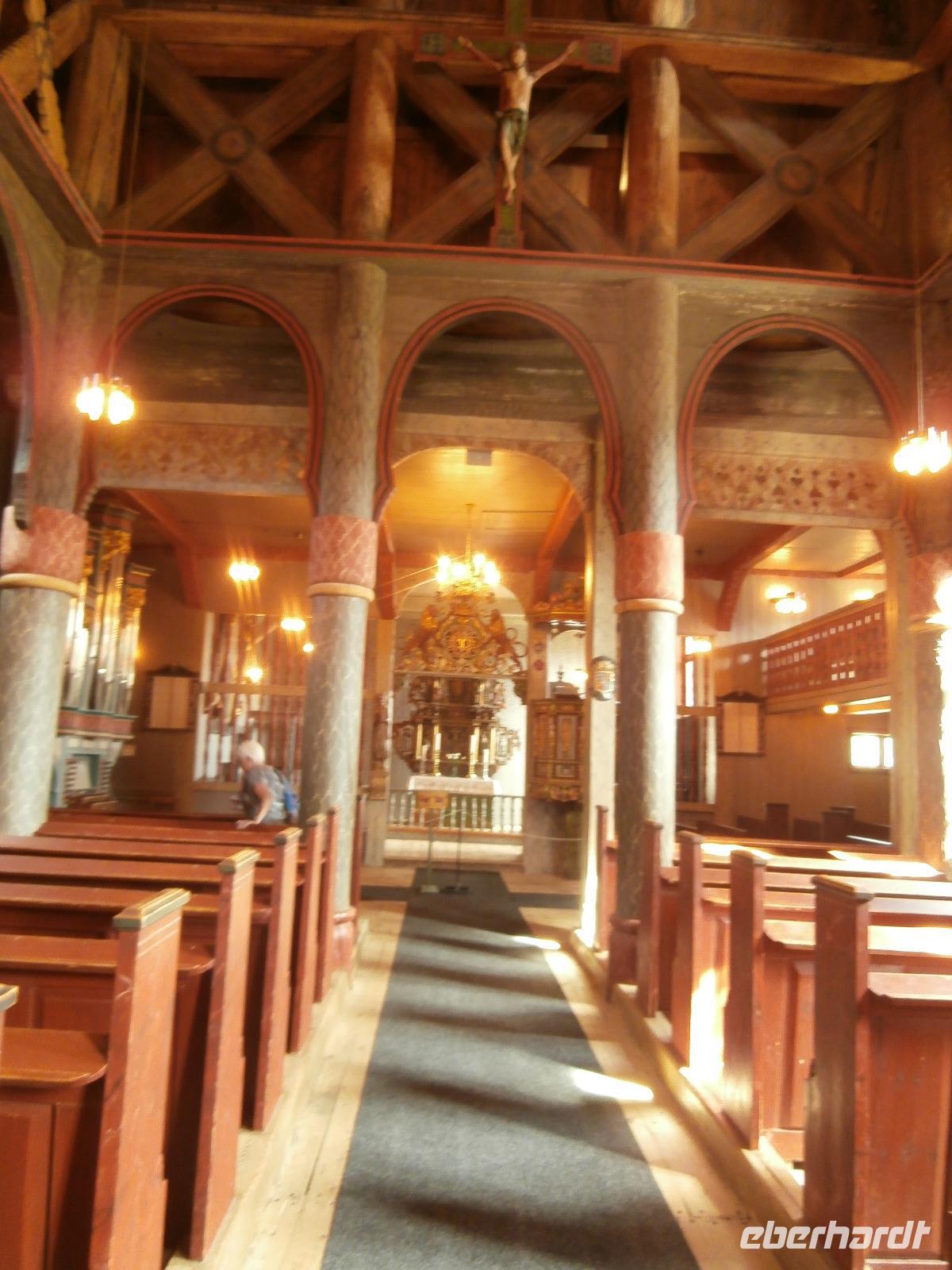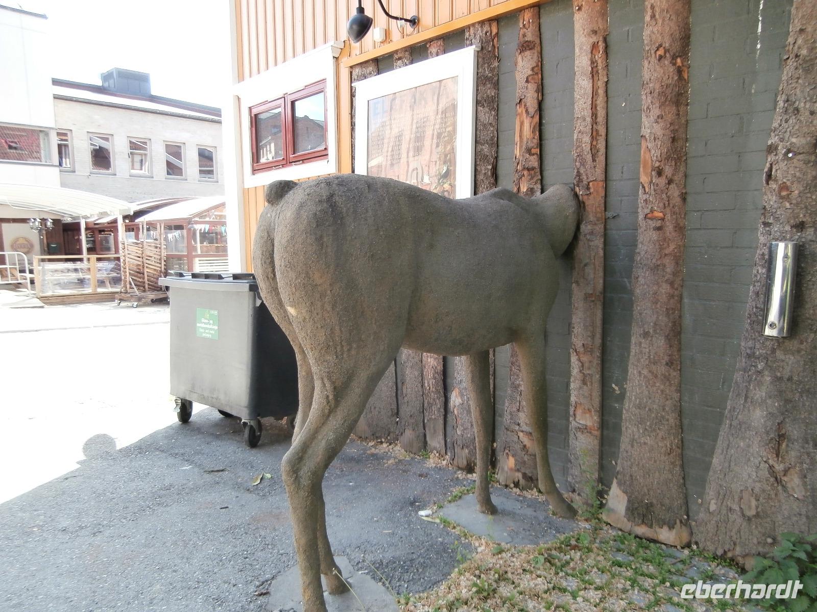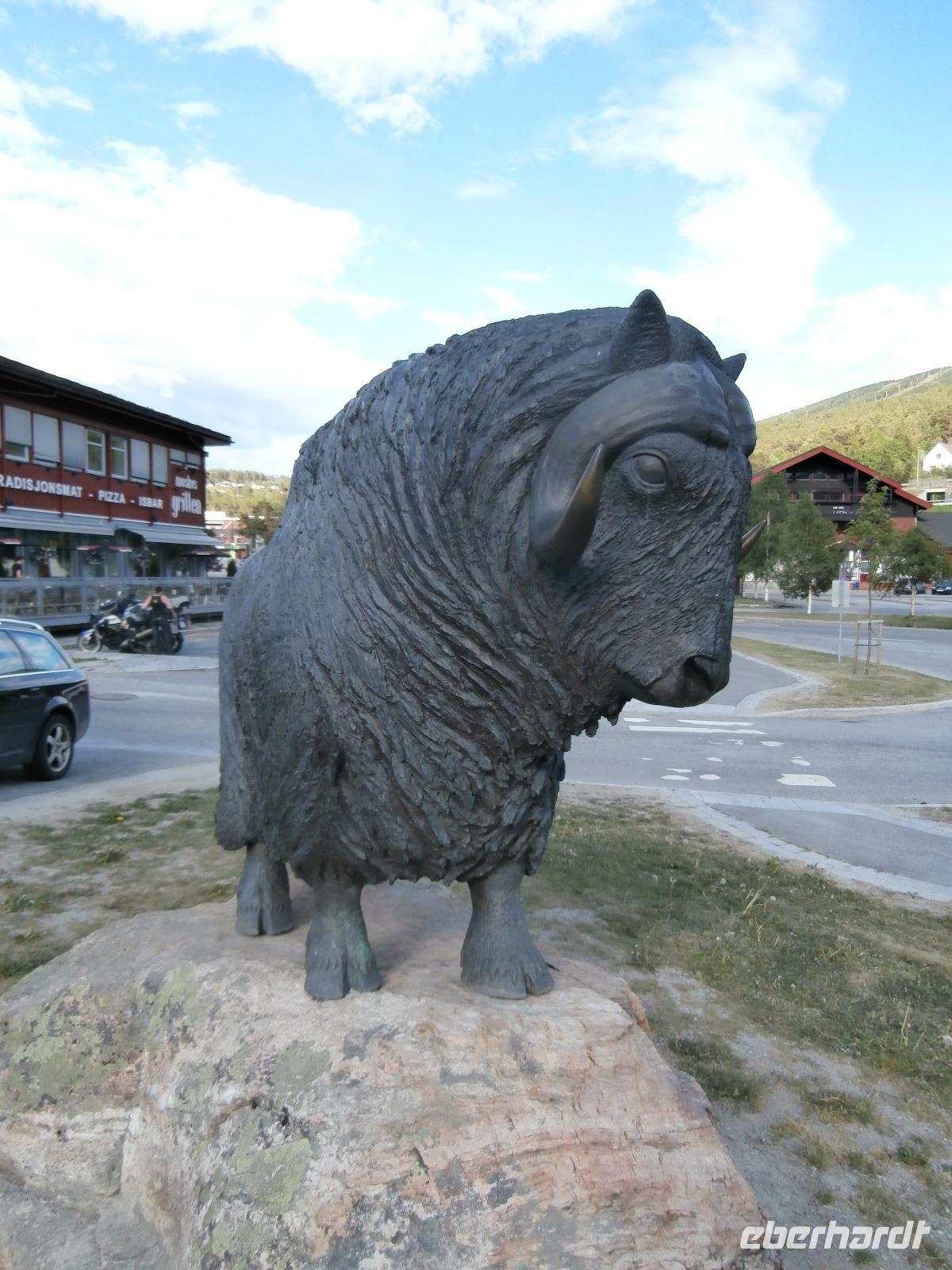 Weiter geht es auf der E6 in Richtung Norden durch Norwegens bekanntes Tal, das Gudbrandsdal, es ist Schauplatz vieler alter Legenden, von Kunst und Kultur, hier verläuft auch der Peer Gynt Weg. In Ringebu verlassen wir kurz die nordwärts führende E6 und richten unseren Blick gen Stabkirche oben am Berg. Wir dürfen für paar Minuten kostenfrei in die Kirche schauen. Sie begeistert mit ihrer dezenten Ausstattung, dazu gehören auch sehr schöne Bilder und ein Leuchter. In Dombas erreichen wir am Abend unser Dombas Hotel, mit einem leckeren Büffet Essen lassen wir den Tag ausklingen. Vorm Einkaufszentrum nehmen wir ein erstes Foto von einem Troll auf.