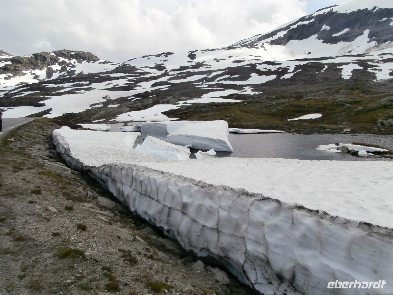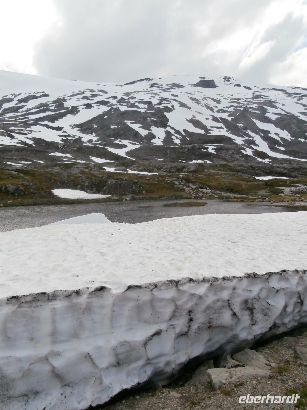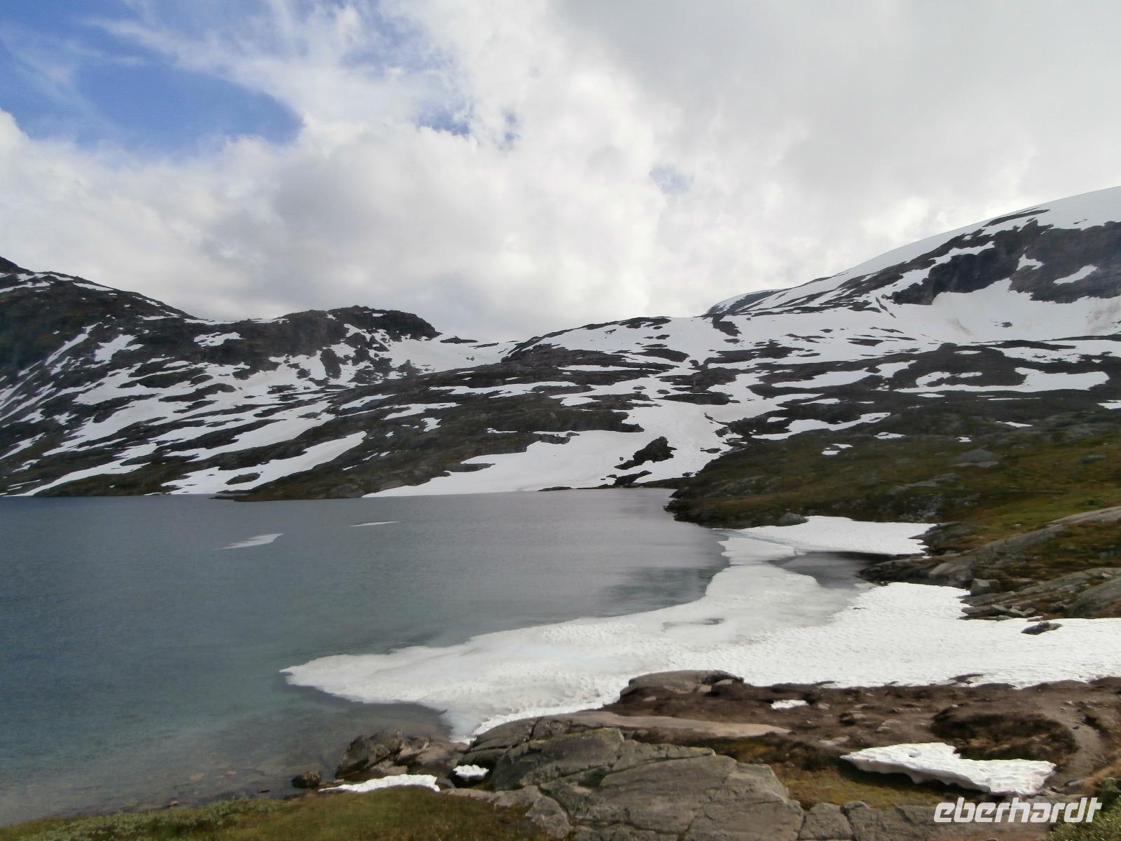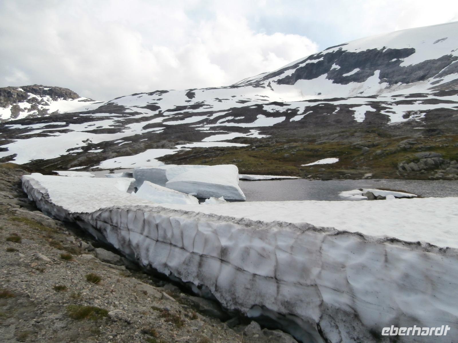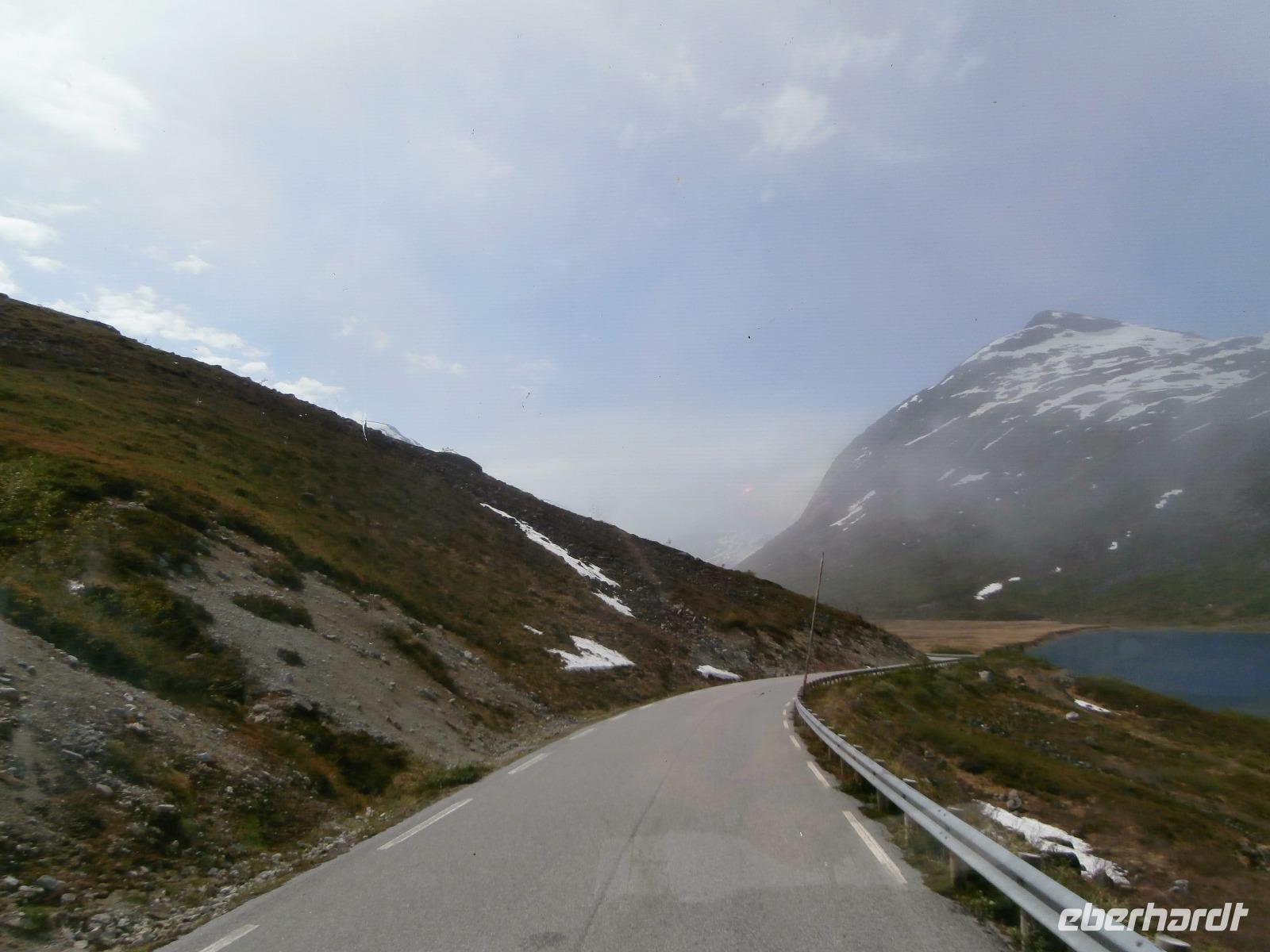 Kurs auf den Dalsnibba, dieser Aussichtsgipfel ist 1500m hoch. Leider wird zur Zahlung für die mautpflichtige Serpentinenstrecke unser Voucher nicht mehr akzeptiert, man hat auf Bezahlung mit Kreditkarte und Electronic umgestellt. Am Djupvassvatnet nutzen wir das schöne Wetter zum Fotografieren, Eisschollen zwischen Stein und Wasser sind toll anzusehen. Unterwegs gibt Ingrid noch im Namen von Eberhardt Travel ein kleines Picknick aus. Wir verkosten Elch-und Rentiersalami, Multebeermarmelade und auch Kaviar auf Knäckebrot.