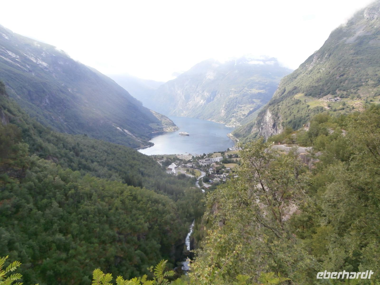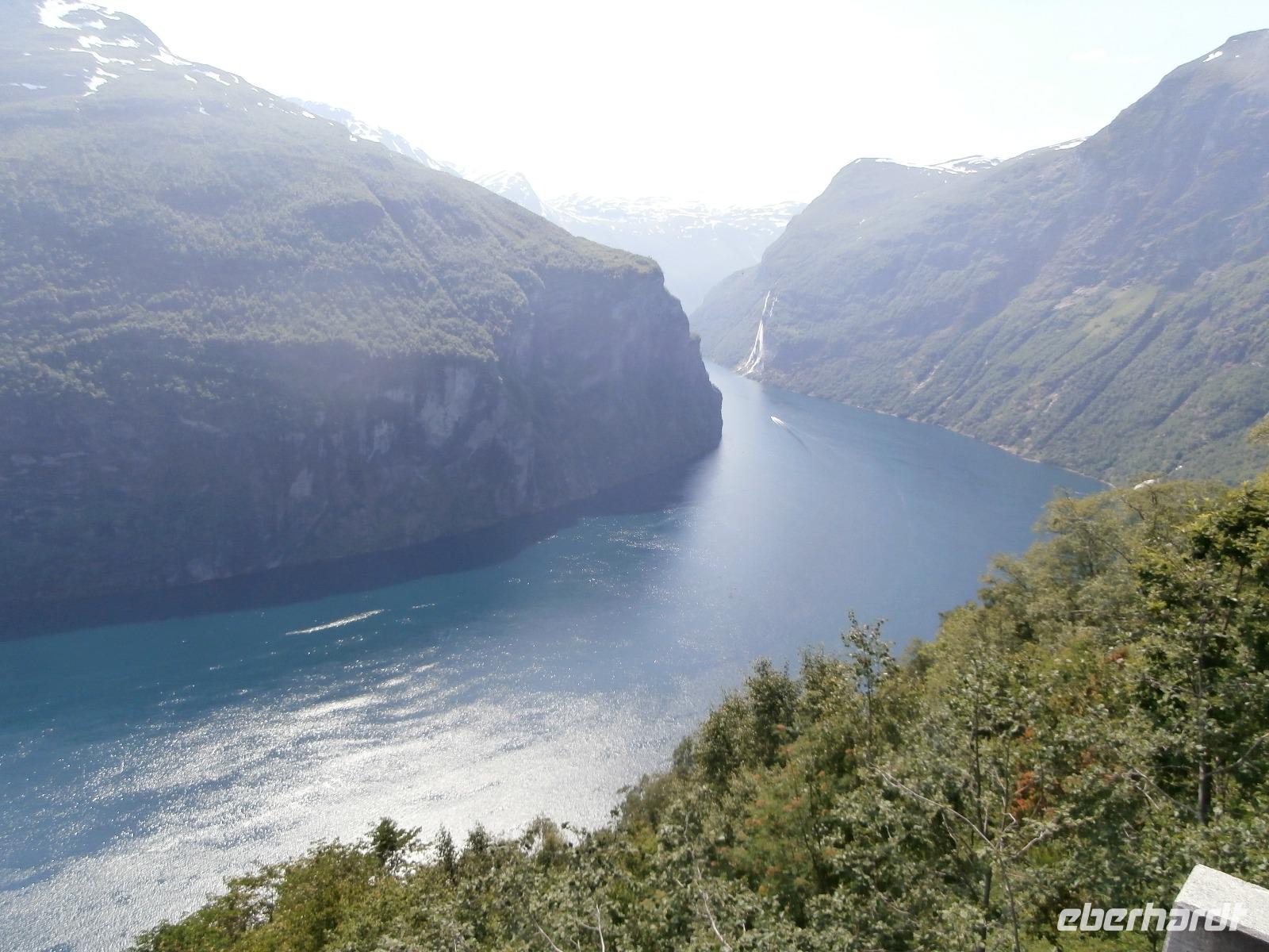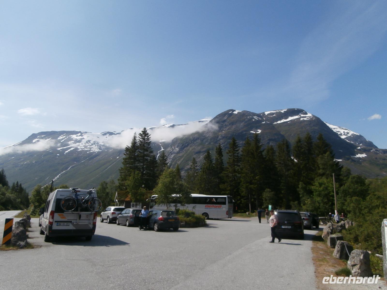 In Dombas verstauen wir am Sonntagmorgen wieder unser Gepäck und weiter geht die Fahrt in Richtung Andalsnes und mit uns die Raumabahn, sie soll eine der schönsten Eisenbahnstrecken Norwegens sein. Sie führt durch die wildromantische Landschaft des Romsdals und wir bekommen die Bahn auch zu sehen. Hinter Björli stoppen wir am Slettafossen und danach wollen wir die imposante Trollwand sehen, Europas höchste Steilwand. Leider hüllt sie sich in Wolken. Gegen Mittag machen wir uns auf den Weg, die von hohen Gipfeln und tiefen Schluchten umgebene Bergstraße Trollstige, die ihren Namen von der Volkssage um die dort "hausenden Trolle" erhalten hat, zu erkunden. Die 11 Haarnadelkurven überwinden wir mit Hochachtung vor der Fahrkunst unseres Fahrers Jörg. Es gibt leider wahnsinnig viel Nebel, die Fahrzeuge sind so gut wie nicht im Nebel zu sehen, es kommt zu Staus. Das Plateau der "Trollstige" ist kaum zu sehen, unser Aufenthalt hier dauert nicht lang. Unsere Weiterfahrt hinab ins Valldal und zum Fjord, bringt den blauen Himmel und die Sonne wieder. Herrliche Ausblicke sind uns vergönnt. Am Canyon Gudbrandsjuvet machen wir einen Fotostopp und weiter geht es durch das romantische Valldal, das Zentrum des Erdbeeranbaus. In Linge kommen wir an den großartigen Tafjord, der ein Seitenarm des Storfjordes ist. Nach einer kurzen Fährüberfahrt von Linge erreichen wir Eidsdal und setzen unsere Fahrt in Richtung Geiranger fort. Unseren Fotostopp am Aussichtspunkt der „Adlerstraße" erleben wir bei schönstem Wetter. Heute nächtigen wir vor der Kulisse des Geirangerfjordes inmitten dieser beeindruckenden Bergwelt im Hotel Geiranger. Wir nehmen bei fantastischer Sicht