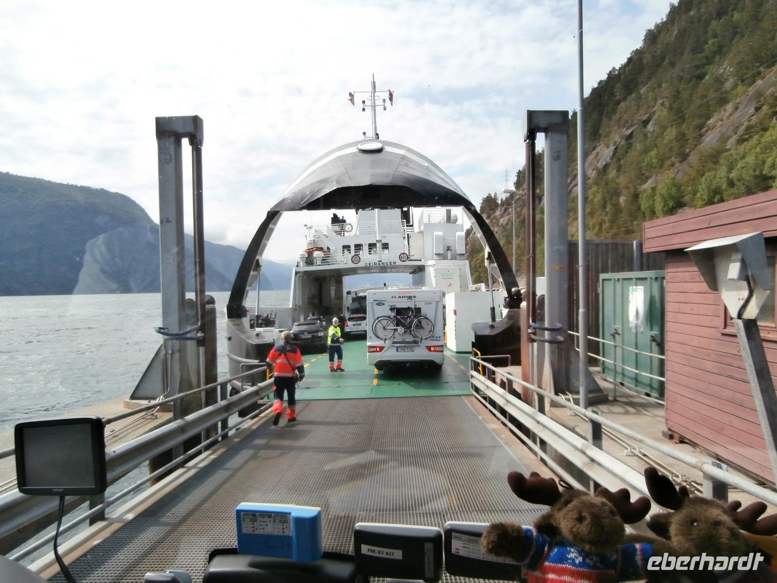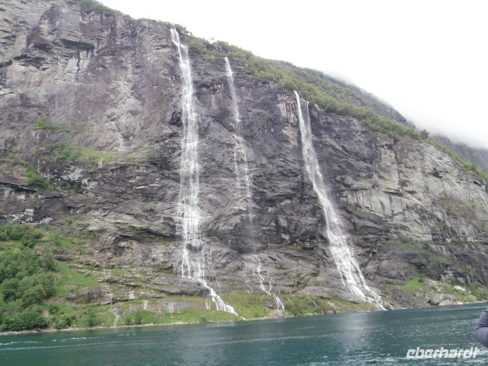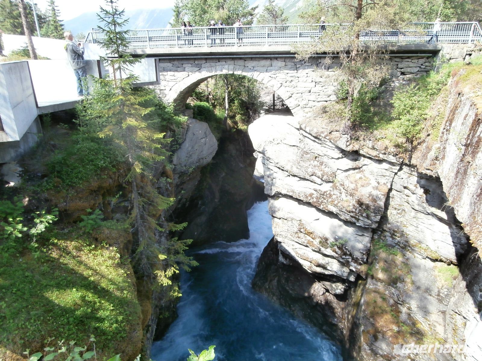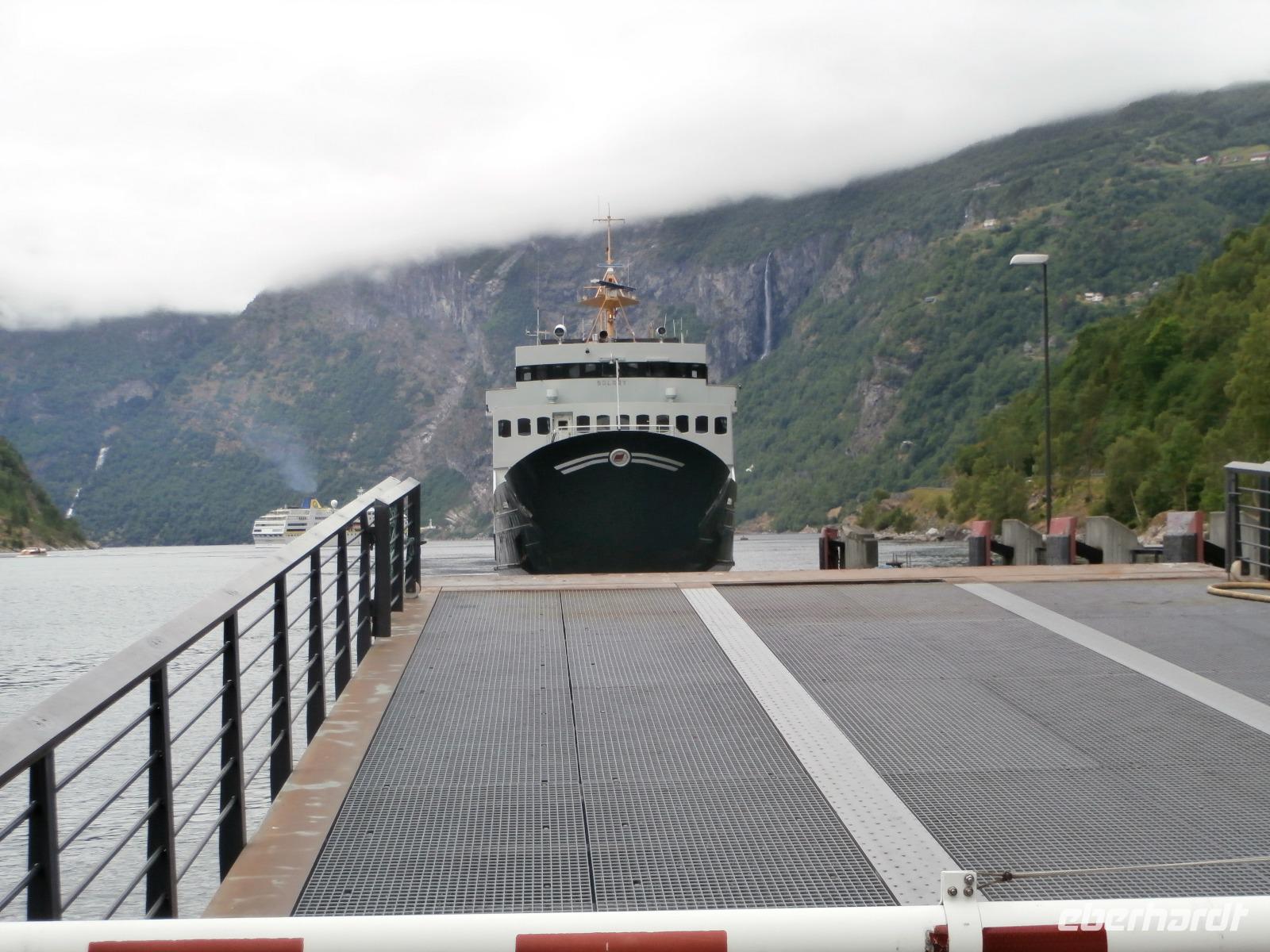 In Dombas verstauen wir am Sonntagmorgen wieder unser Gepäck und weiter geht die Fahrt in Richtung Andalsnes und mit uns die Raumabahn, sie soll eine der schönsten Eisenbahnstrecken Norwegens sein. Sie führt durch die wildromantische Landschaft des Romsdals und wir bekommen die Bahn auch zu sehen. Hinter Björli stoppen wir am Slettafossen und danach wollen wir die imposante Trollwand sehen, Europas höchste Steilwand. Leider hüllt sie sich in Wolken. Gegen Mittag machen wir uns auf den Weg, die von hohen Gipfeln und tiefen Schluchten umgebene Bergstraße Trollstige, die ihren Namen von der Volkssage um die dort "hausenden Trolle" erhalten hat, zu erkunden. Die 11 Haarnadelkurven überwinden wir mit Hochachtung vor der Fahrkunst unseres Fahrers Jörg. Es gibt leider wahnsinnig viel Nebel, die Fahrzeuge sind so gut wie nicht im Nebel zu sehen, es kommt zu Staus. Das Plateau der "Trollstige" ist kaum zu sehen, unser Aufenthalt hier dauert nicht lang. Unsere Weiterfahrt hinab ins Valldal und zum Fjord, bringt den blauen Himmel und die Sonne wieder. Herrliche Ausblicke sind uns vergönnt. Am Canyon Gudbrandsjuvet machen wir einen Fotostopp und weiter geht es durch das romantische Valldal, das Zentrum des Erdbeeranbaus. In Linge kommen wir an den großartigen Tafjord, der ein Seitenarm des Storfjordes ist. Nach einer kurzen Fährüberfahrt von Linge erreichen wir Eidsdal und setzen unsere Fahrt in Richtung Geiranger fort. Unseren Fotostopp am Aussichtspunkt der „Adlerstraße" erleben wir bei schönstem Wetter. Heute nächtigen wir vor der Kulisse des Geirangerfjordes inmitten dieser beeindruckenden Bergwelt im Hotel Geiranger. Wir nehmen bei fantastischer Sicht