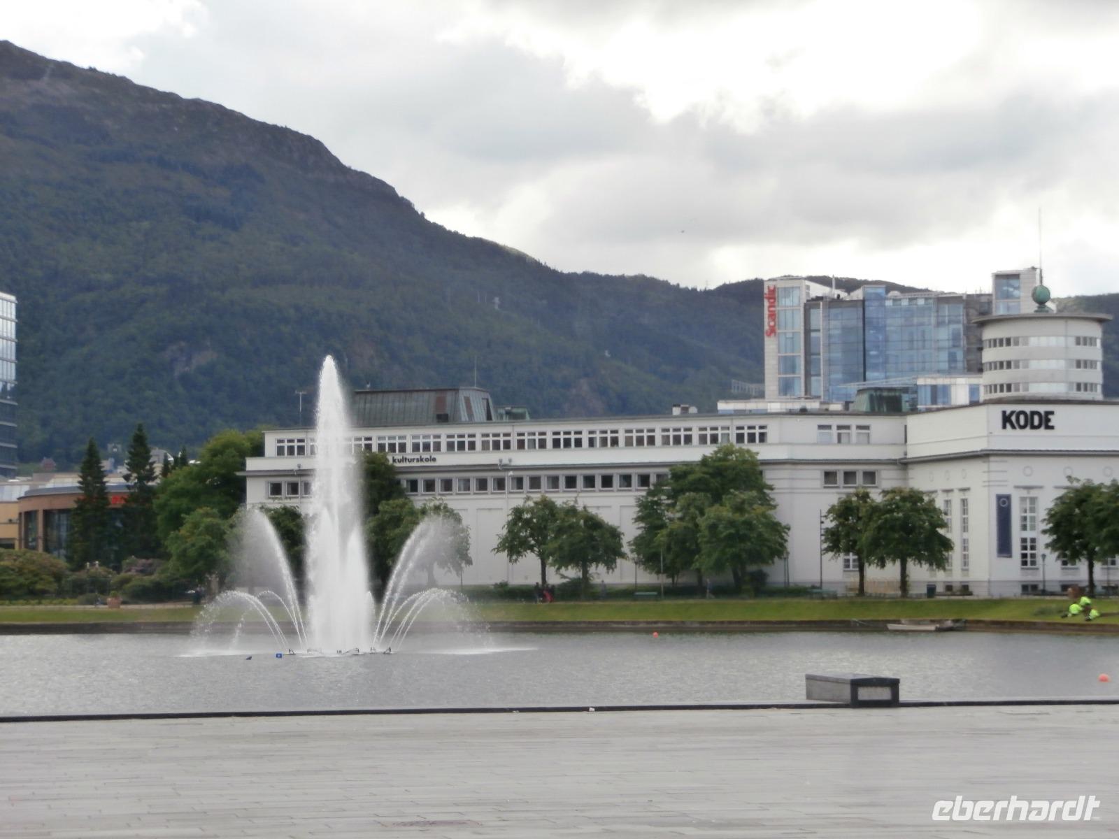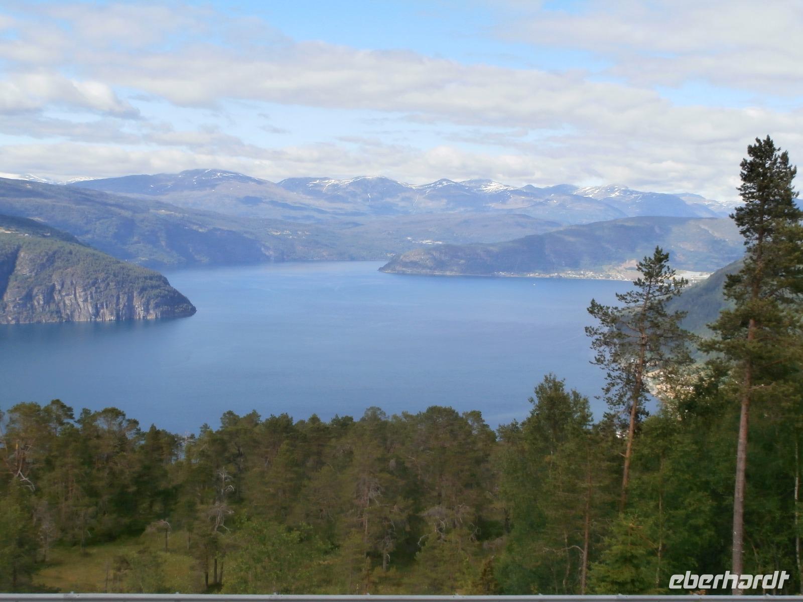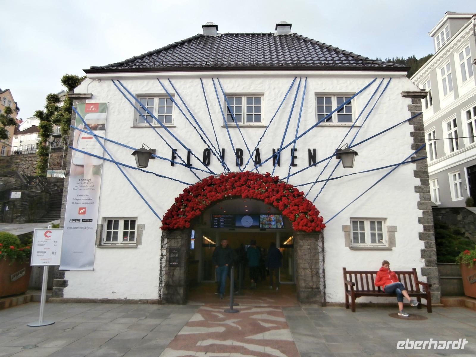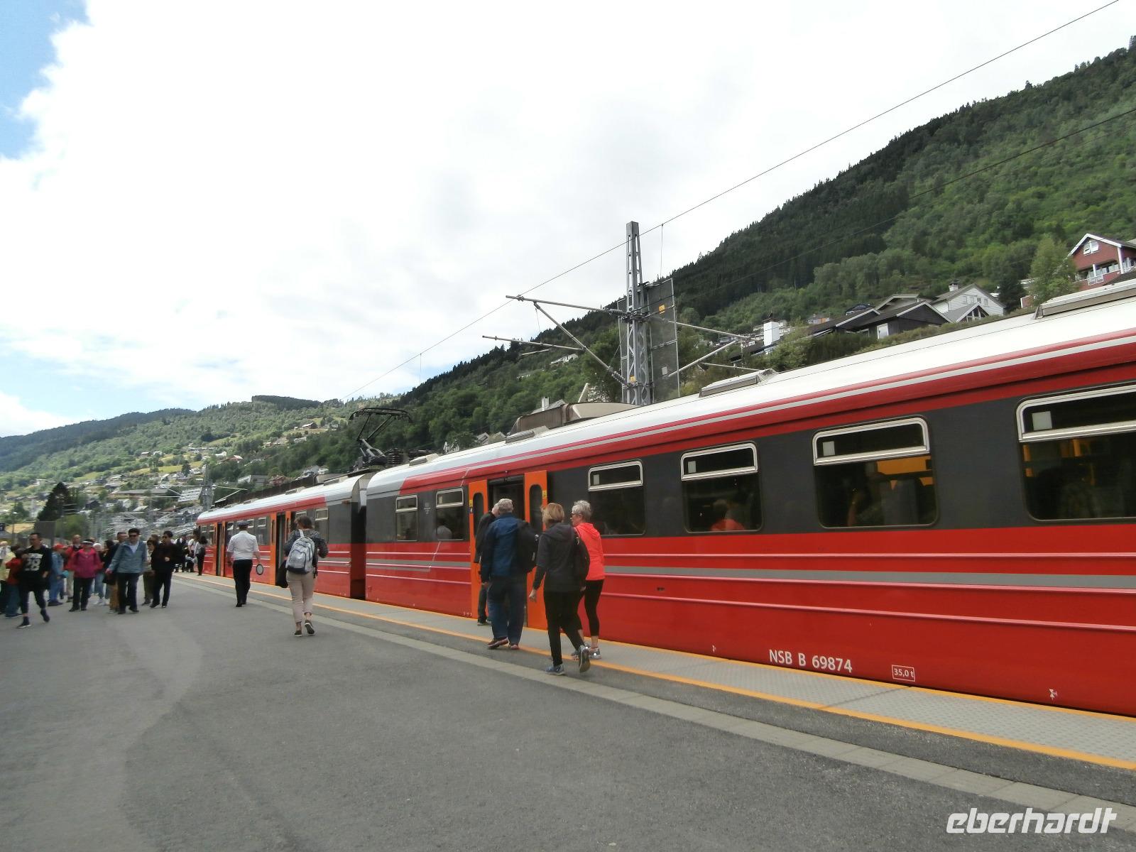 Unsere Reise geht weiter, heute Morgen fahren wir bis zum Fährhafen in Kaupanger, von hieraus starten wir zur Kreuzfahrt im Sognefjord, auch durch den Auerlandsfjord geht die Seereise. Sonnenschein und angenehme Temperaturen begleiten uns wieder, welch ein Segen. In Gudvangen können wir erst verspätet die Fähre verlassen, es wird knapp mit der Zeit. Mit dem Bus geht die Fahrt weiter nach Flam. Knapp vor Abfahrt der Bahn treffen wir ein, endlich können wir unsere reservierten Plätze im Zug einnehmen. Die Fahrt mit der Flam Bahn ist für uns ein fantastisches Erlebnis. Am Kjosfossen steigen wir aus und mit Musik und Tanz der Elfen gibt es den nächsten Höhepunkt des Tages. Auch die Bergenbahn muss auf uns warten in Myrdal, die Flam Bahn kommt verspätet an. Wir steigen um in die Bergenbahn und in einer rasanten Fahrt durch die herrliche Natur und viele Tunnel kommen wir nach Voss, hier werden wir schon von Jörg mit dem Bus erwartet. Nach unserer Kaffeepause treten wir die Fahrt nach Bergen an. Die Anfahrt zum Thon Hotel Bristol gestaltet sich schwierig, Ingrid erkundet am Ende zu Fuss, wo sich das Hotel befindet. Nach dem Abendessen im Restaurant Egon fahren wir zum Fløyen hinauf, blauer Himmel und Sonne, so präsentiert sich der Berg. Er bietet uns in einem guten Licht fantastische Ausblicke auf die Stadt und die Schärenwelt.