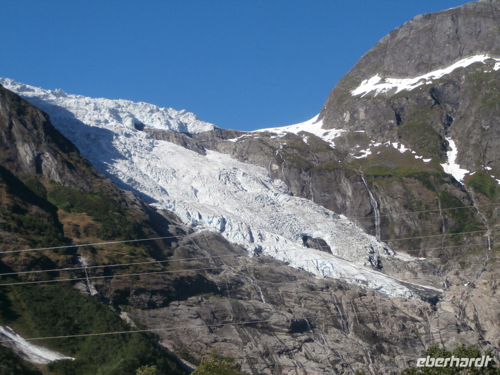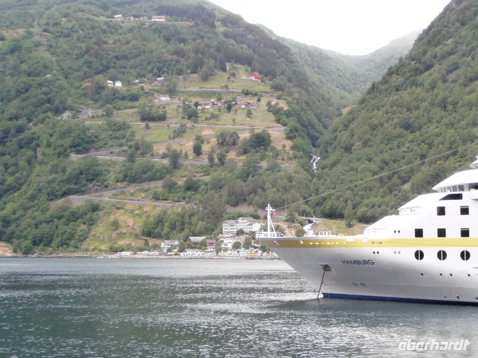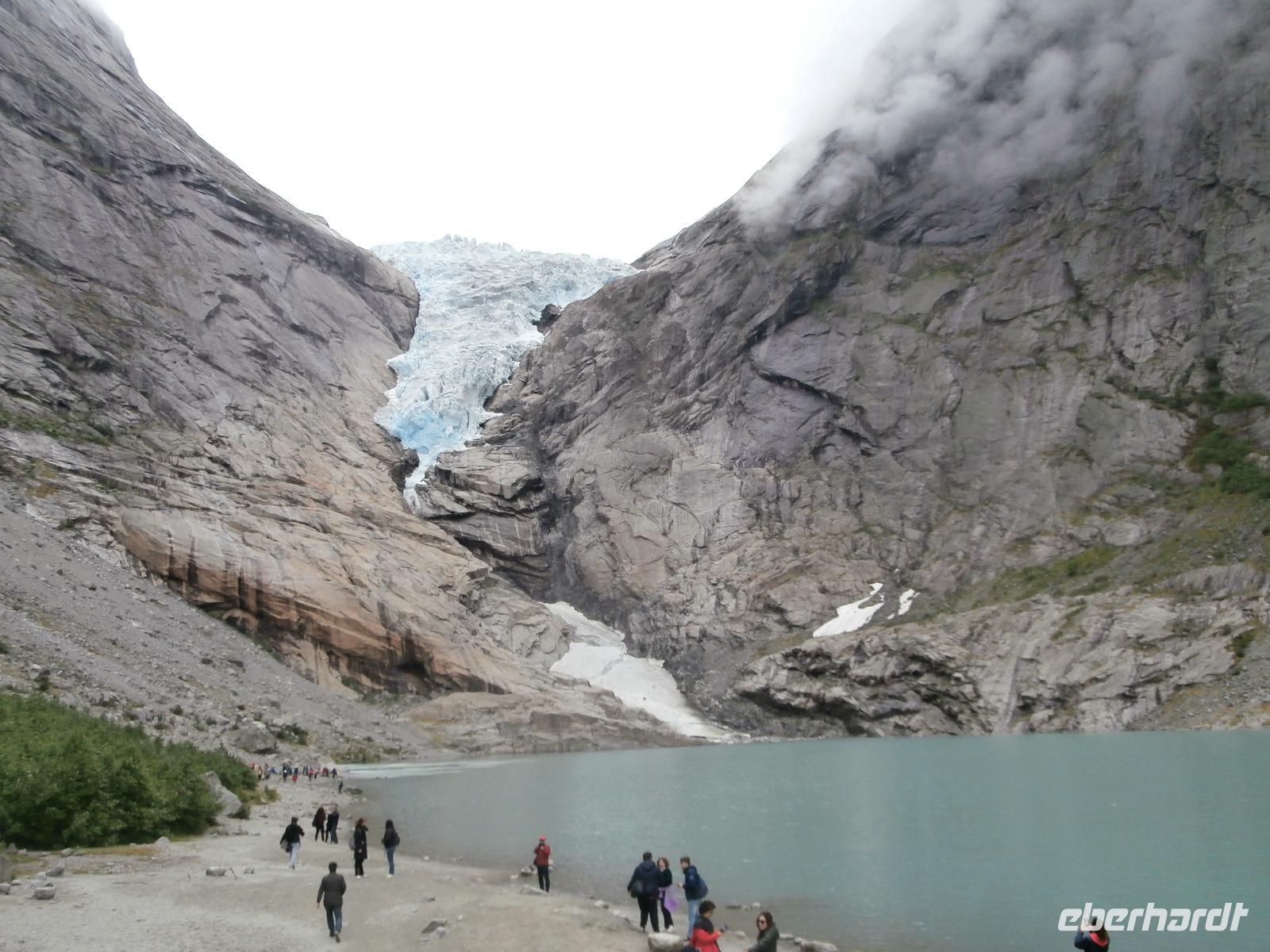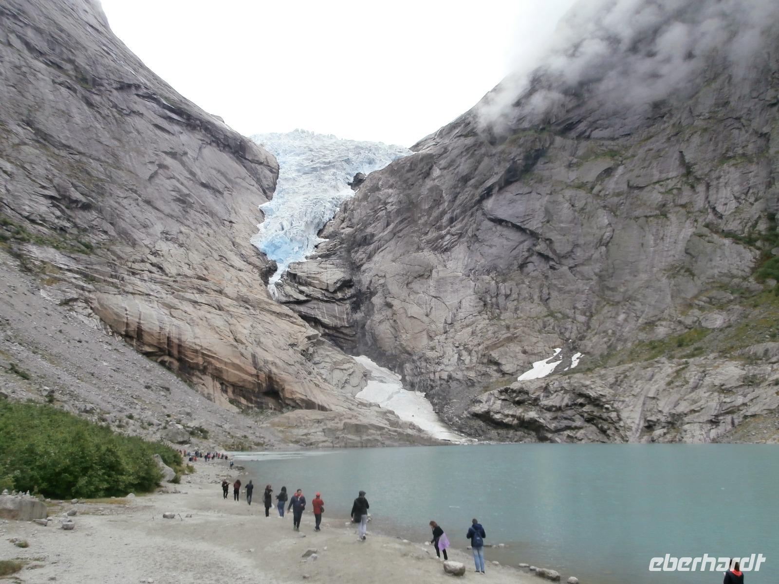 Heute Morgen liegen 2 Kreuzfahrtschiffe im Geirangerfjord, „Mein Schiff 5" und die „Hamburg". Am späten Morgen starten wir unsere Kreuzfahrt im Geirangerfjord. Er zählt wohl zu den schönsten und meistbesuchten Fjorden mit bis zu 800 Meter hohen Felswänden zu beiden Seiten. Wir sehen in die Tiefe tosende Wasserfälle mit Namen wie "Die sieben Schwestern" oder "Der Freier." Von Hellesylt aus geht die Fahrt in Richtung Süd entlang von Fjorden bis hinein in das Gletschergebiet des Jostedalbreen. Auch auf der Anfahrt zum Gletschergebiet sehen wir nochmals Kreuzfahrer, ein Schiff der Rederei „Costa" liegt bei Loen im Fjord. Bei Sonnenschein begeben wir uns auf eine Wanderung zum Briksdalsbreen. Sehr viel Wasser ist in den Fossen, tosend stürzt das Wasser hinab begleitet von riesigen Gischtschleiern. Am Nachmittag geht unsere Fahrt mit einigen Fotostopps z.B.am Boyabreen, hinauf aufs Utvikfjell und vorbei am Fjaerfjord bis nach Sogndal am königlichen Sognefjord. In Hafslo nächtigen wir heute im Hotel Eikum am Hafslo See und lassen es uns gutgehen. Im Hotel herrscht eine angenehme Ruhe und die Lage direkt am See gefällt uns.
