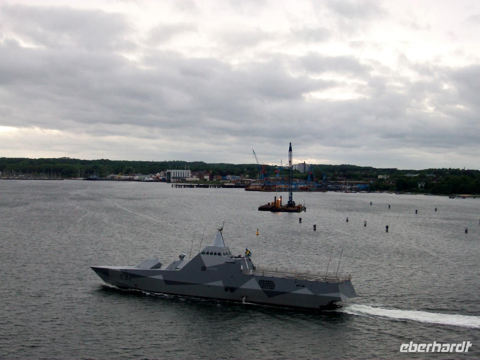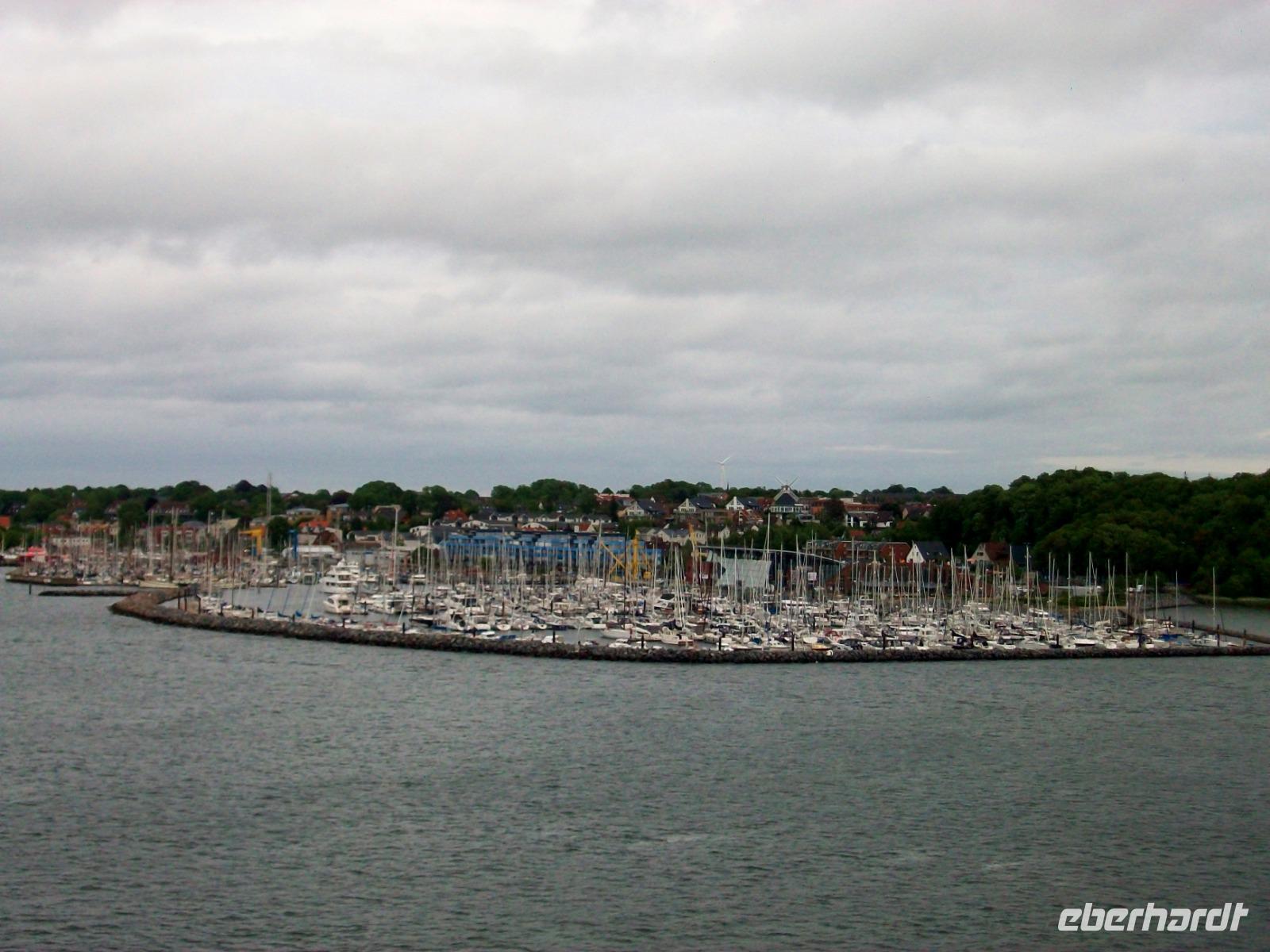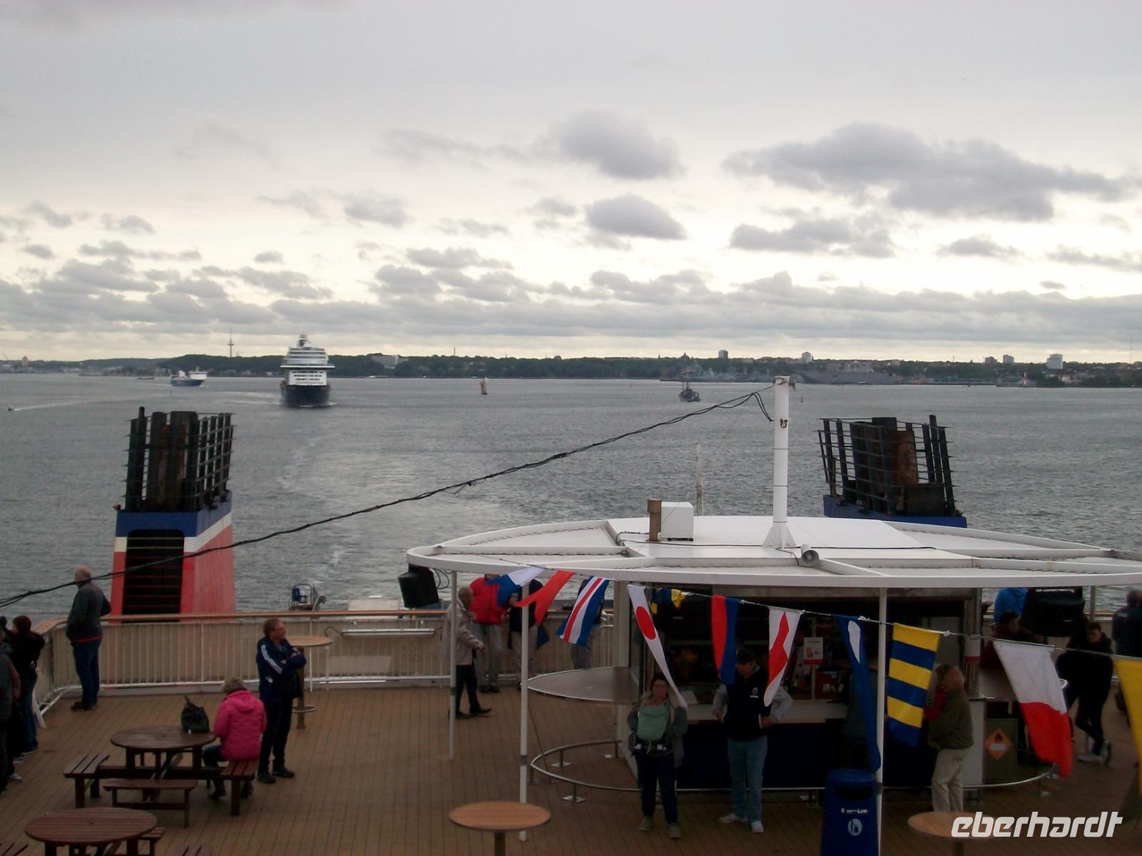 Dann legen wir ab; trotz kühlen Windes lassen wir uns die Ausfahrt durch die Kieler Förde mit den zahlreichen Sehenswürdigkeiten nicht entgehen.