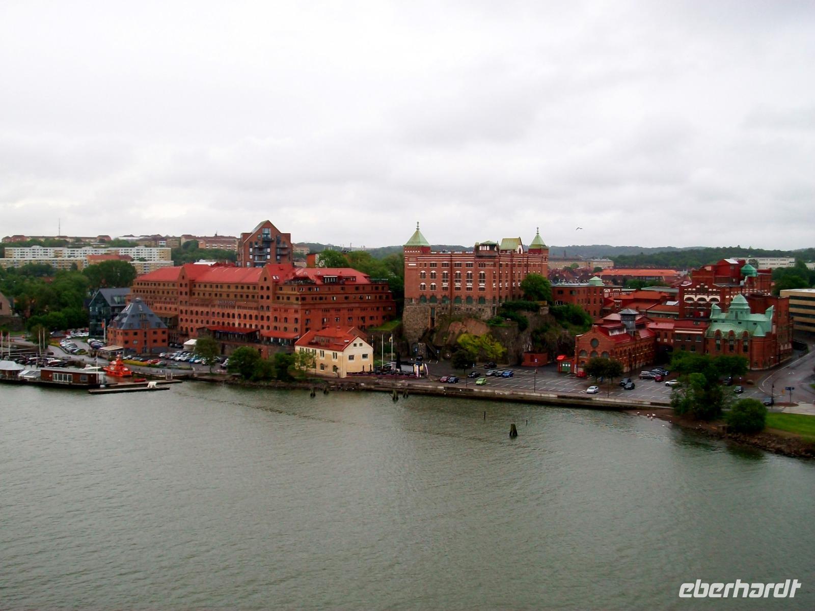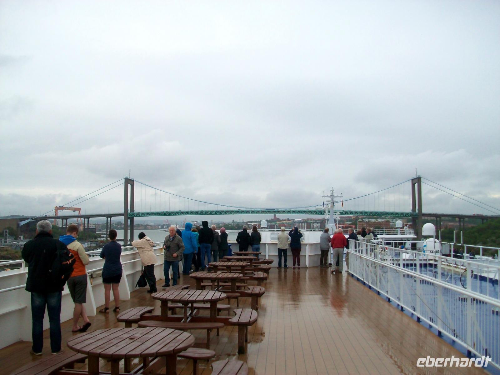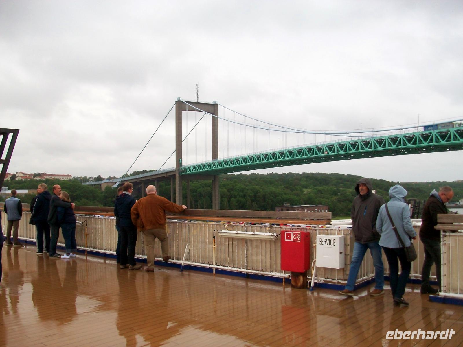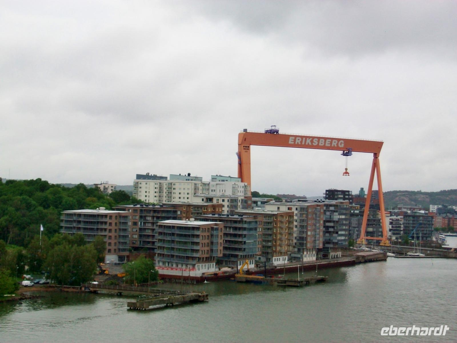Gegen sieben erwartet uns ein stärkendes Frühstück und während es uns schmeckt, nähern wir uns langsam unserem ersten Ziel für heute: Göteborg. Eine reizvolle Schärenlandschaft zieht an unseren Augen vorbei und dann geht es hinauf an Deck, die Einfahrt in diese Hafenstadt ist auch nicht ohne Reiz. Wir sehen die Hafenanlagen, die Festung und die Häuser der Stadt. Unter einer Brücke hindurch gelangen wir zum Anleger und bald können wir die Nachtfähre verlassen. Das Wetter zeigt sich momentan etwas wechselhaft und auf dem Weg durch die schöne schwedische Landschaft tröpfelt es leicht. Es gibt immer etwas zu schauen; gesunde Wälder, sanfte Granitfelsen und immer wieder Wasser. Tief hat sich der Svinesund ins Land gegraben, diese Meerenge überqueren wir und sind nun schon in Norwegen angekommen.
