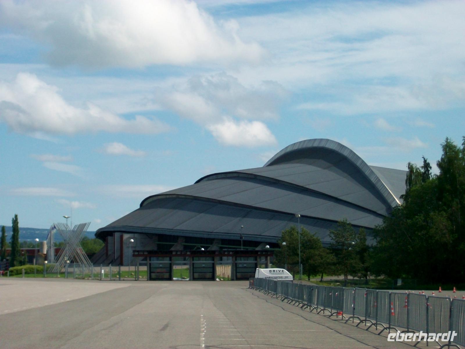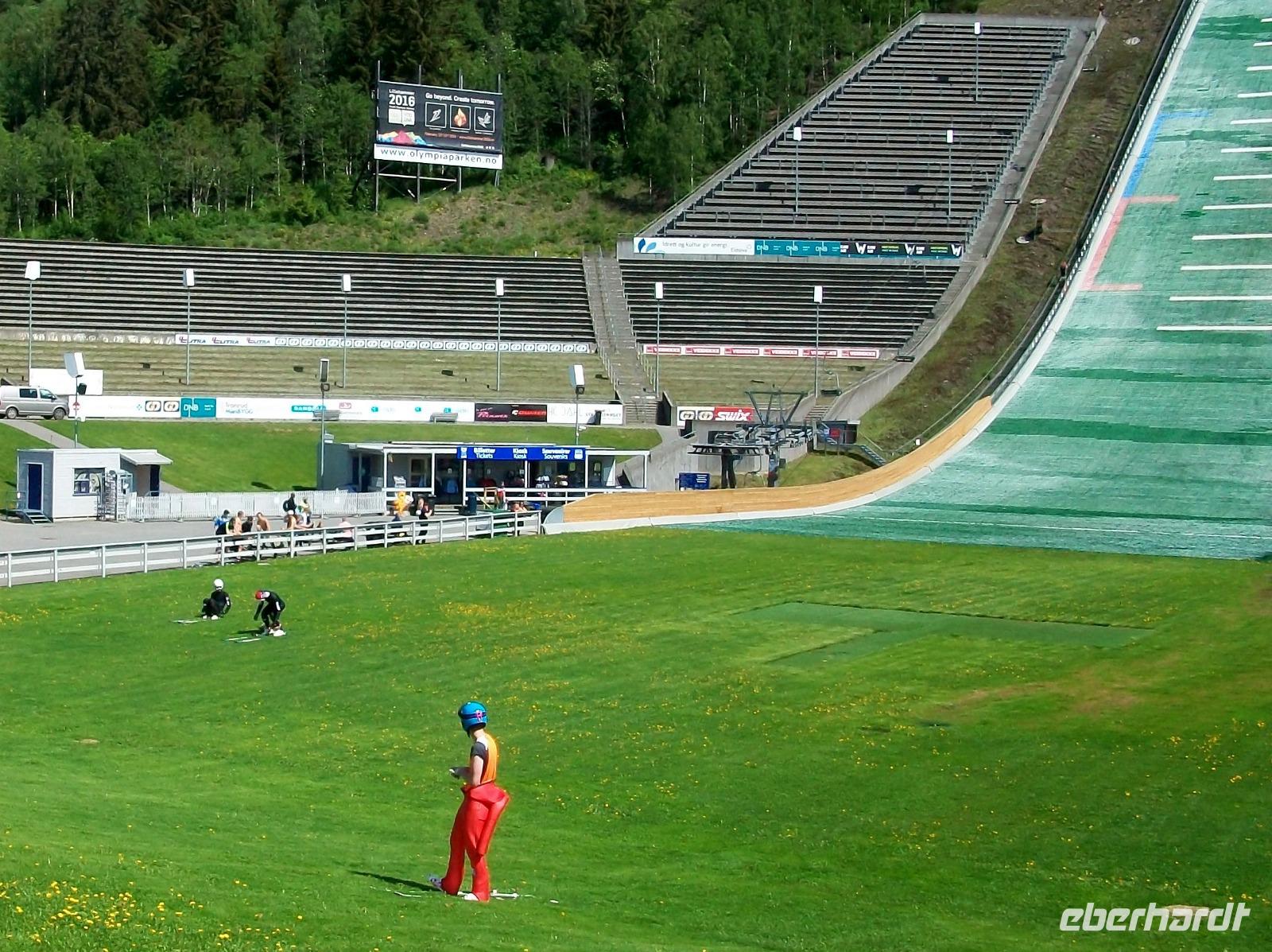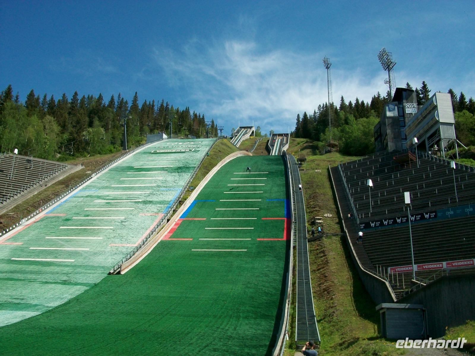 8.6.2019. Heute steht für uns wieder ein ereignisreicher Tag an, als wir uns das Frühstück schmecken lassen hat sich über dem kleinen Wald vor unserem Hotel Morgennebel festgesetzt, mal schauen wie sich das Wetter gestaltet. Kurz nach neun starten wir bei Sonnenschein und der Weg führt uns nach Norden. Bald kommt die große Wasserfläche des Miøsasees in unser Blickfeld und ganz romantisch gelangen wir an seinem Ufer in Richtung Lillehammer. Schon von weitem sind die Sprungschanzen dieses berühmten Wintersportortes zu sehen, das ist unser erstes Ziel am heutigen Tag. Langsam schlängeln wir uns nach oben zum Skistation. Hier sehen wir dass die Schanzen mit grünen Matten präpariert sind und kommen auch in den Genuss einige Trainingssprünge sehen zu können.