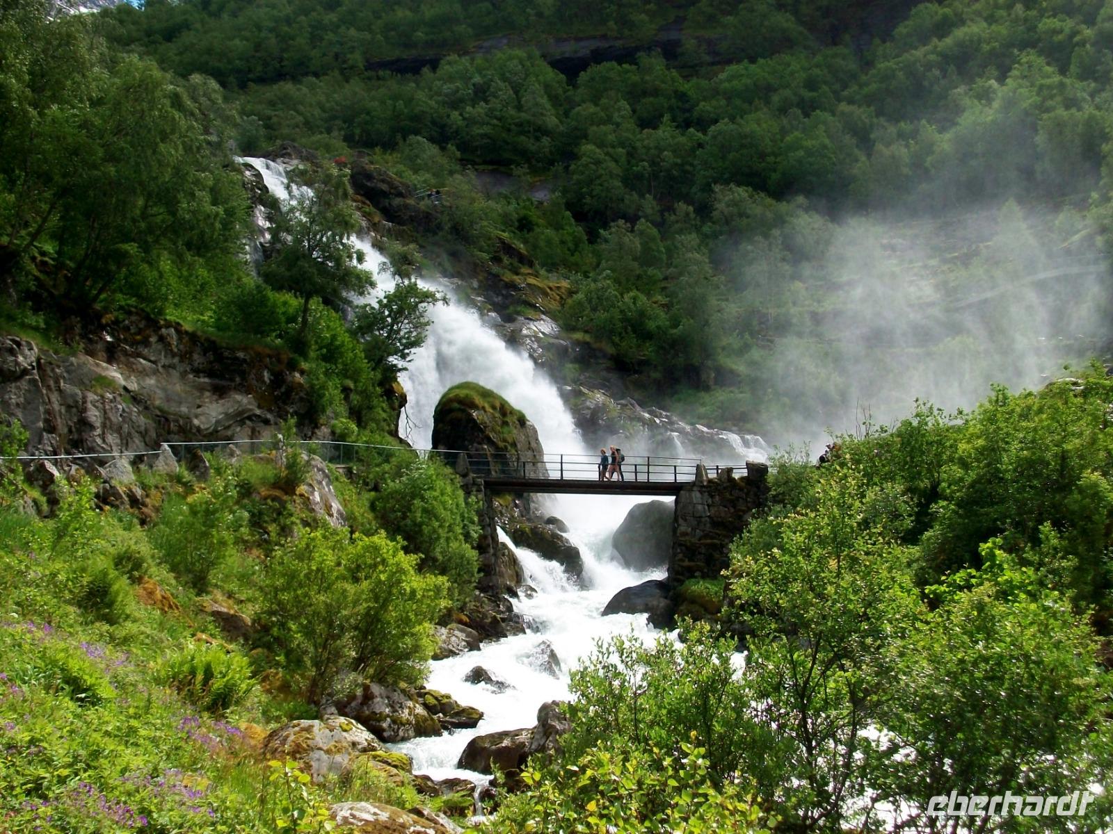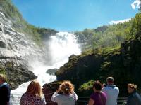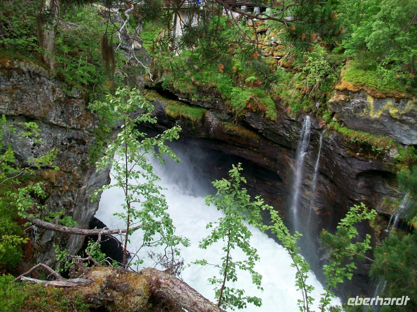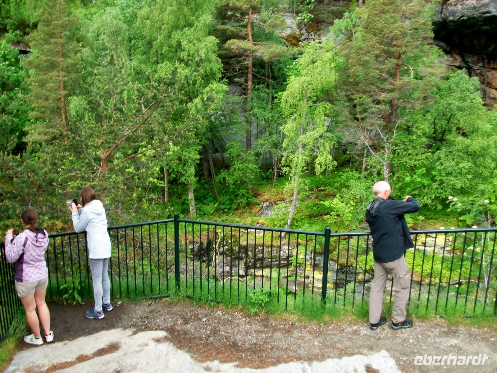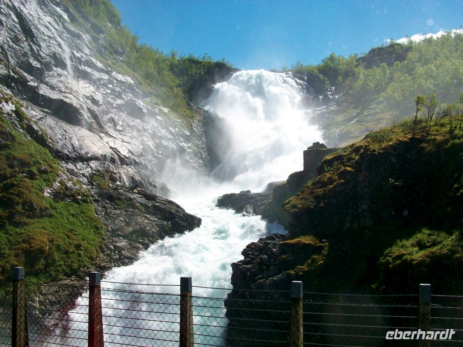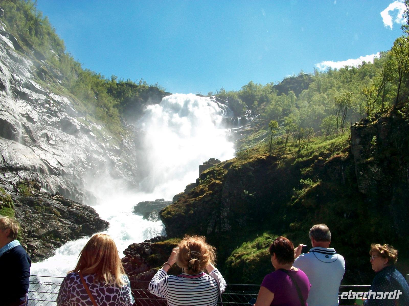9.6.2019 Weitere Höhepunkte hat uns der heutige Tag zu bieten. Zunächst starten wir um in der wunderschönen Natur Norwegens unterwegs zu sein. Während es unten im Tal grünt und blüht zeigen sich die Berge auch in dieser Jahreszeit noch schneebedeckt. Wir sind nur eine Stunde unterwegs und schon gelangen wir zu einem beeindruckenden Wasserfall, es ist der Sletafoss. Wir stehen oberhalb und sehen wie das Wasser donnernd zu Tal rauscht.
