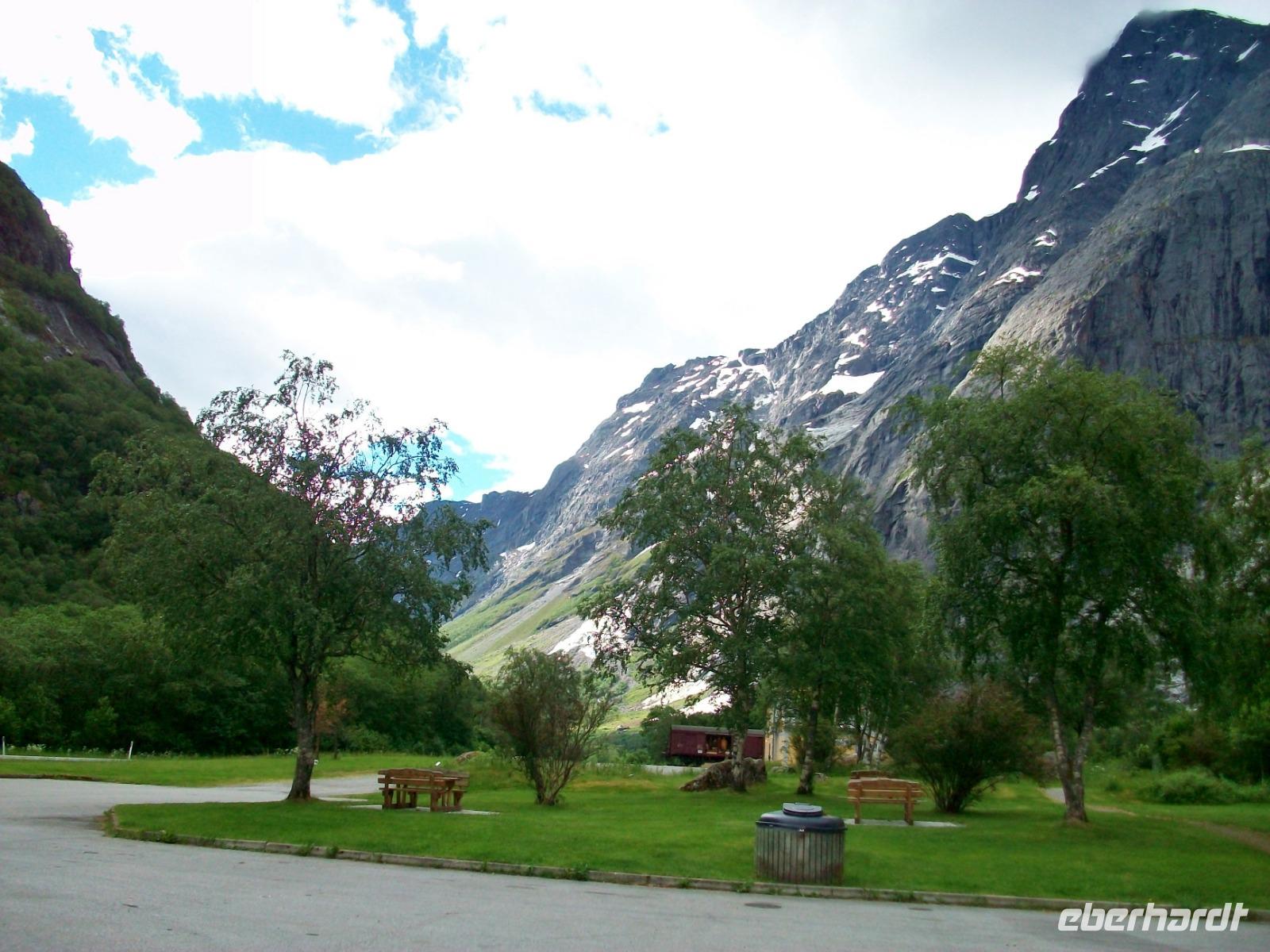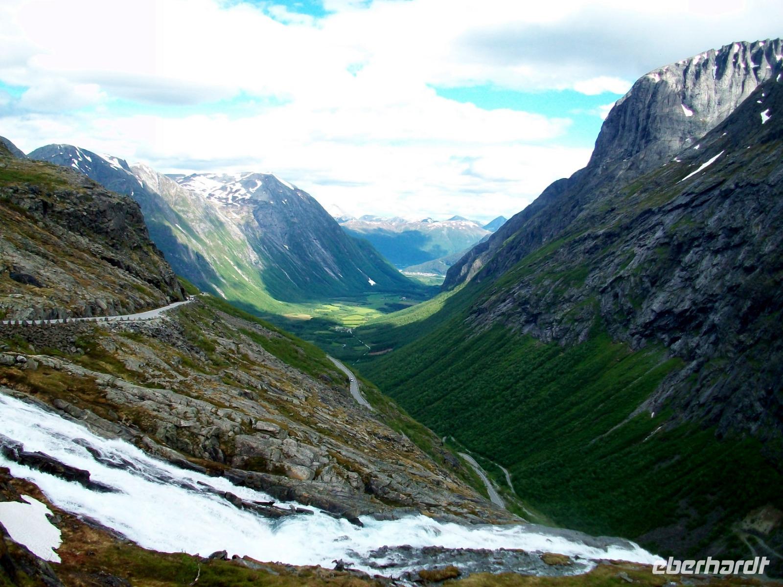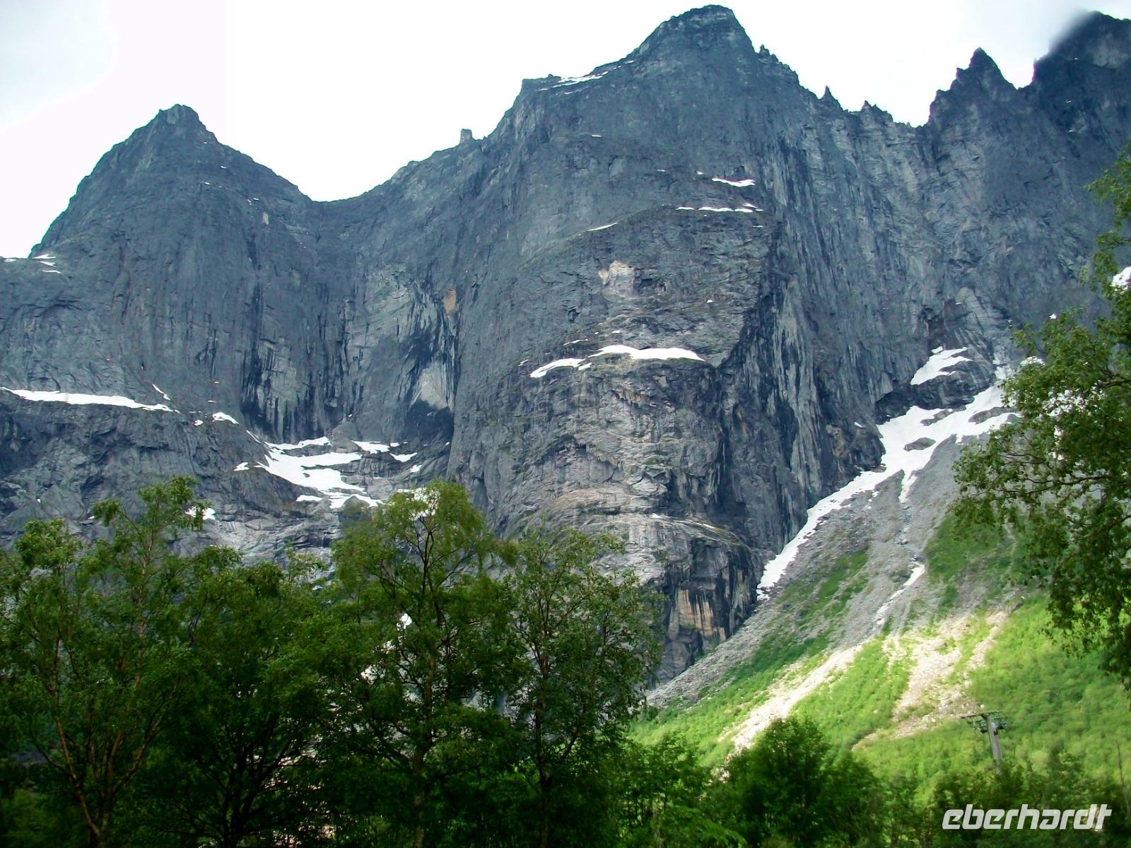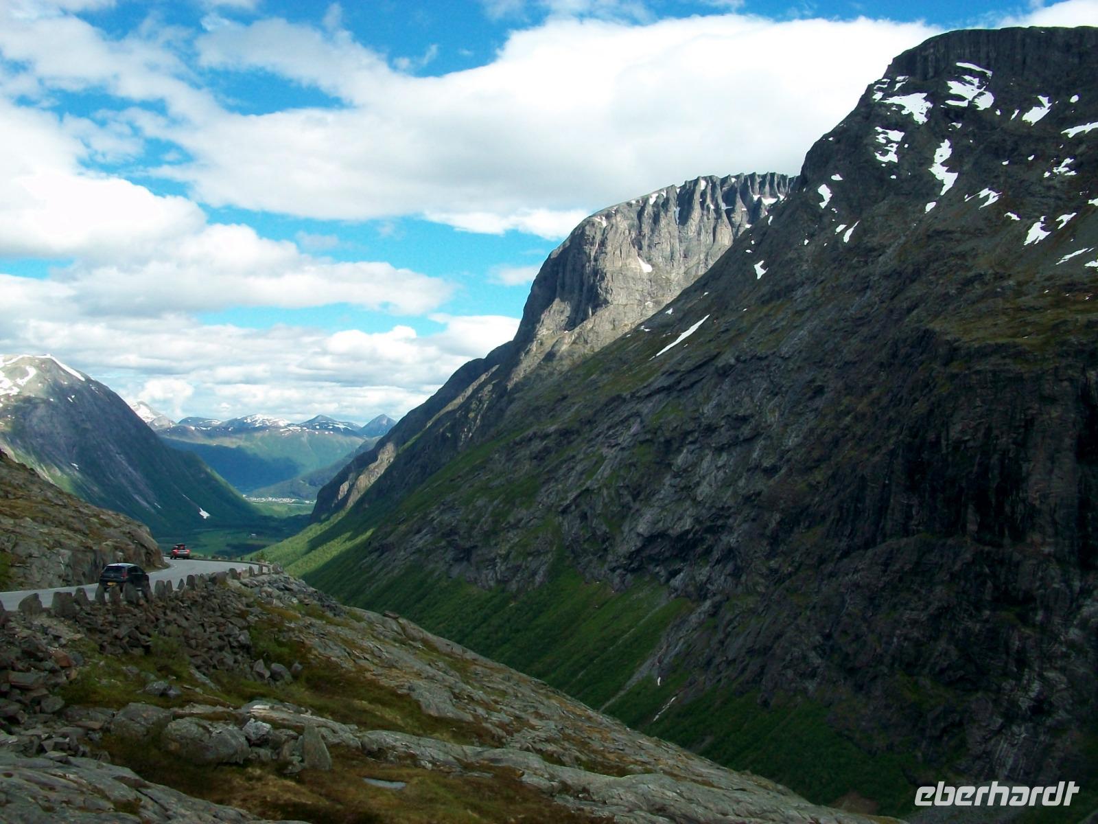 Bald kommen mächtige Berge in unser Blickfeld die immer näher an die Straße heranrücken, sehr beeindruckend ist hier die Trollwand die einen Kilometer senkrecht ansteigt.