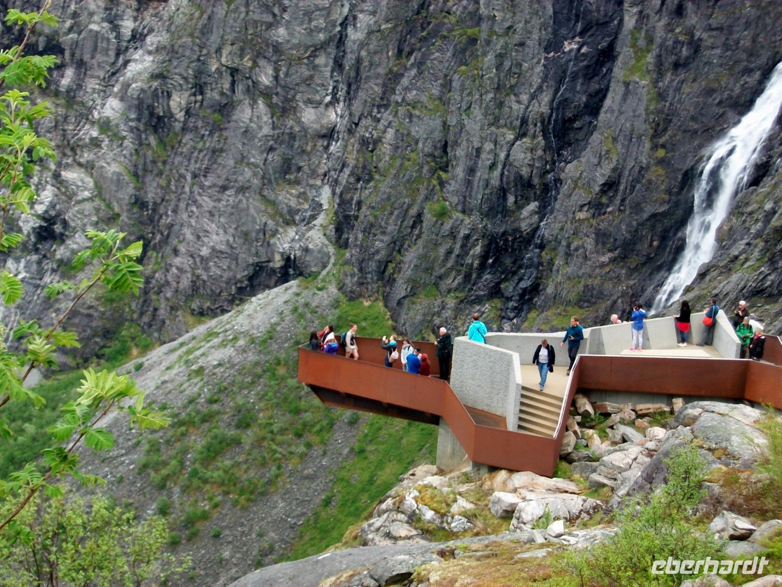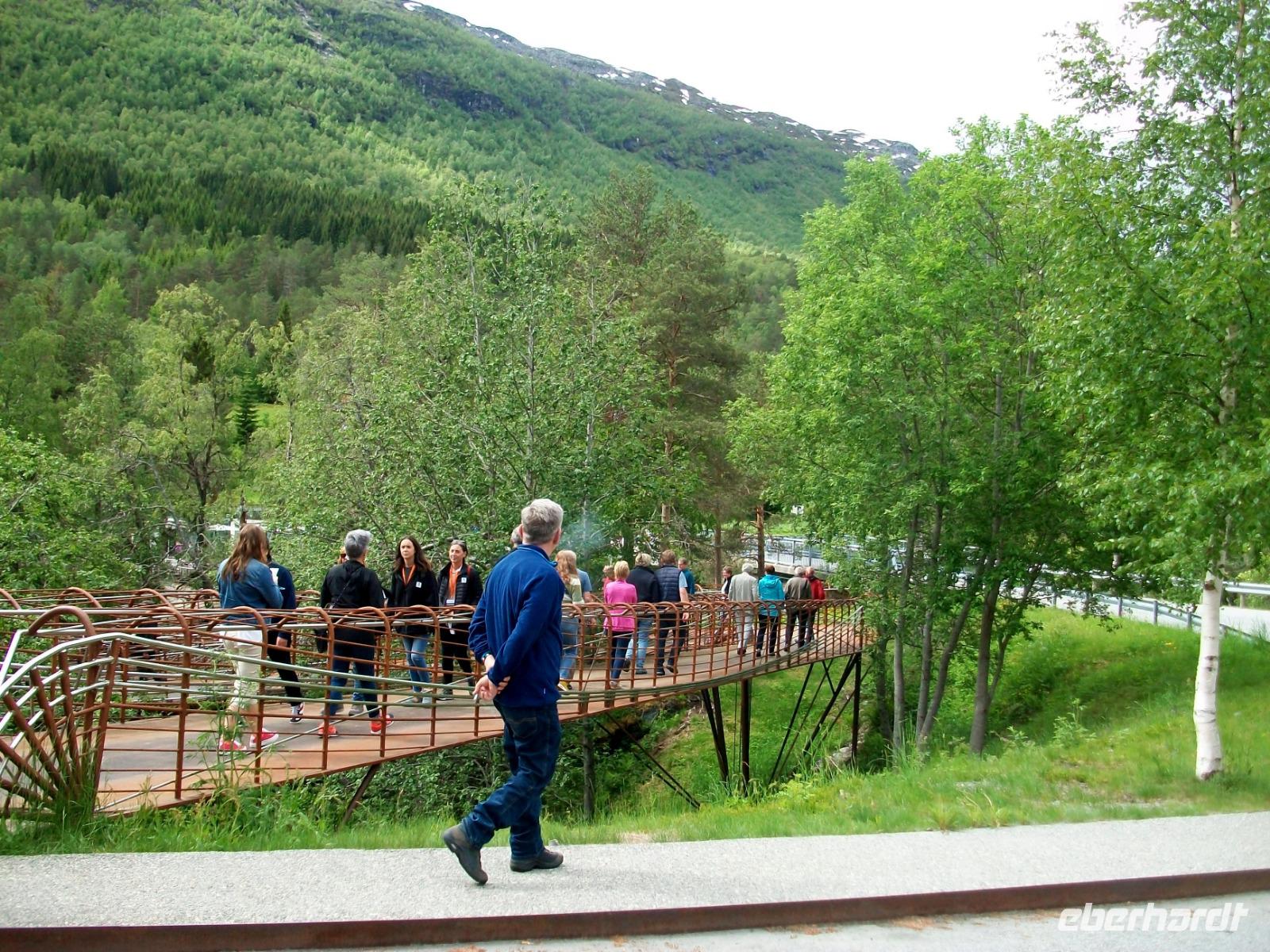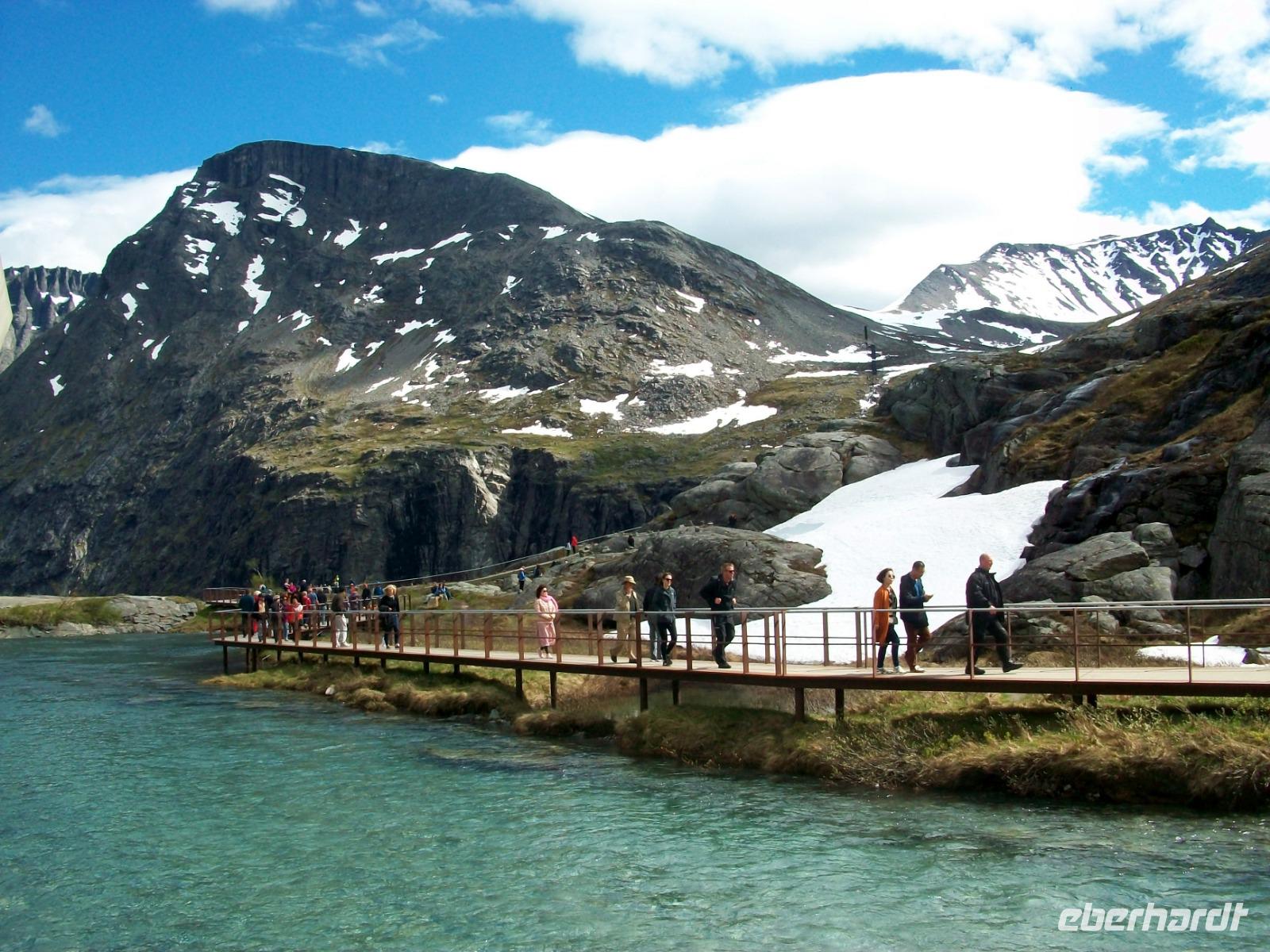 Weiter geht die Fahrt; am Talende sehen wir eine Serpentinenstraße in atemberaubenden Windungen hinauf führen - wir haben die sagenhaften Trollstigen erreicht. Hier sollen einst Riesentrolle mit gigantischen Leitern die Berge hinaufgeklettert sein, wir nehmen unseren Bus.