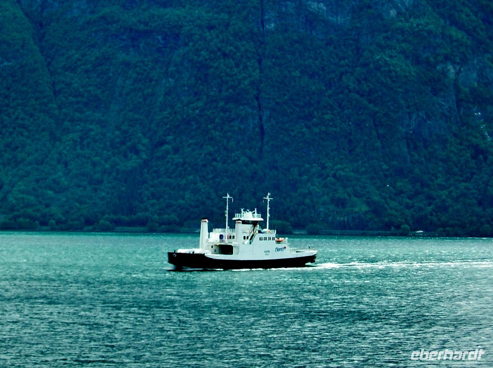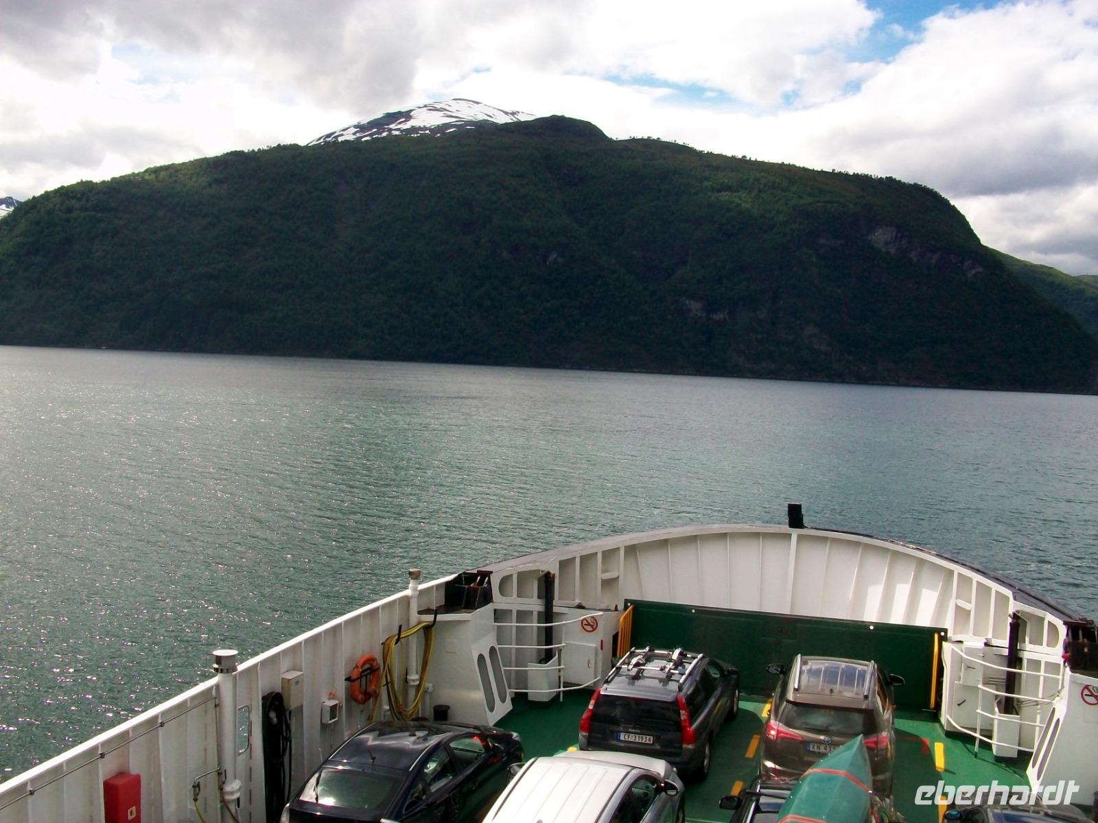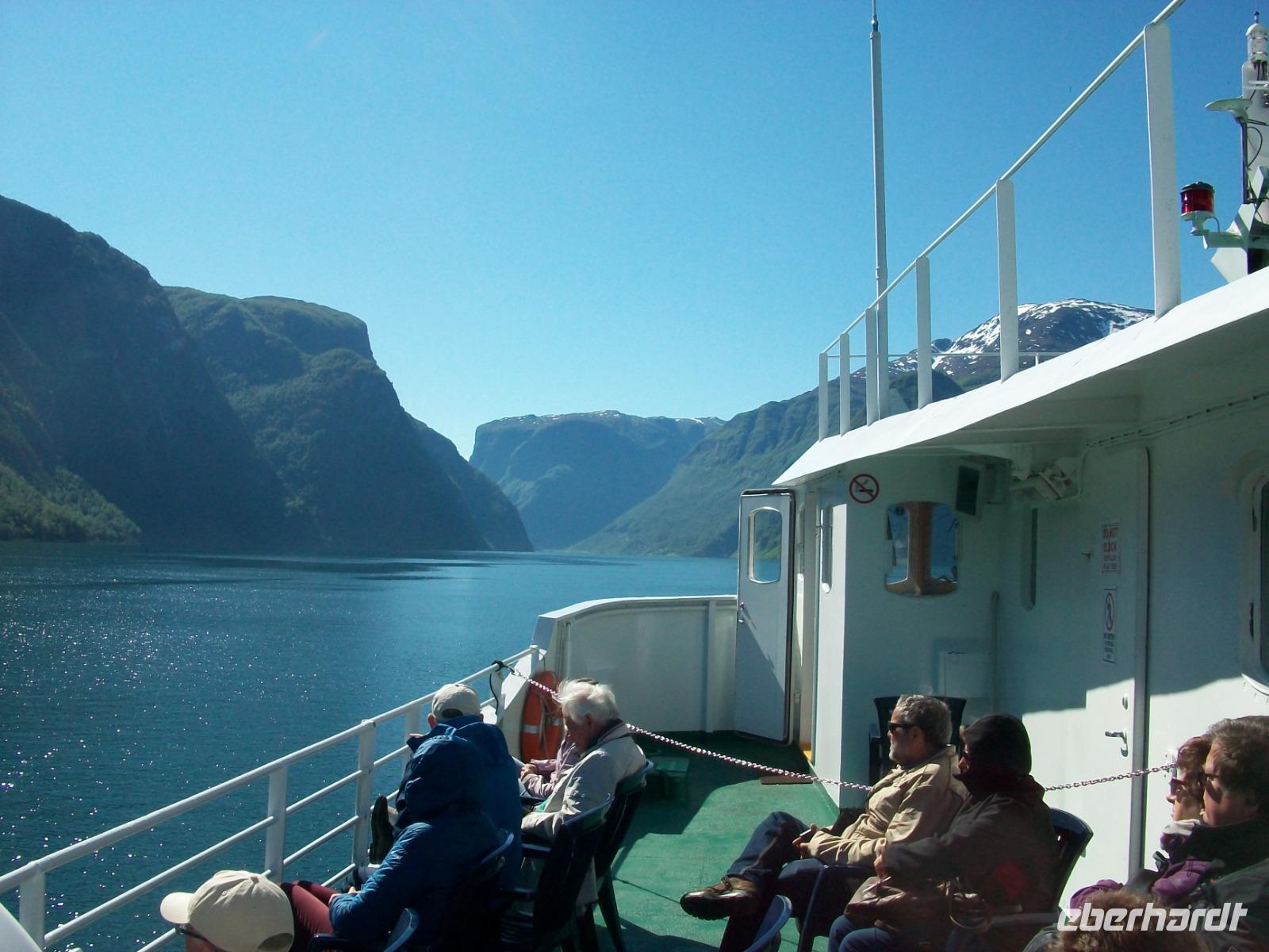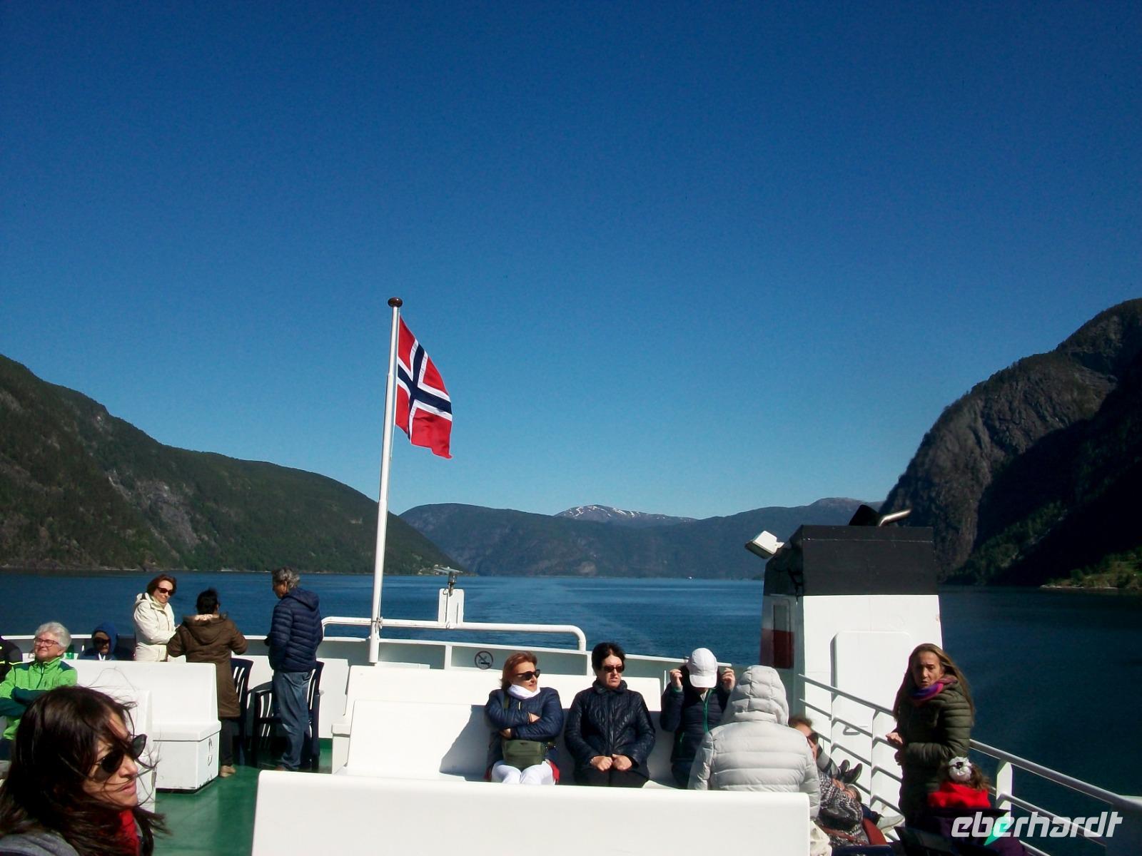 Beim Ort Kaupanger schließlich besteigen wir das Schiff welches uns die nächsten knapp zwei Stunden über eine faszinierende Fjordlandschaft bringen wird. Die Eindrücke vom Wasser sind besonders schön. Begrünte Berge steigen an und oben an den Spitzen sehen wir auch hier noch Schneereste.