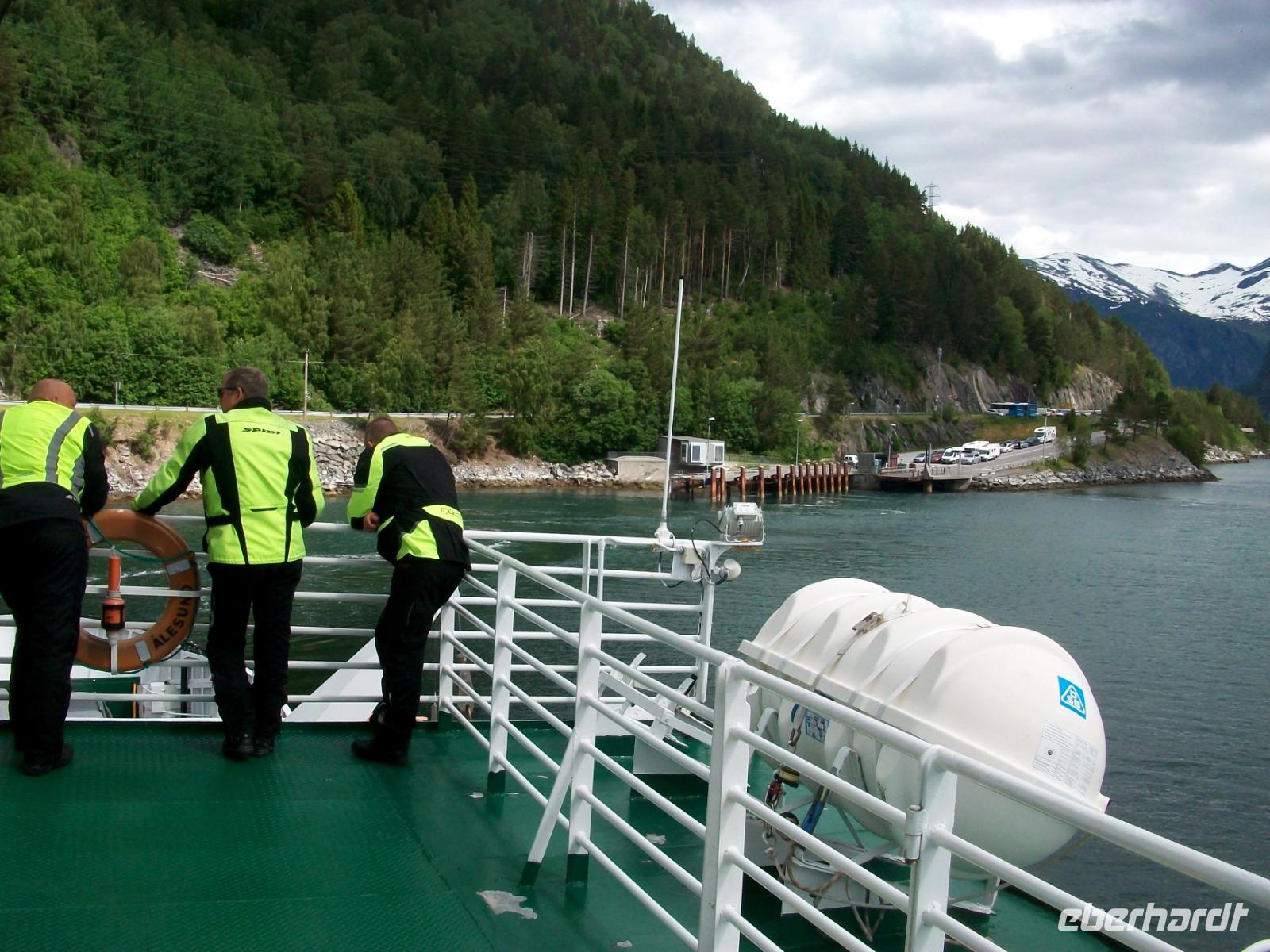 Ein schönes Stück Weg liegt nun noch vor uns; aus der kahlen Bergwelt gelangen wir wieder ins üppige Grün des Frühlings und beim Ort Linge überqueren wir mit der Fähre einen Fjord.