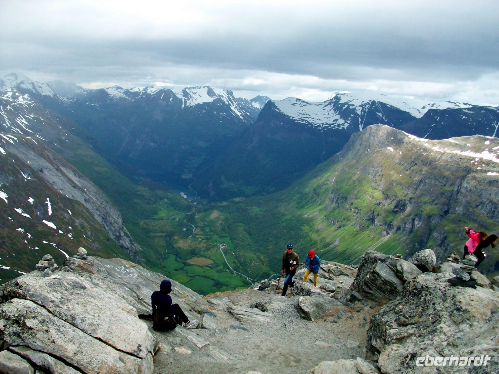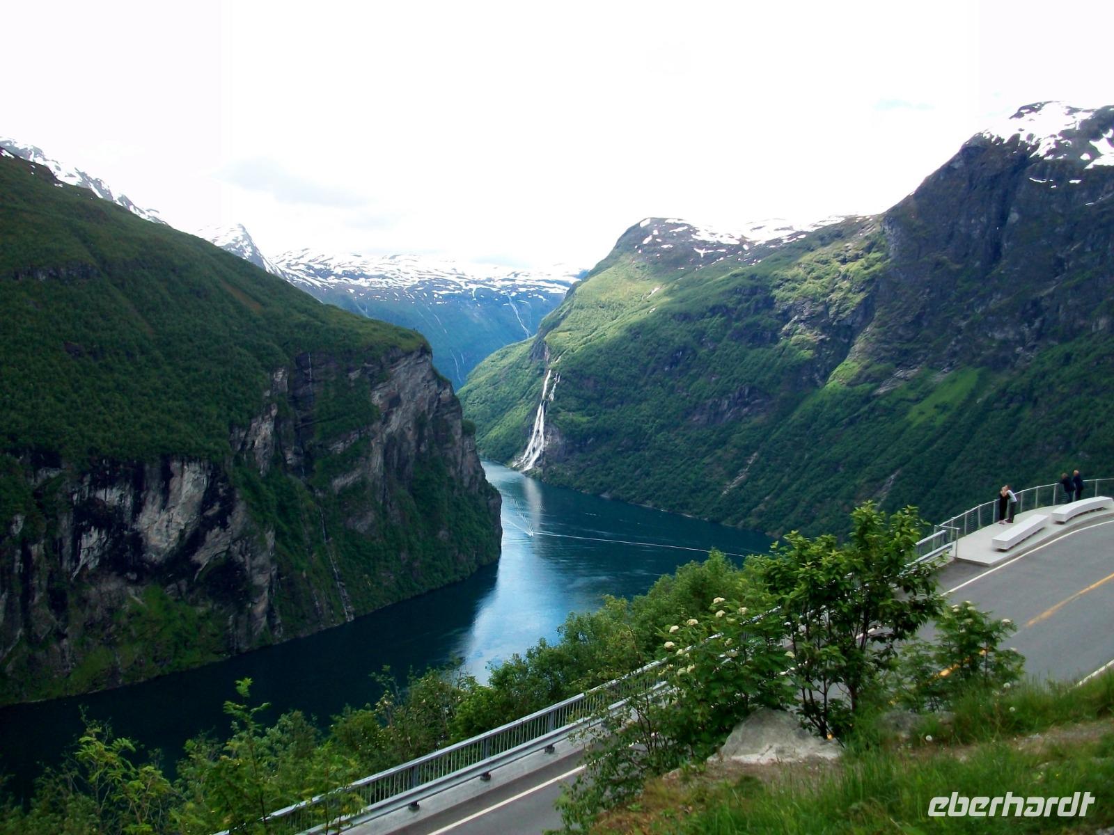 Drüben angelangt geht es nun wieder aufwärts um kurz vor unserem Ziel die berühmte Adlerstraße zu erreichen. Ganz von oben haben wir einen malerischen Blick auf den Geirangefjord und sehen von hier schon einige der Wasserfälle an denen wir morgen vorbei fahren werden.
