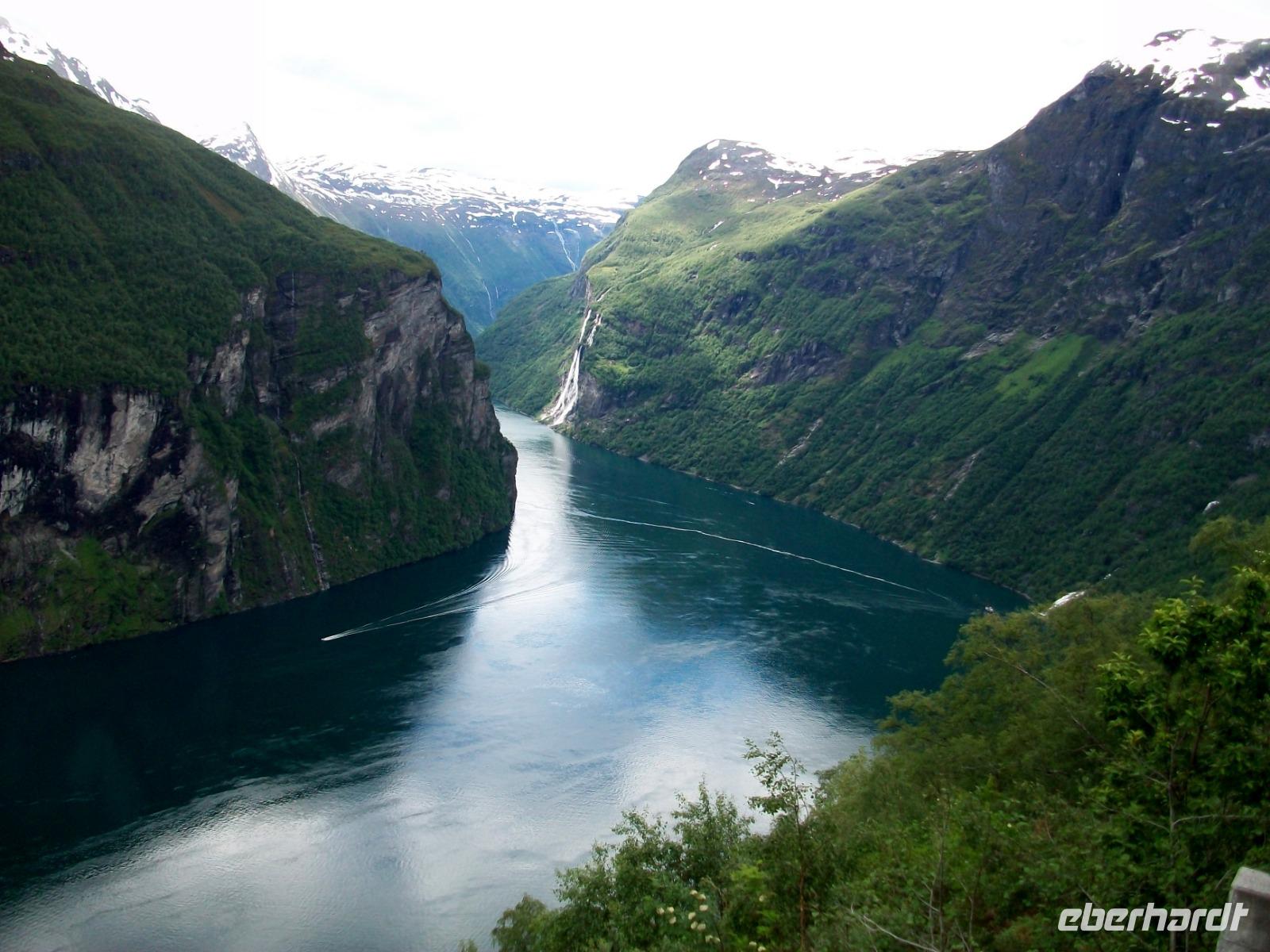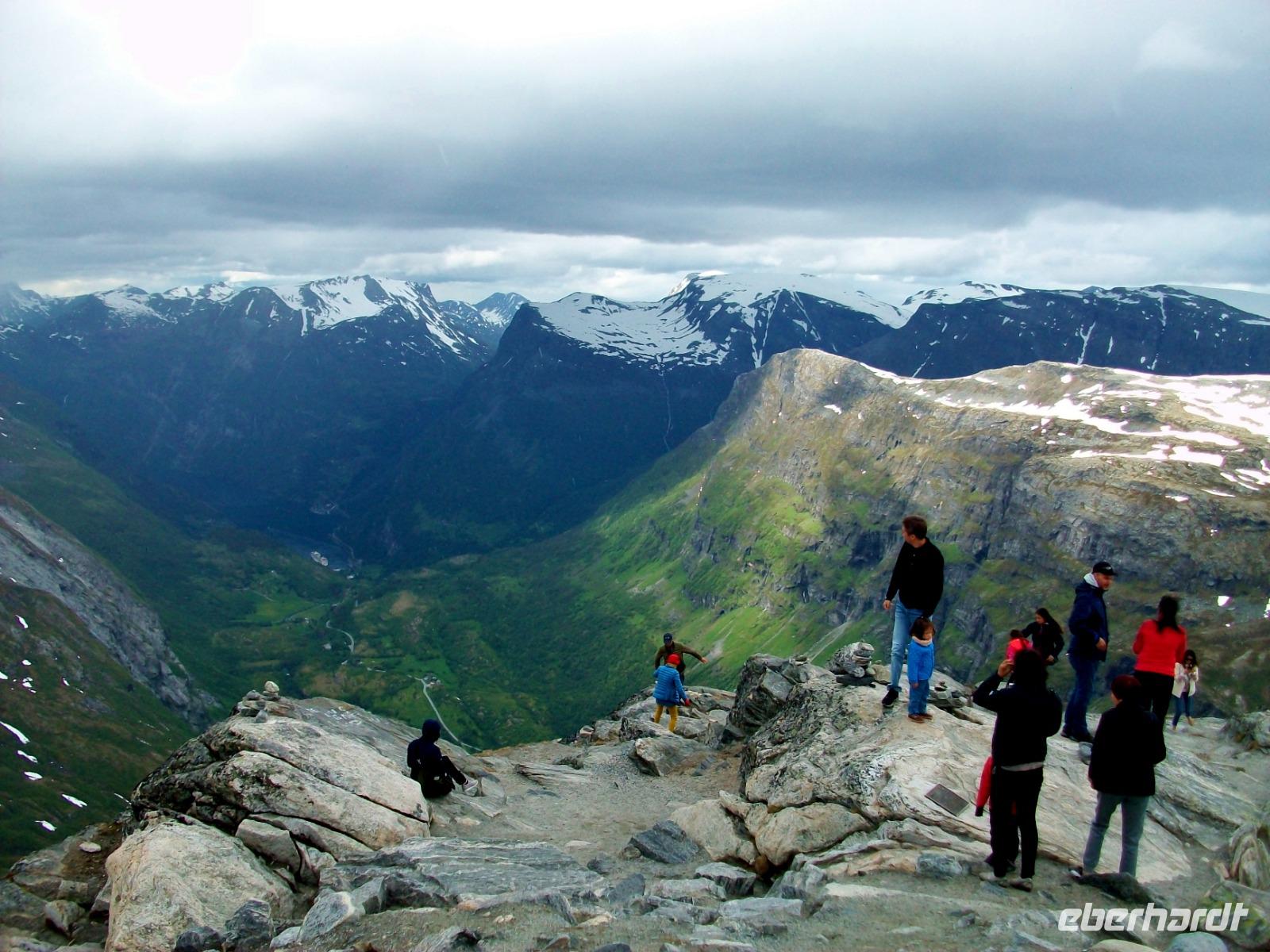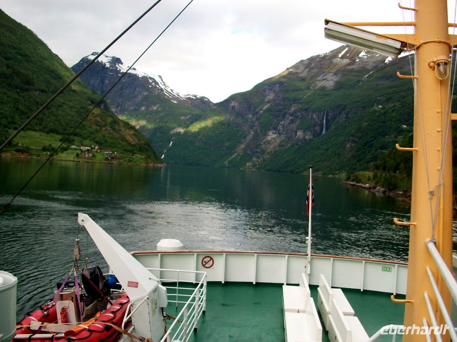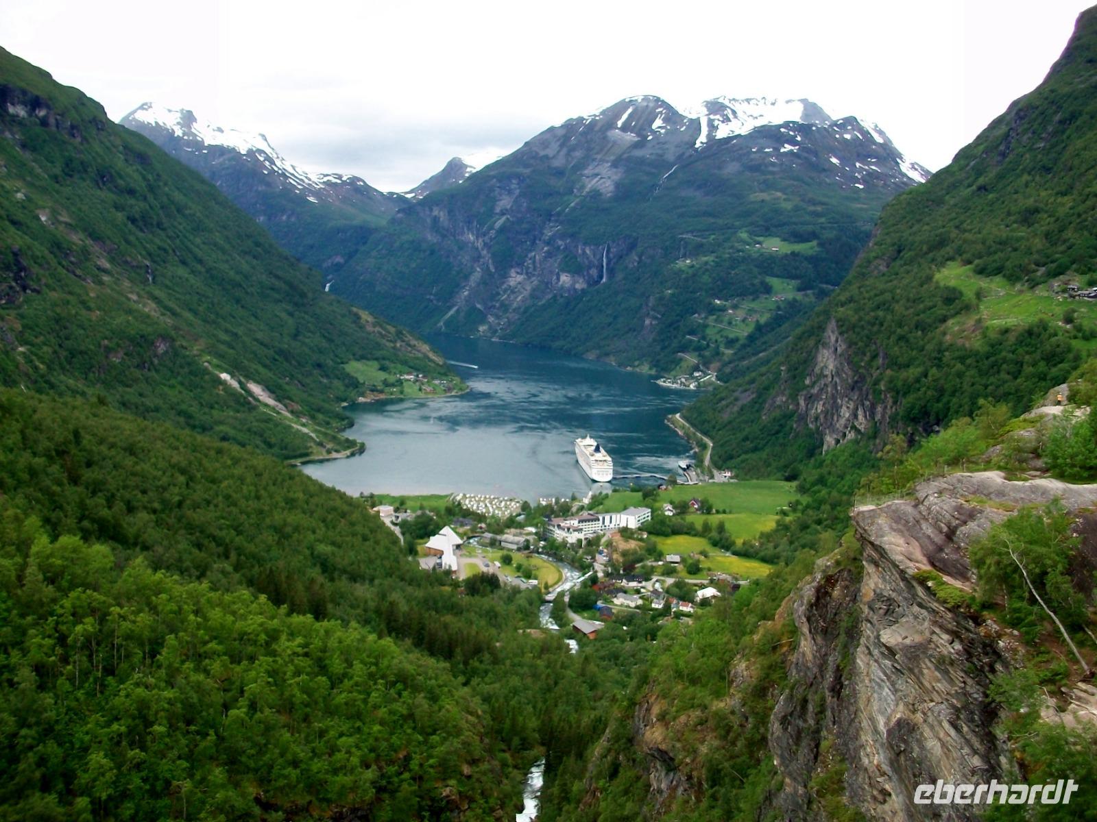 Als wir dann an unserem Hotel im Ort Geiranger erreichen, verliert Petrus seine gute Laune und lässt es regnen, das stört uns nun aber nicht mehr! Bei einem gemütlichen Spaziergang nach dem Diner direkt am Fjord, lugt dann schon wieder die Sonne zwischen den Wolken hervor.