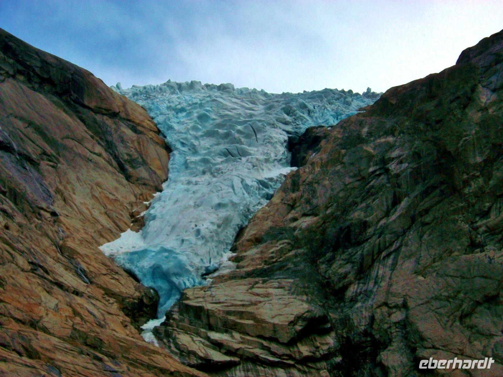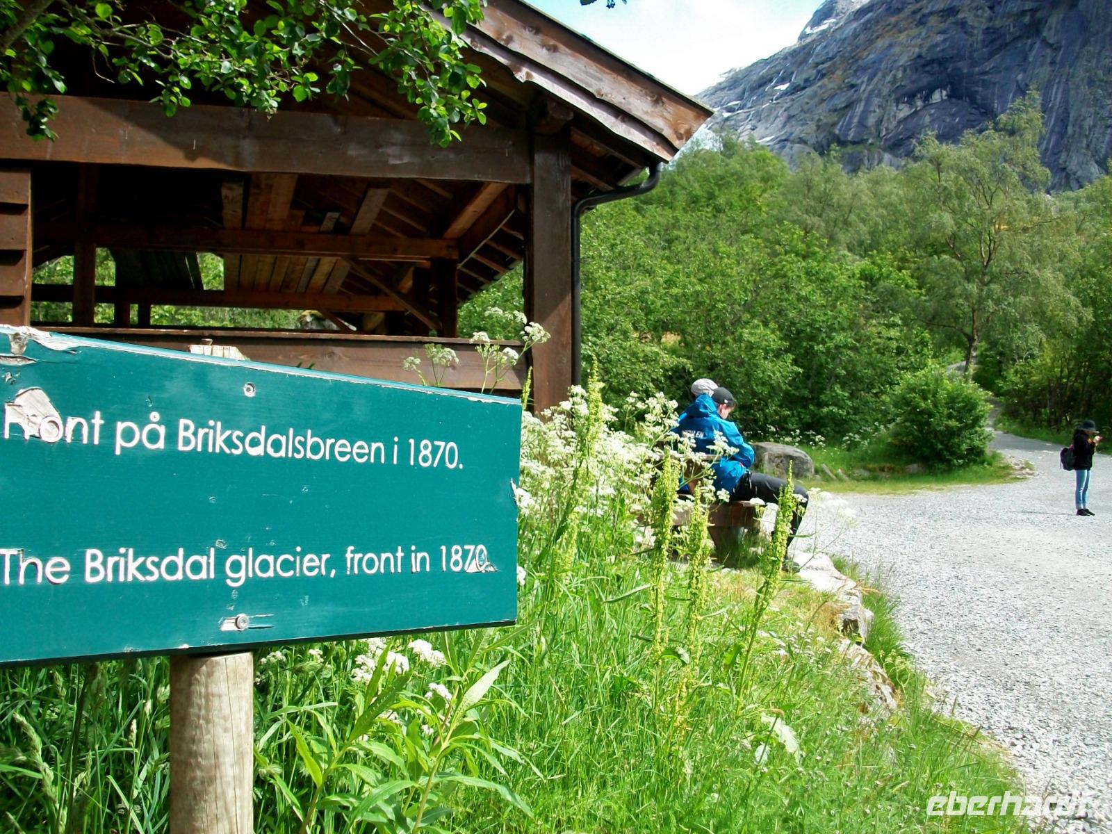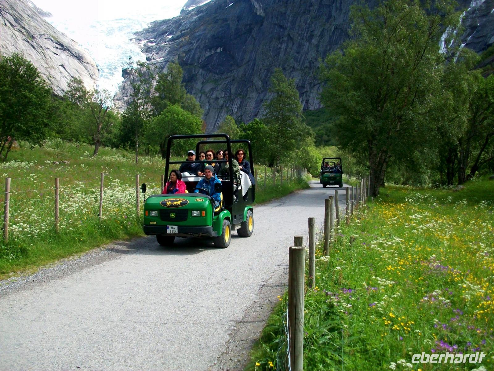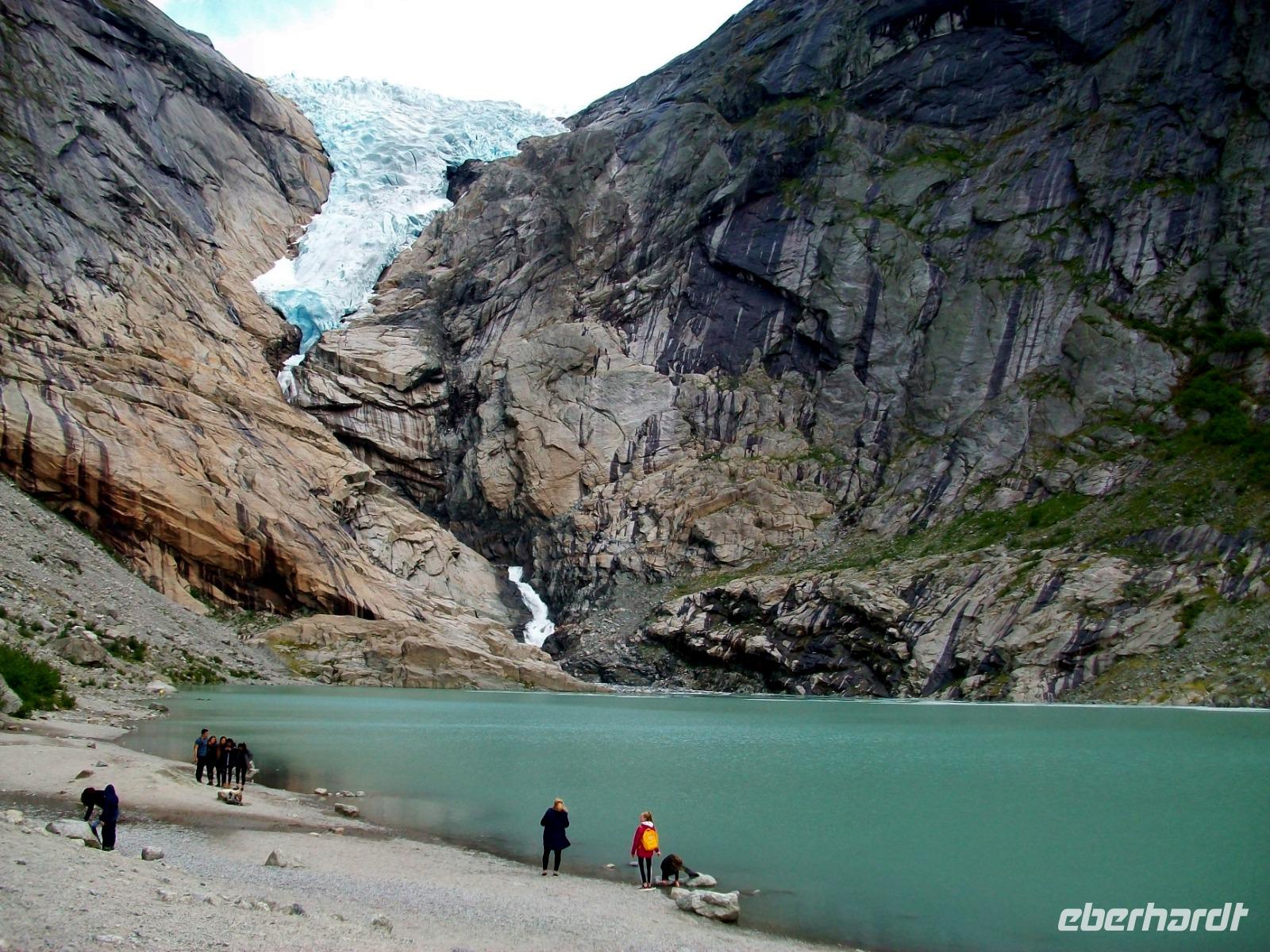 Norwegen ist reich an Gletschern und einer der berühmtesten ist der Brikdalsbreen, ihn wollen wir nun besuchen. Unterhalb parken wir den Bus und nun beginnt der Aufstieg. Zwischen grünen Wiesen mit bunten Blumen schlängelt sich ein Fluss, an einer Steilstelle einen Wasserfall bildend; das sind Impressionen die man nicht vergisst! Dann sind wir oben angelangt und der Blick wird frei auf einen Gletschersee und oberhalb, blau in der Sonne schimmernd, ist das Eis des Brikdalsbreen zu sehen - faszinierend! Wunderbare, unberührte Natur, man möchte hier ewig bleiben! Aber wir haben noch eine ordentliche Strecke bis zu unserem heutigen Ziel zurückzulegen.