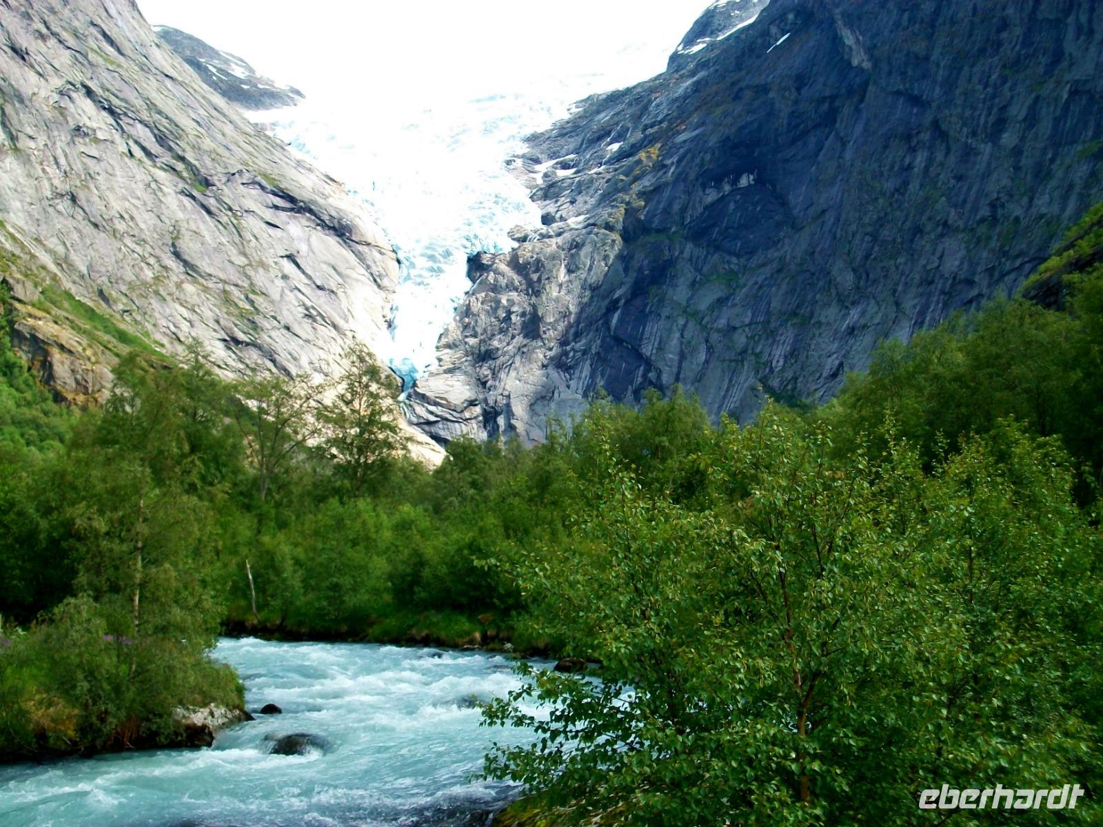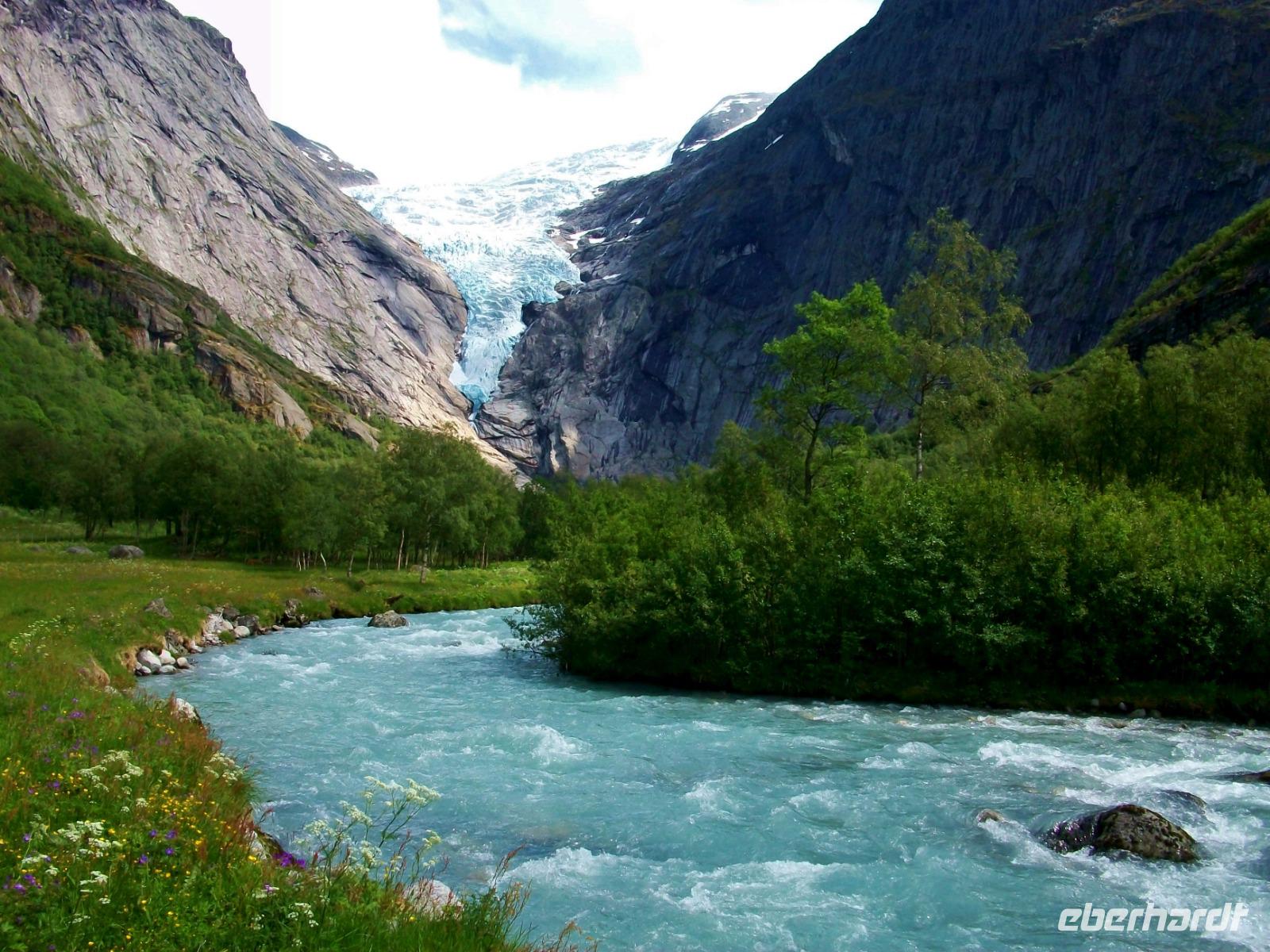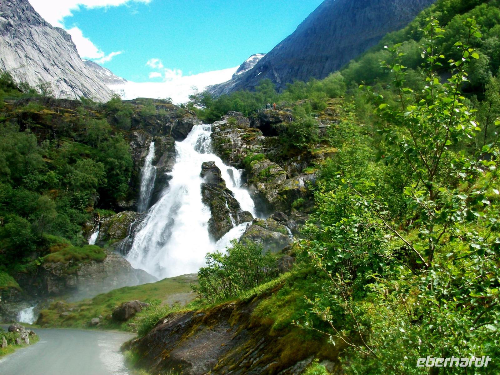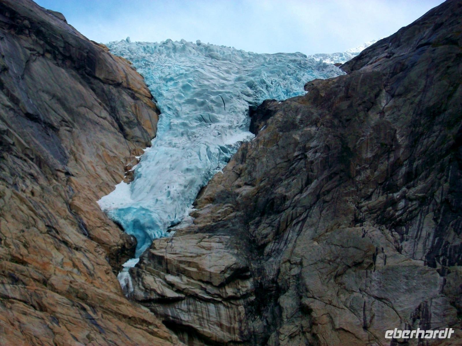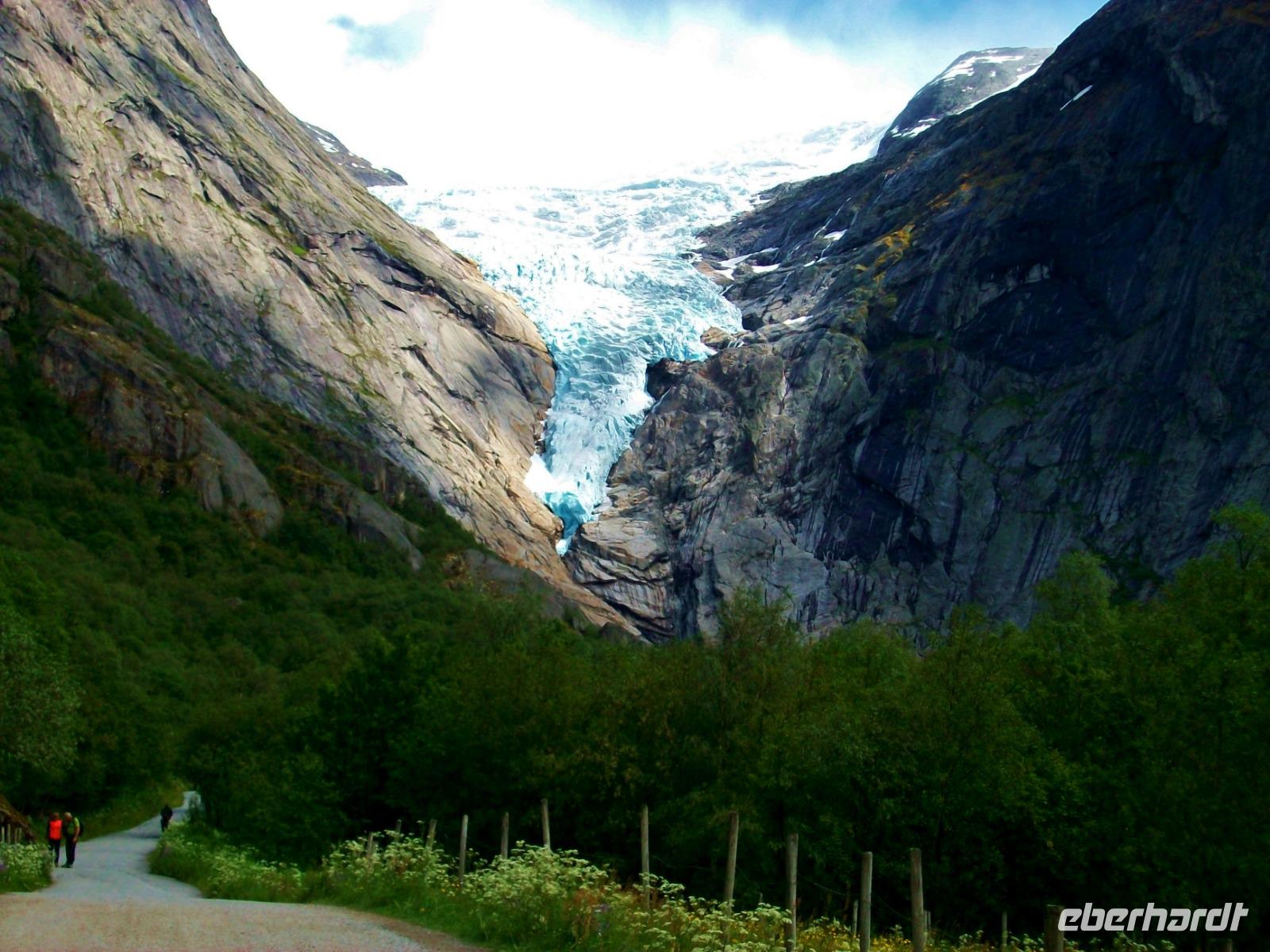 Norwegen ist reich an Gletschern und einer der berühmtesten ist der Brikdalsbreen, ihn wollen wir nun besuchen. Unterhalb parken wir den Bus und nun beginnt der Aufstieg. Zwischen grünen Wiesen mit bunten Blumen schlängelt sich ein Fluss, an einer Steilstelle einen Wasserfall bildend; das sind Impressionen die man nicht vergisst! Dann sind wir oben angelangt und der Blick wird frei auf einen Gletschersee und oberhalb, blau in der Sonne schimmernd, ist das Eis des Brikdalsbreen zu sehen - faszinierend! Wunderbare, unberührte Natur, man möchte hier ewig bleiben! Aber wir haben noch eine ordentliche Strecke bis zu unserem heutigen Ziel zurückzulegen.