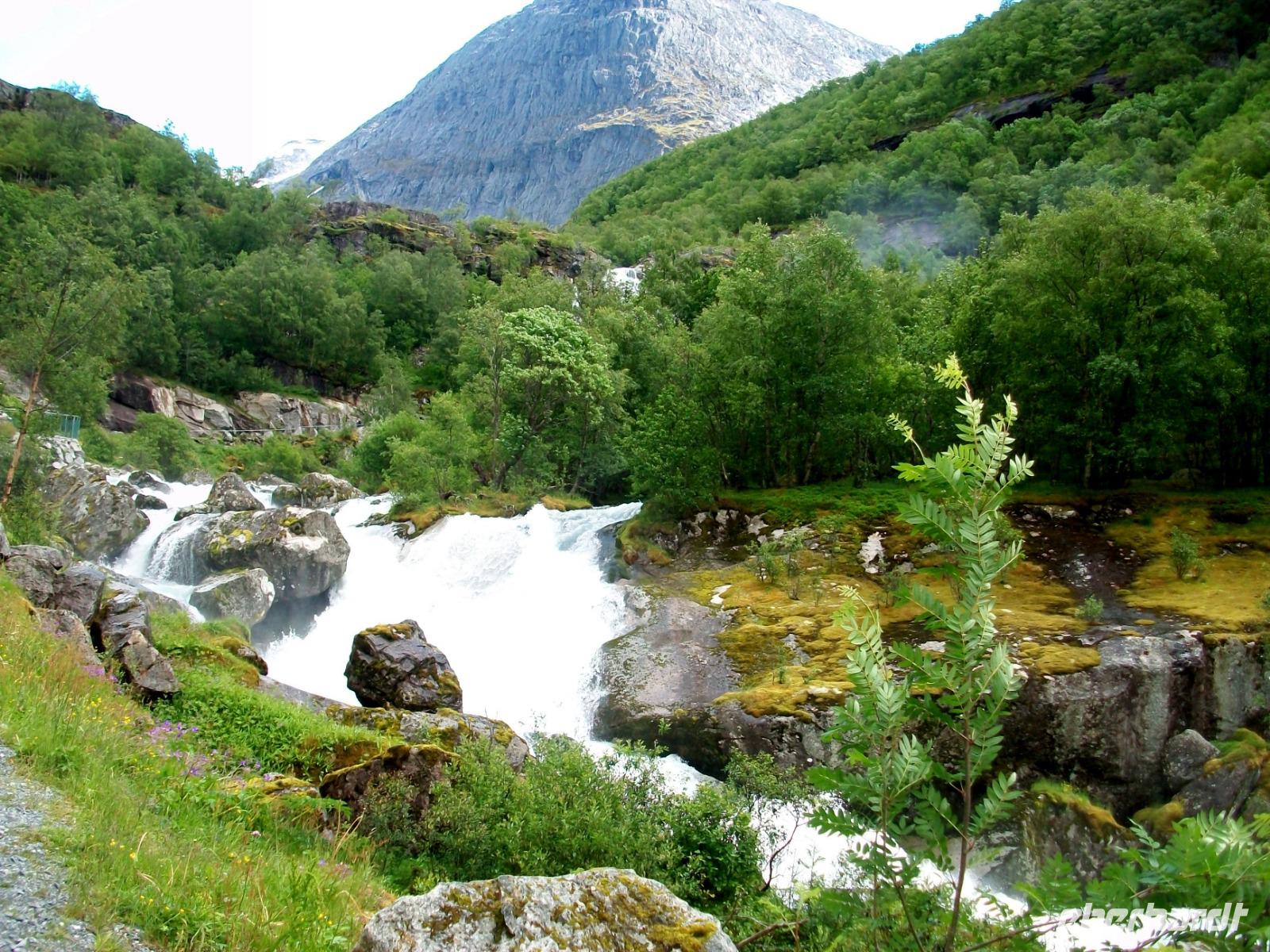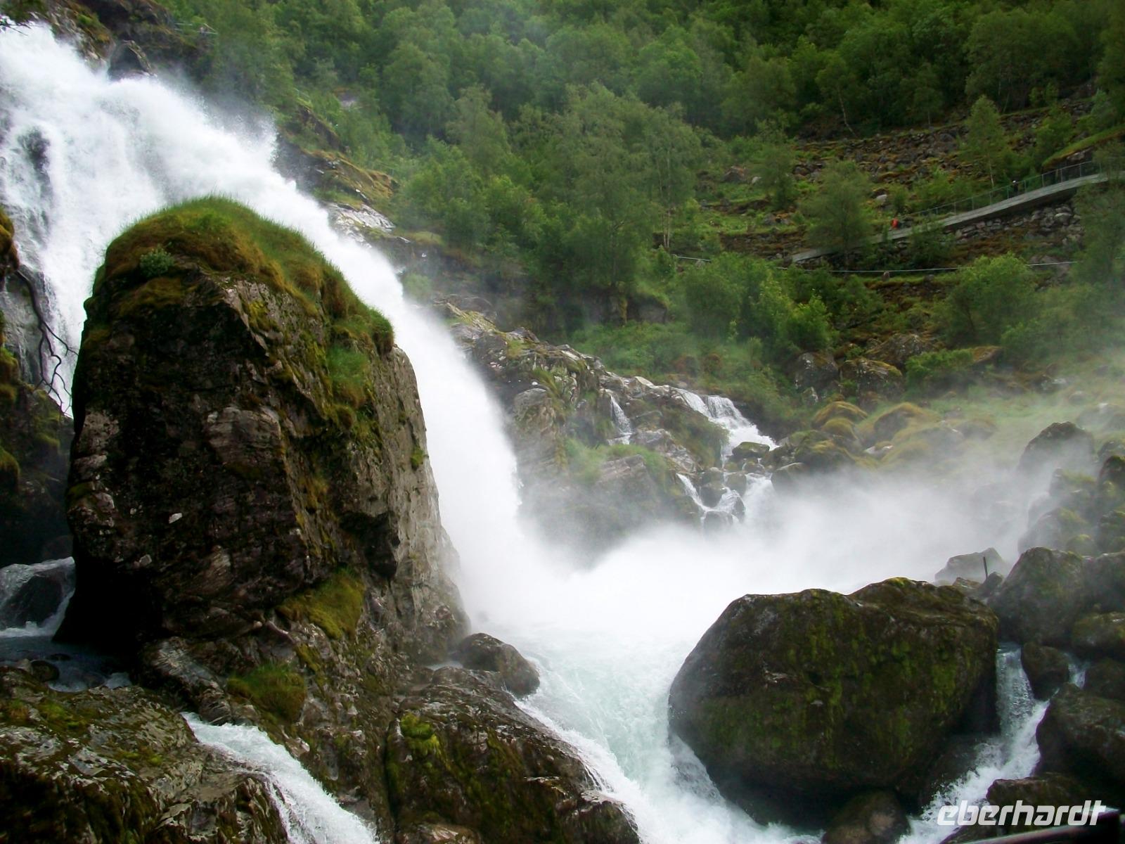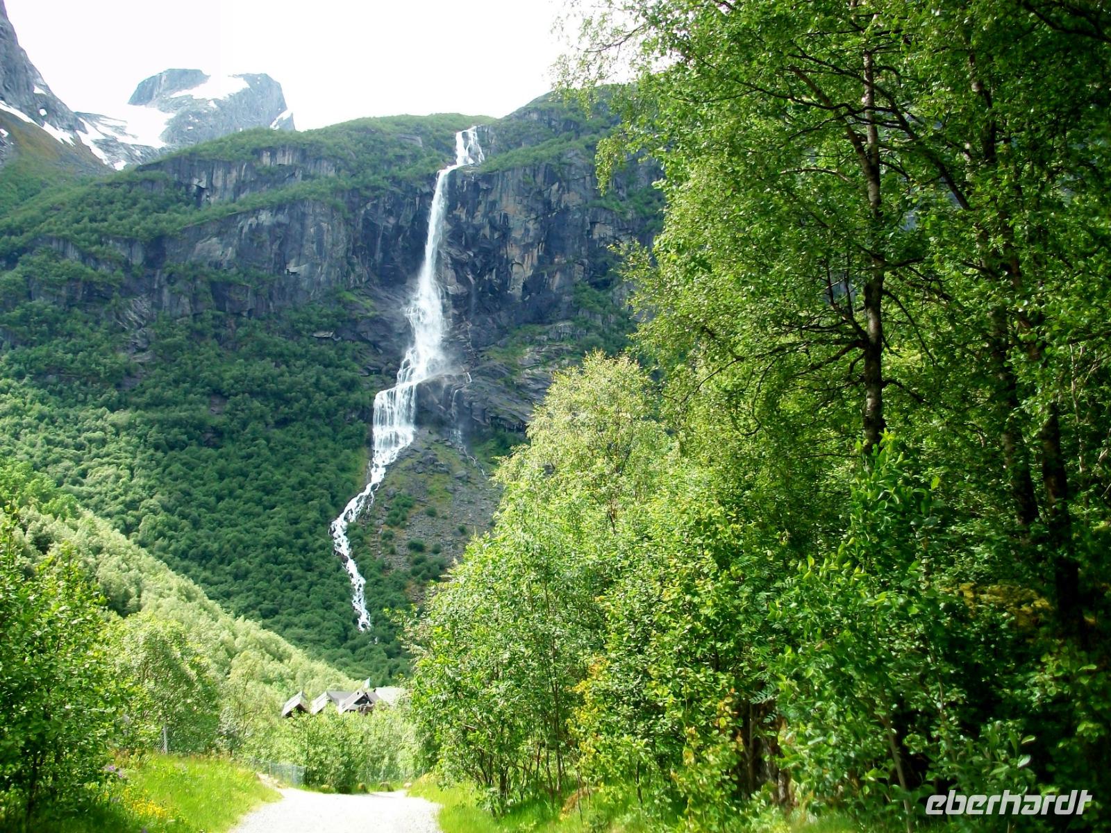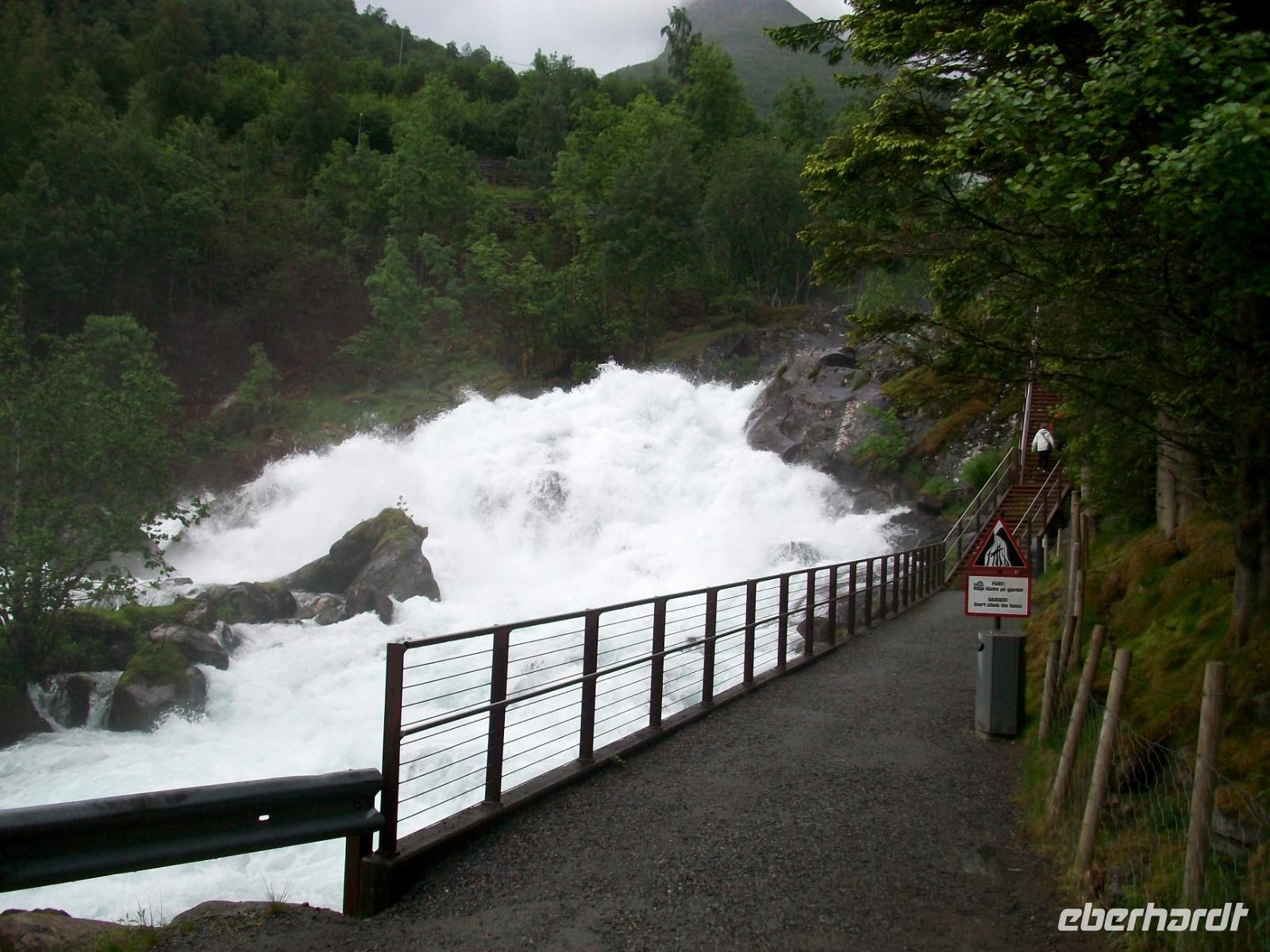 Norwegen ist reich an Gletschern und einer der berühmtesten ist der Brikdalsbreen, ihn wollen wir nun besuchen. Unterhalb parken wir den Bus und nun beginnt der Aufstieg. Zwischen grünen Wiesen mit bunten Blumen schlängelt sich ein Fluss, an einer Steilstelle einen Wasserfall bildend; das sind Impressionen die man nicht vergisst! Dann sind wir oben angelangt und der Blick wird frei auf einen Gletschersee und oberhalb, blau in der Sonne schimmernd, ist das Eis des Brikdalsbreen zu sehen - faszinierend! Wunderbare, unberührte Natur, man möchte hier ewig bleiben! Aber wir haben noch eine ordentliche Strecke bis zu unserem heutigen Ziel zurückzulegen.