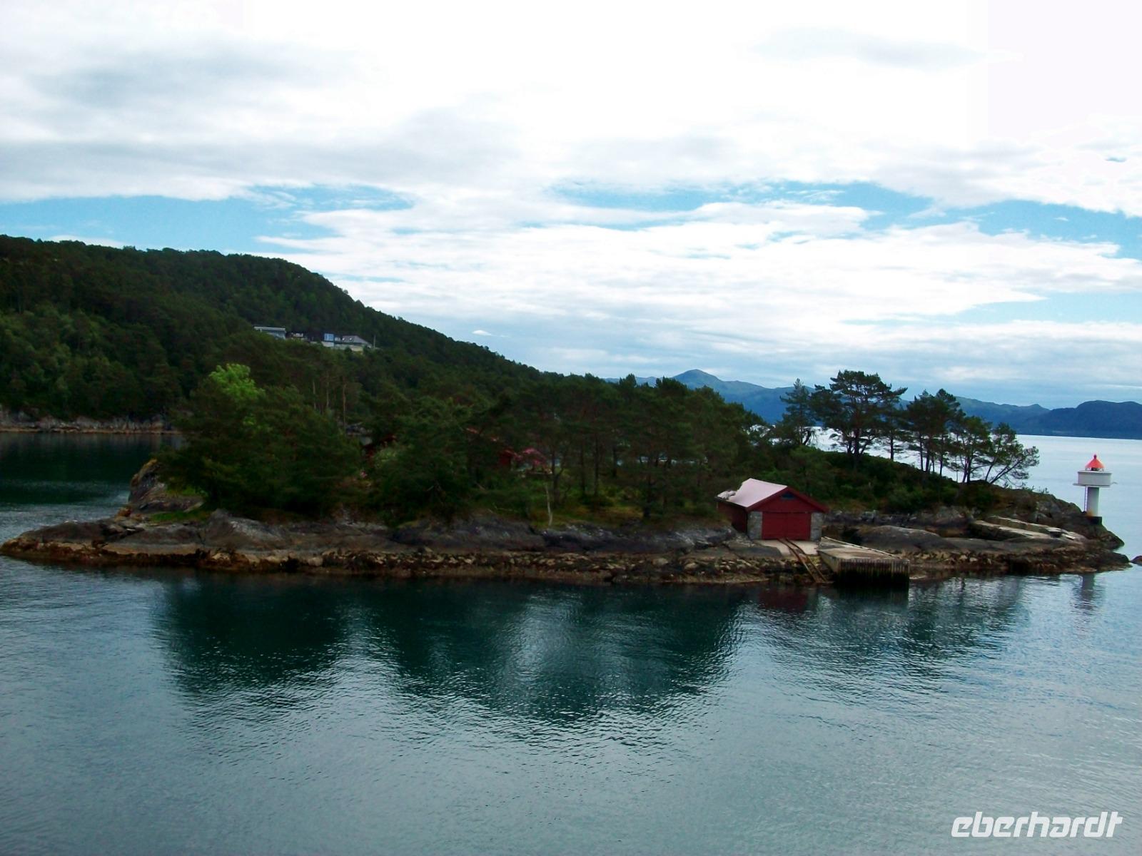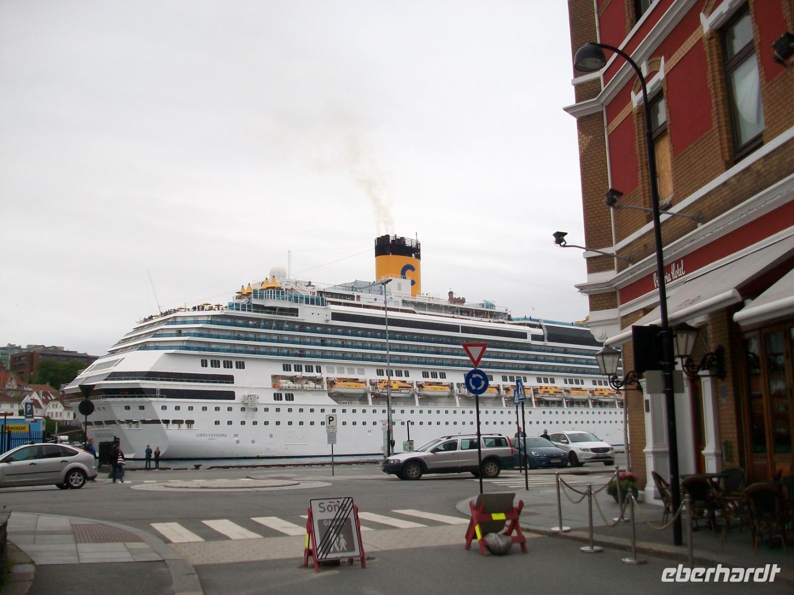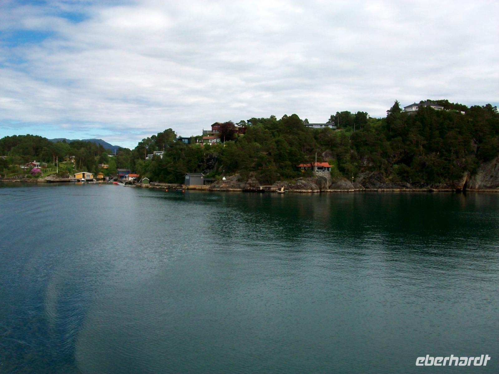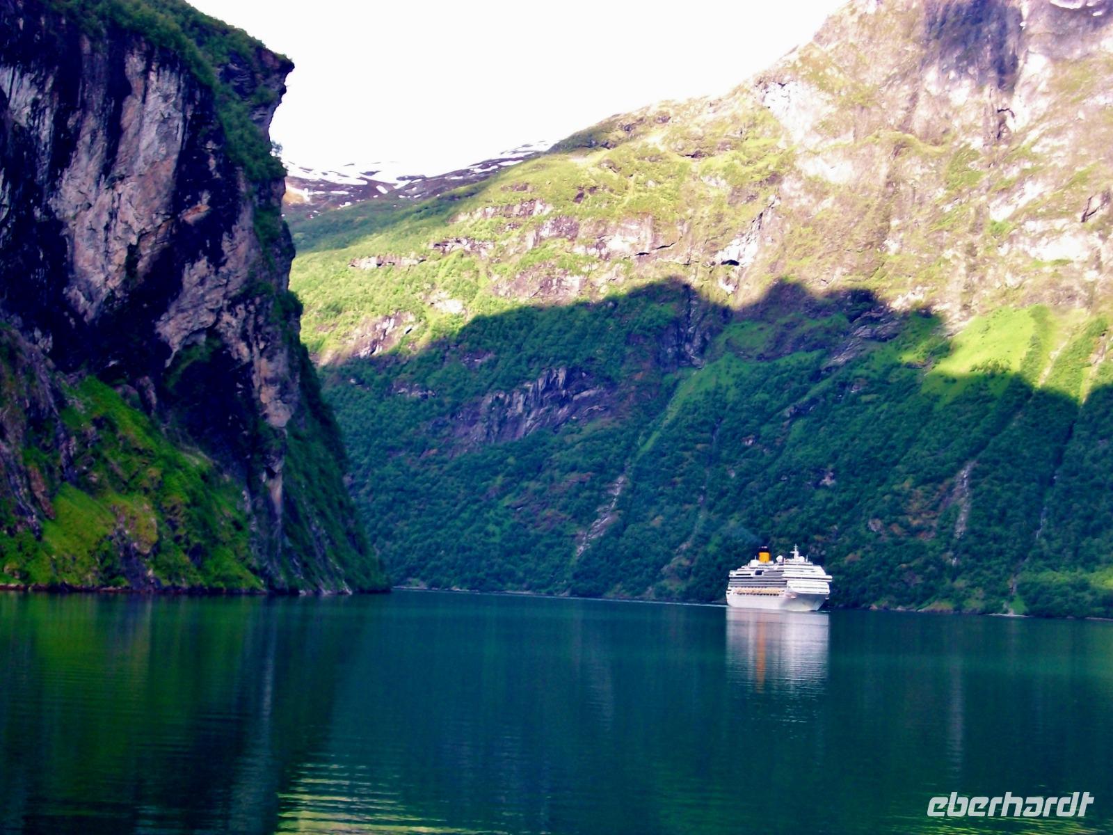 Eben hat ein Kreuzfahrschiff abgelegt, es nimmt seinen Kurs den Fjord entlang.