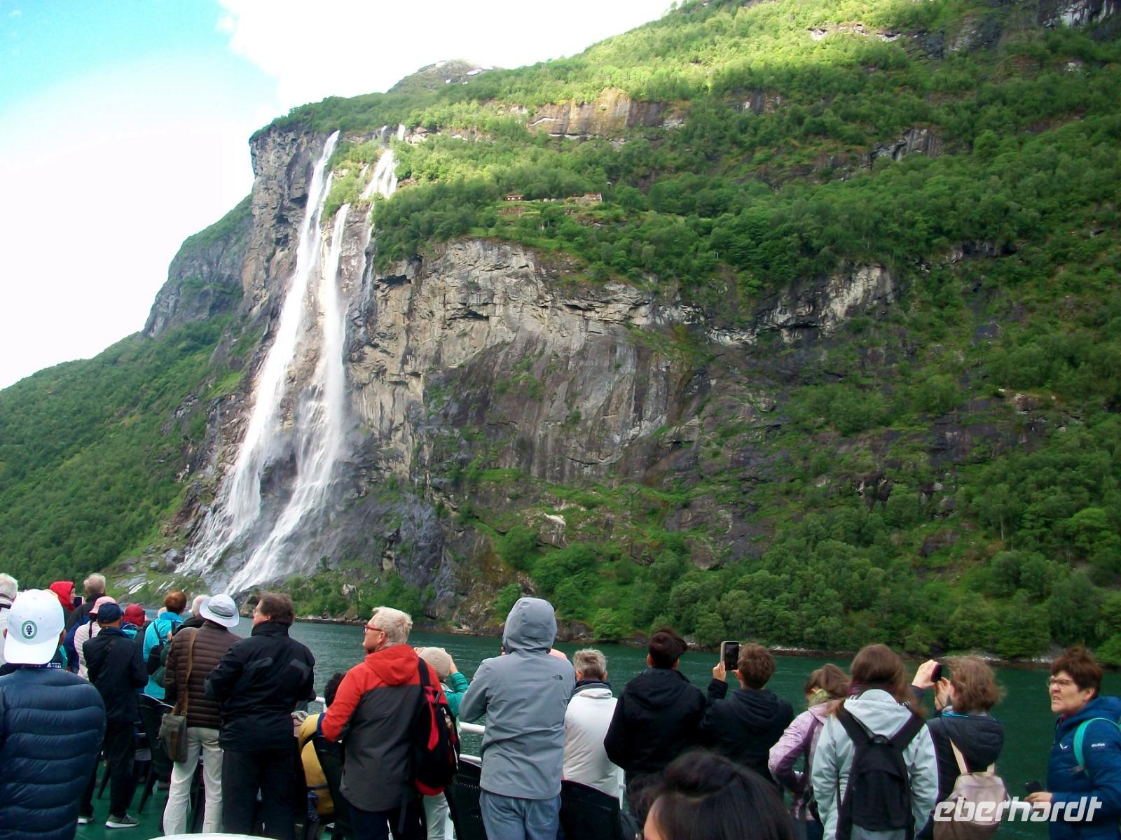 10.6.2019. Tief eingeschnitten liegt der Geirangerfjord vor uns. Fast senkrecht steigen die steilen Wände himmelan und donnernd fällt das Wasser von den hohen Bergen herab während wir mit unserem Schiff unsere Bahn nehmen. Wir müssen schon den Kopf in den Nacken legen um bis ganz hinauf schauen zu können und kommen uns aufgrund der gigantischen Kulisse klein und zerbrechlich vor. Diese schöne Kreuzfahrt dauert eine gute Stunde und das Auge mag sich gar nicht satt sehen an diesen Wundern der Natur. In Hellesylt endet die Überfahrt, unser Bus war mit an Bord und mit ihm gelangen wir nun wieder über die Straßen und vorbei an den grandiosen Landschaften Norwegens.