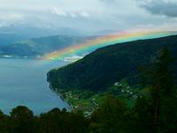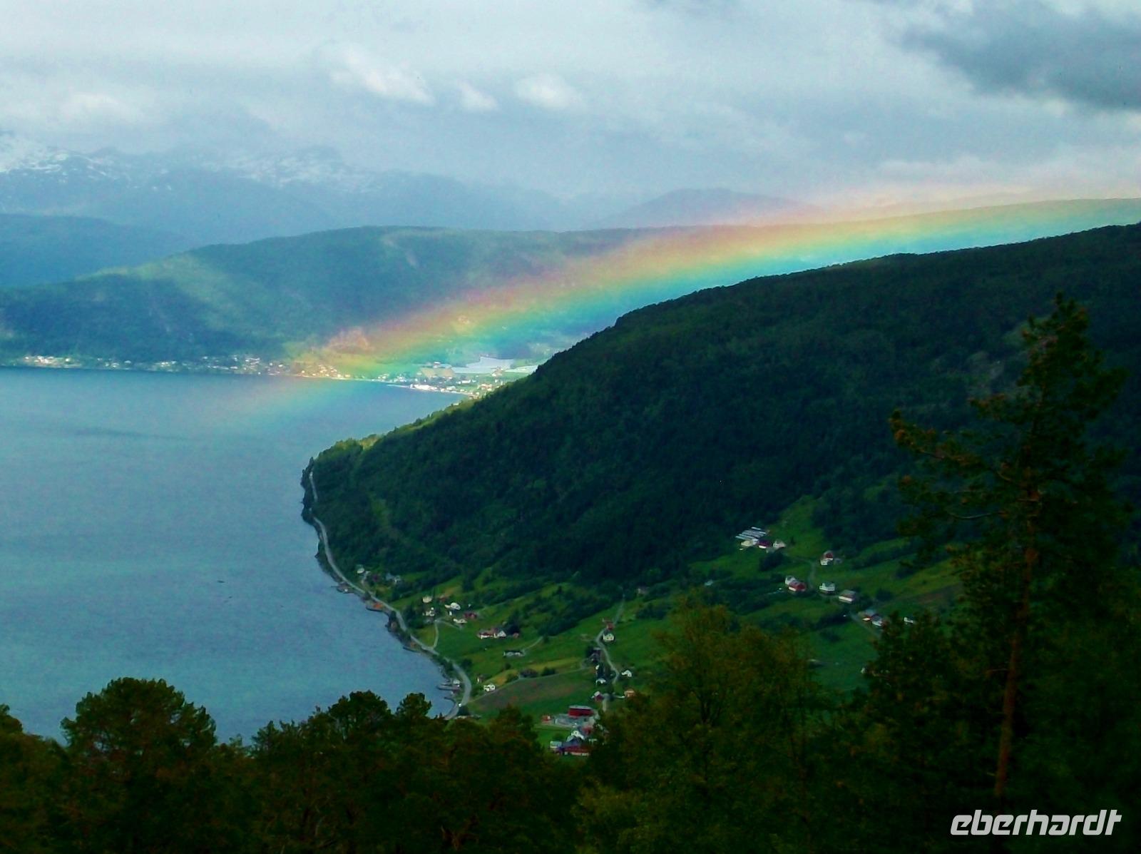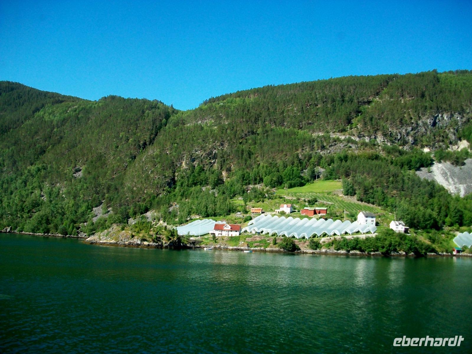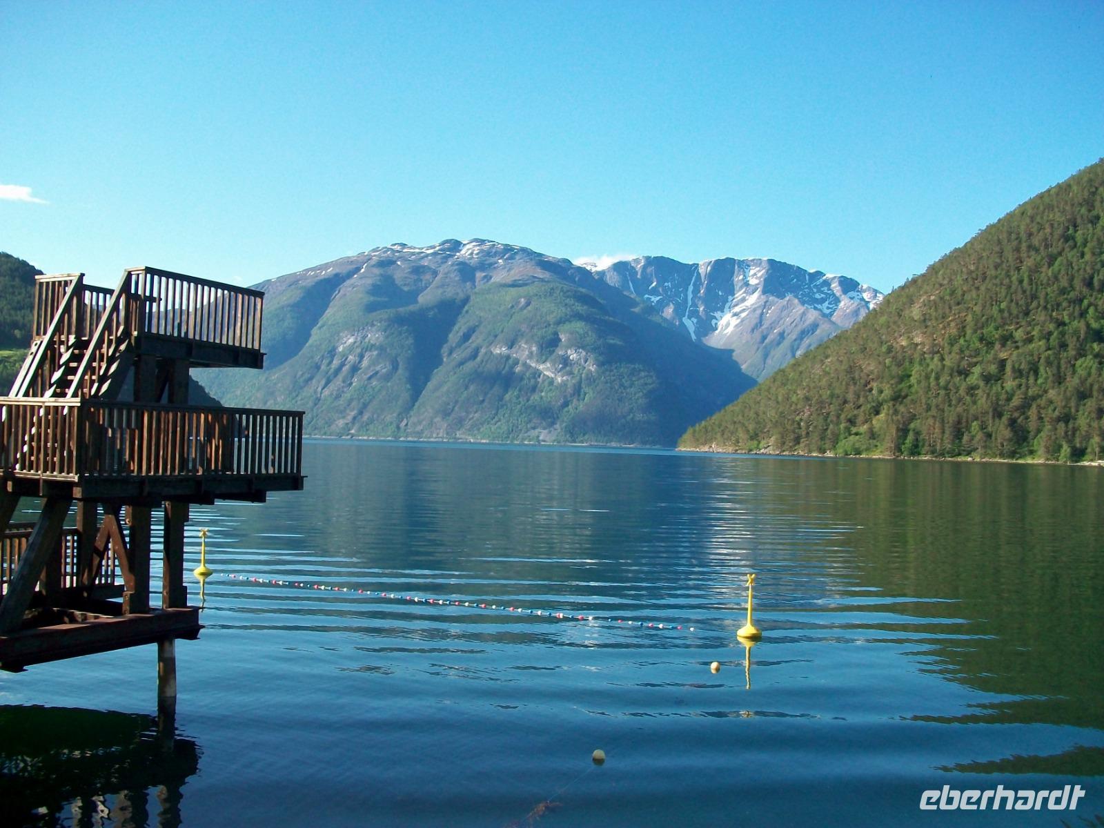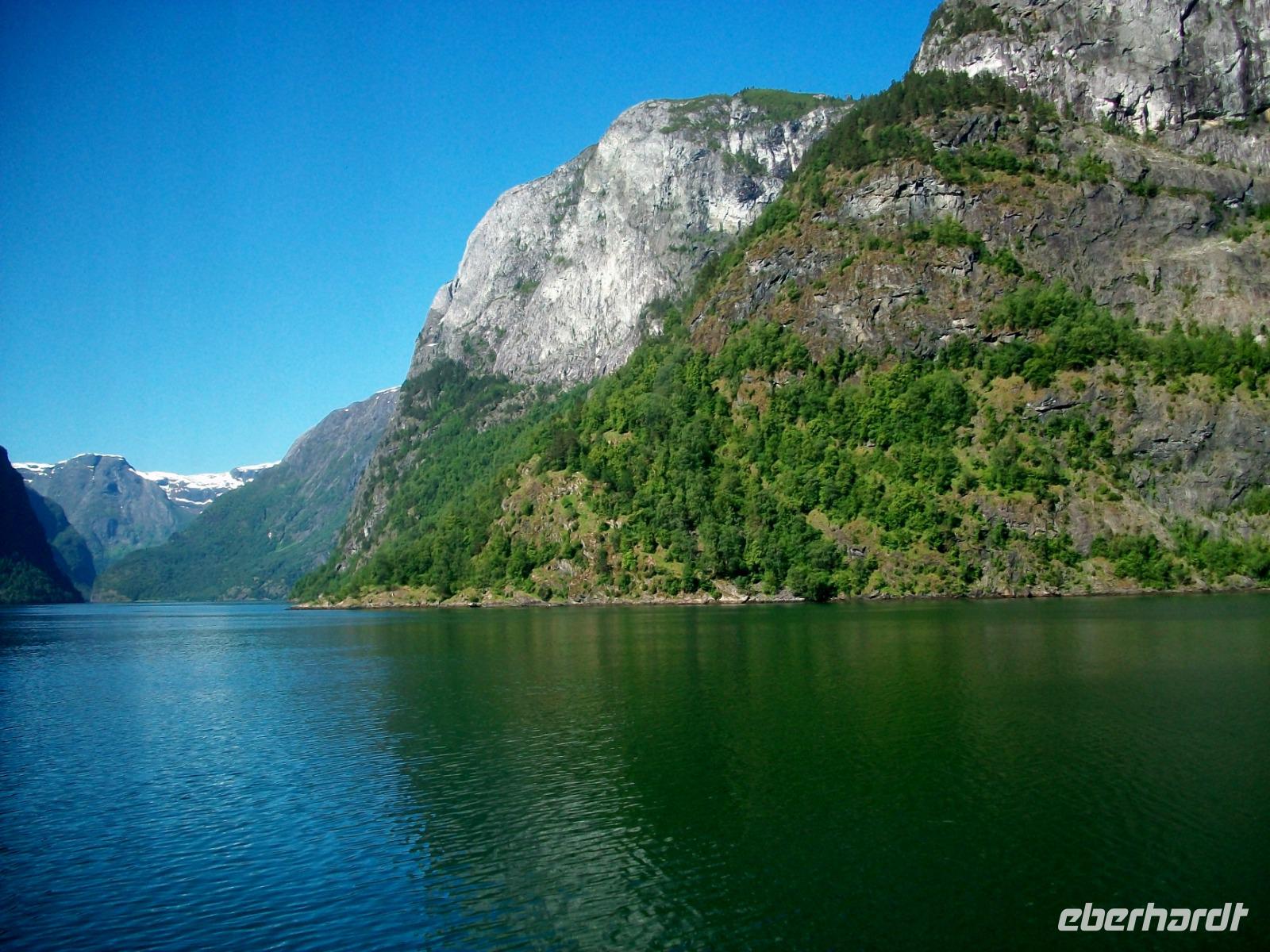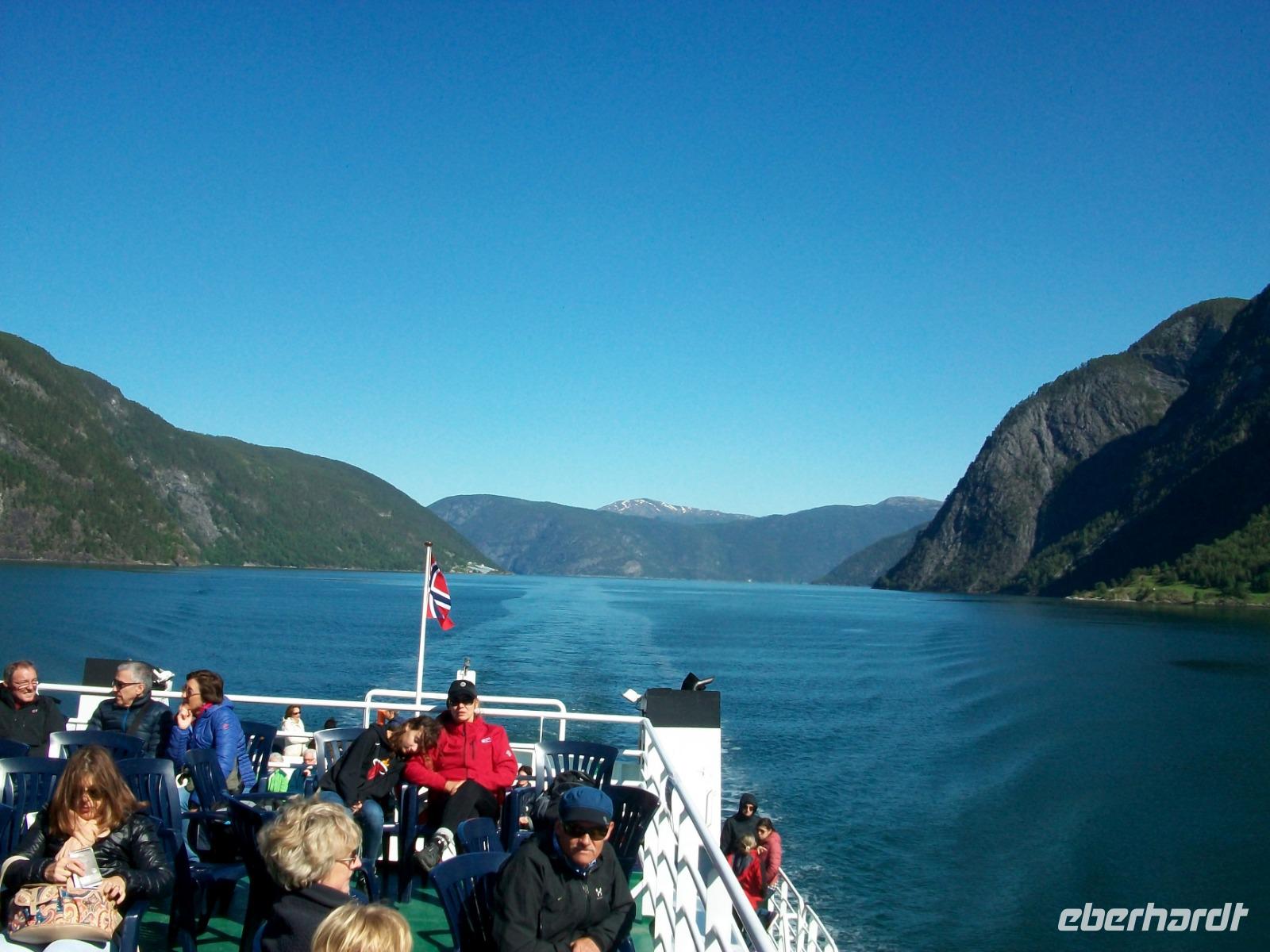 11.6.2019. Heute müssen wir etwas eher aus den Federn um zu unserem Schiff zu kommen. Als wir uns von Leikanger aufmachen, lacht schon wieder die Sonne von einem fast wolkenlosen strahlend blauen Himmel herab. Wir gelangen entlang des Sognefjords zum Auerlandfjord, und hier, im recht stillen Wasser, spiegeln sich die Berge.