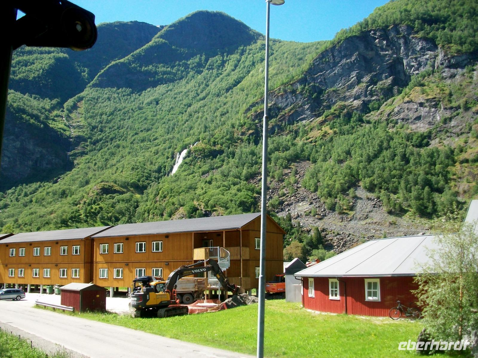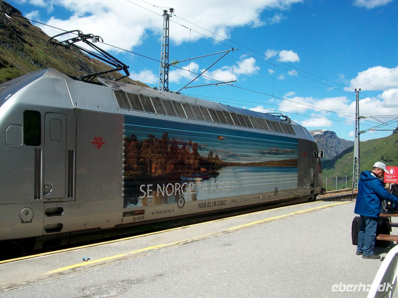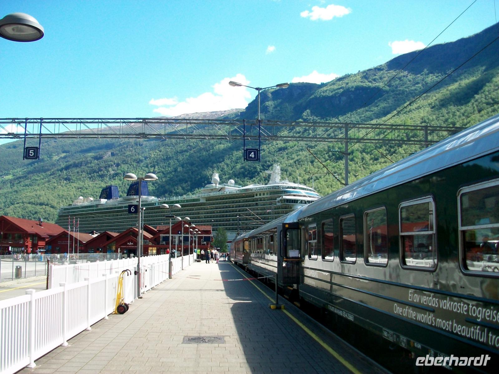 Leider vergeht die Zeit viel zu schnell, doch weitere schöne Ereignisse erwarten uns. Im Ort Kaupanger verlassen wir im Bus das Schiff um flugs nach Flåm zu gelangen wo eine schöne Zugfahrt auf uns wartet. Wir kommen eben noch rechtzeitig an und können es uns auf den reservierten Plätzen gemütlich machen. Ein Pfiff vom Zugbegleiter, der Zug ruckt an und schnell sind wir mit der Flåmbahn in einer schönen Natur unterwegs. Zahlreiche Wasserfälle donnern zu Tal, unten im Tal grünt und blüht es und in der nächsten Stunde werden wir nach Myrdal aufsteigen.