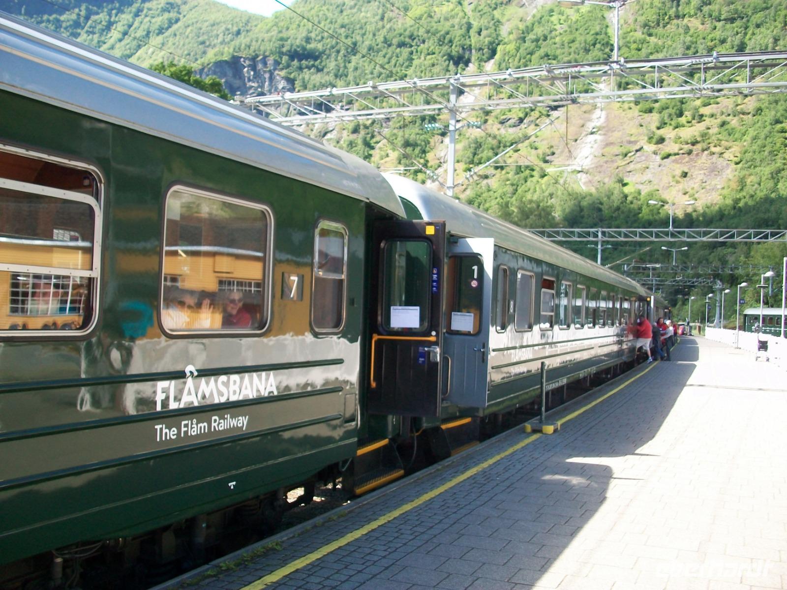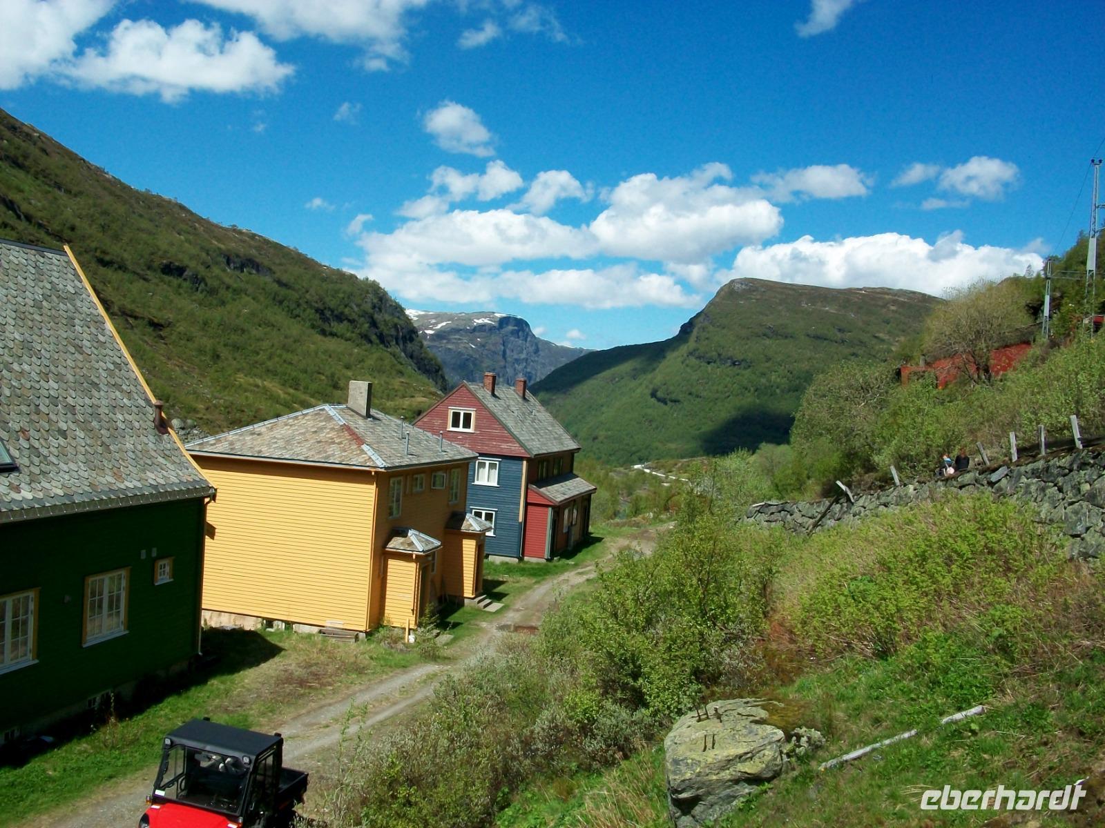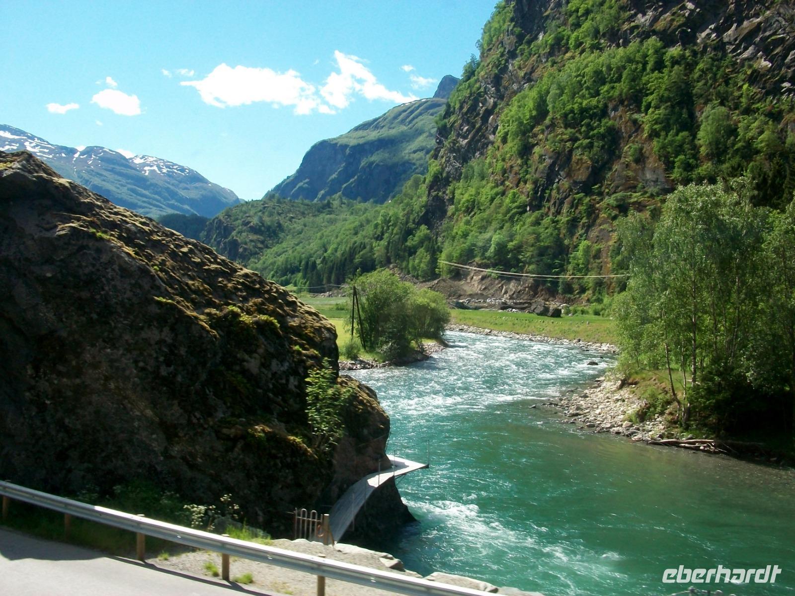 Leider vergeht die Zeit viel zu schnell, doch weitere schöne Ereignisse erwarten uns. Im Ort Kaupanger verlassen wir im Bus das Schiff um flugs nach Flåm zu gelangen wo eine schöne Zugfahrt auf uns wartet. Wir kommen eben noch rechtzeitig an und können es uns auf den reservierten Plätzen gemütlich machen. Ein Pfiff vom Zugbegleiter, der Zug ruckt an und schnell sind wir mit der Flåmbahn in einer schönen Natur unterwegs. Zahlreiche Wasserfälle donnern zu Tal, unten im Tal grünt und blüht es und in der nächsten Stunde werden wir nach Myrdal aufsteigen.