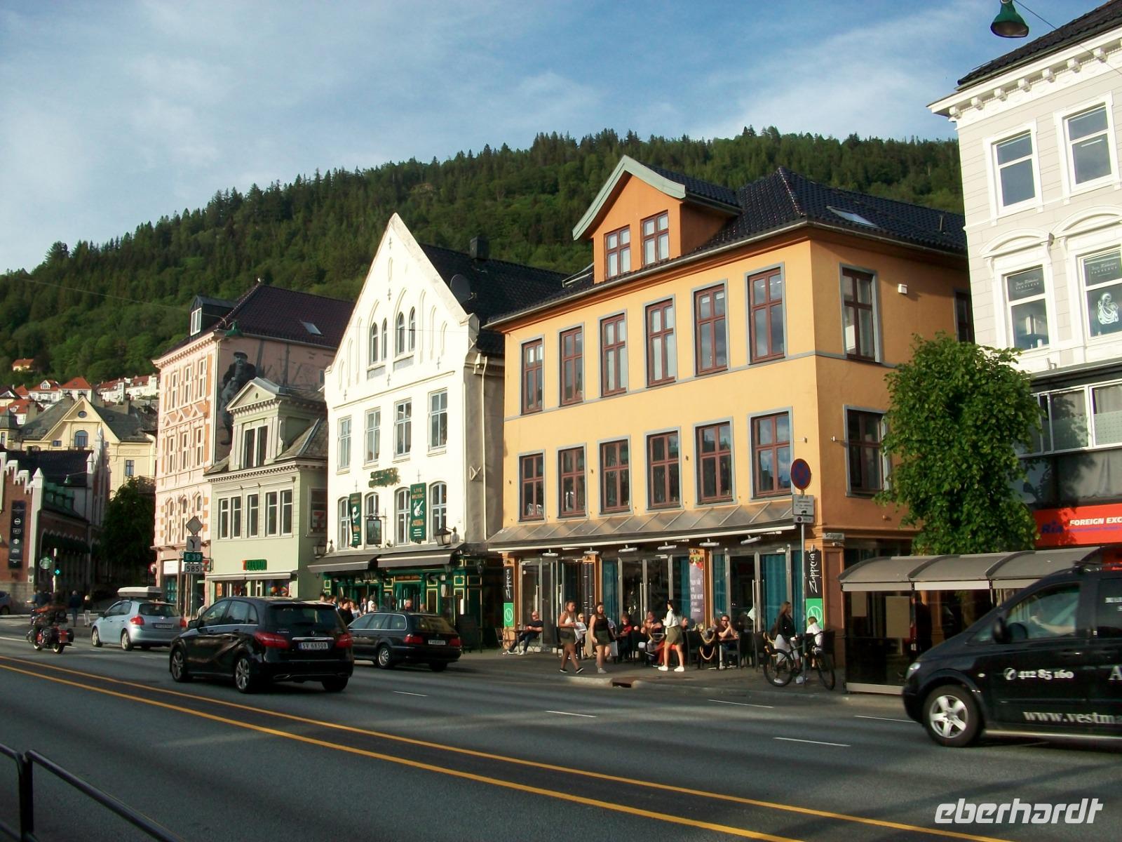 Im Ort Voss erwartet uns schon der Bus mit ihm gelangen wir zur Meeresküste nach Bergen. Sonnenschein empfängt uns, und da die Tage hier lange hell bleiben, lohnt nach dem Abendessen eine Auffahrt auf den Hausberg Fløy, wir werden von einem grandiosen Ausblick auf das abendliche Bergen belohnt.