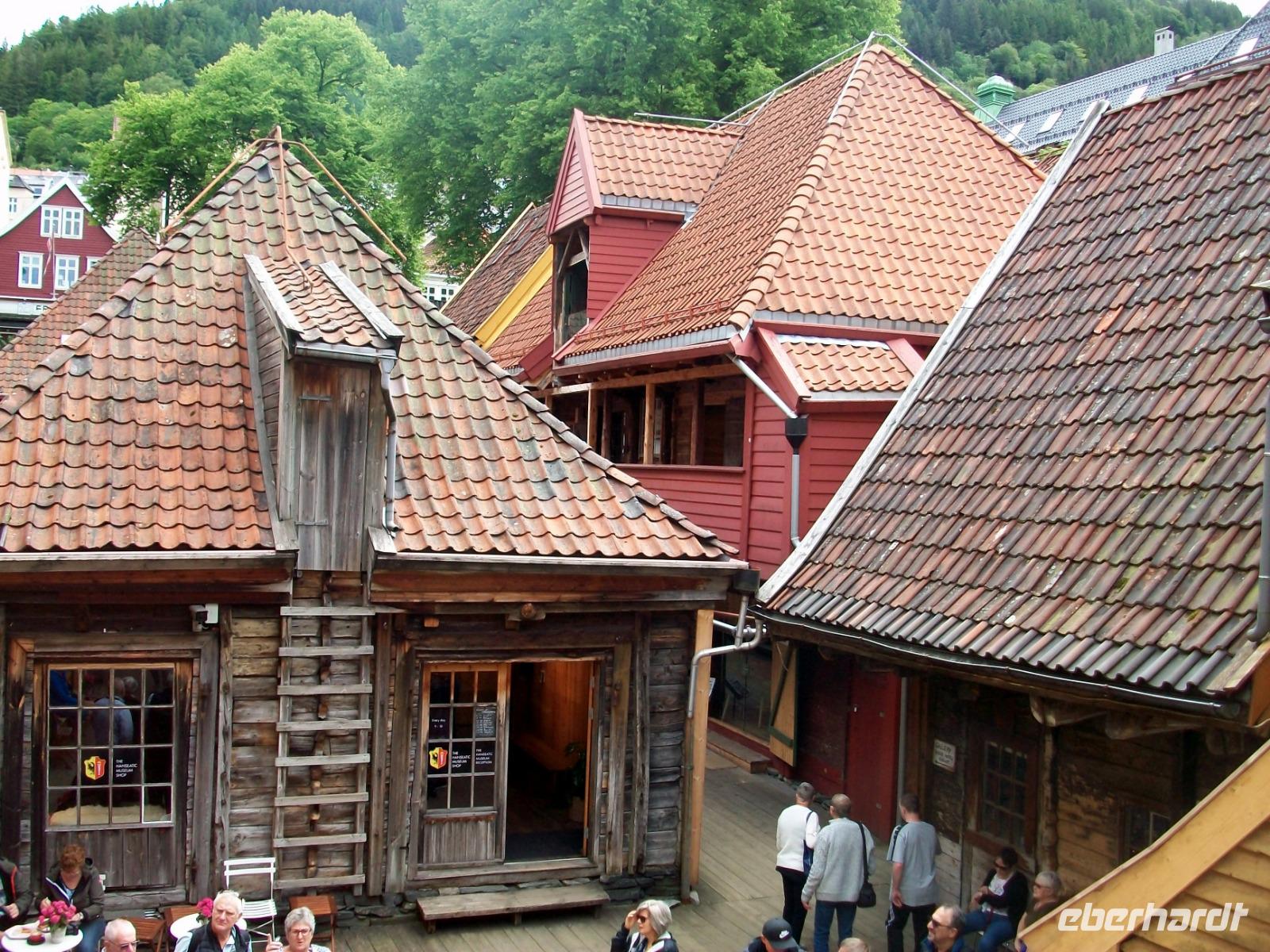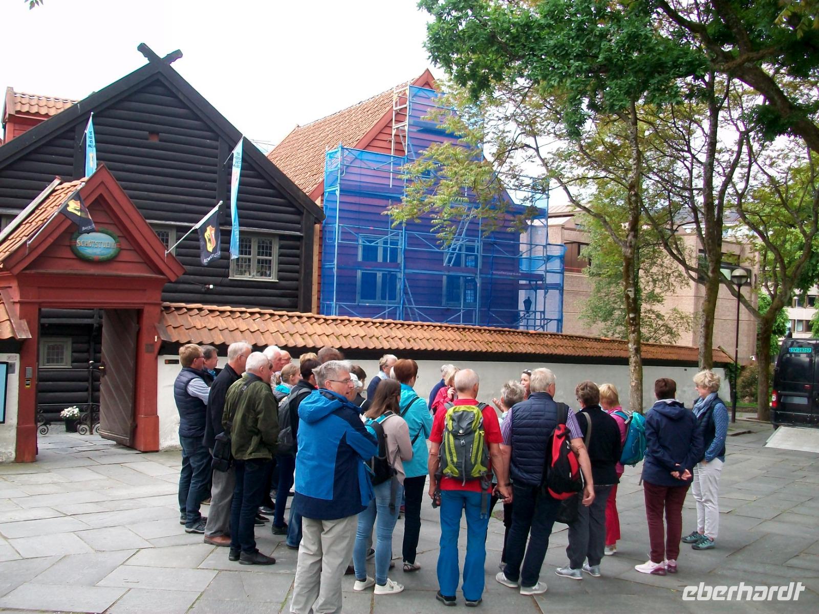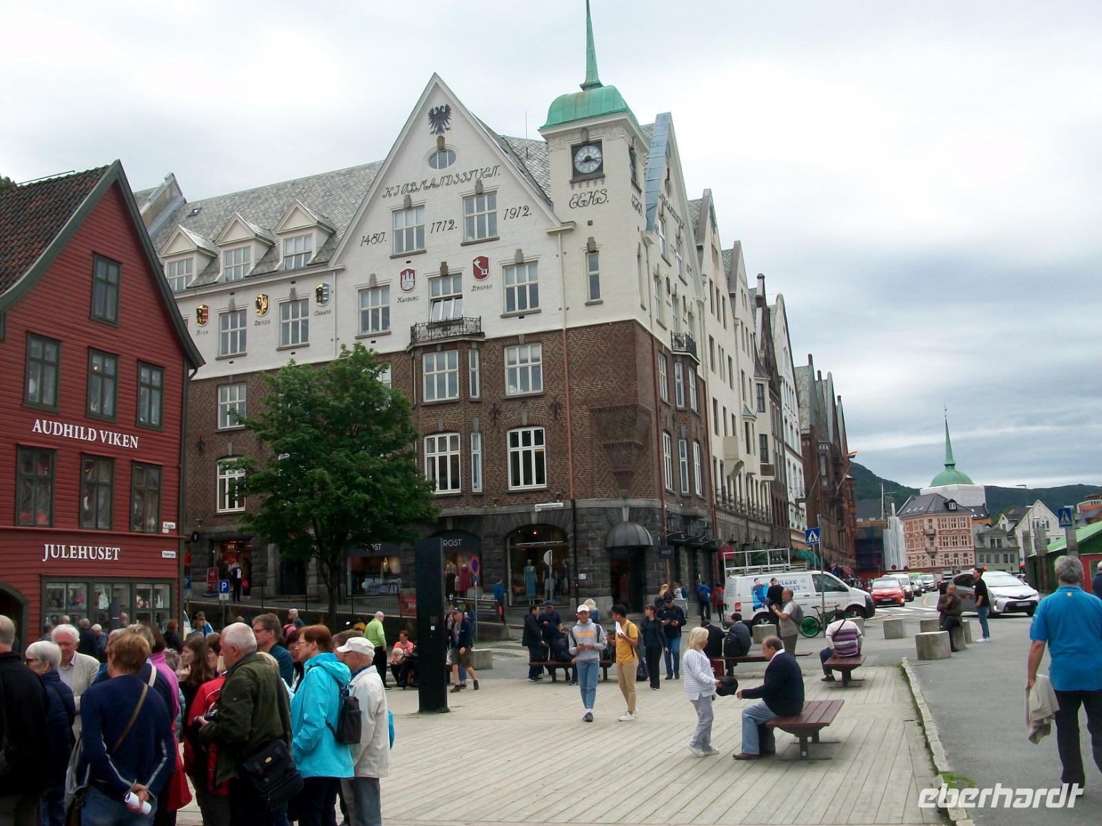 12.6.2019. Am Vormittag genießen wir eine Stadtrundfahrt durch Bergen. Wir starten gegen neun um uns einige schöne Ecken dieser Stadt anzuschauen. Wir sehen die malerische Villen, gepflegte Vorgärten und dazwischen viel Grün. Dann sind wir im modernen Teil unterwegs, gelangen in Teile des Hafens und erreichen bald das alte hanseatische Viertel Bryggen. Hier, zwischen den uralten Kontoren und Lagerhäusern, drehen wir die Zeit noch einmal um Jahrhunderte zurück. Es war die Zeit der alten Seefahrer und wir stehen staunend vor den Zeugnissen einer Epoche, die längst in den Tiefen der Zeit verschwunden ist.