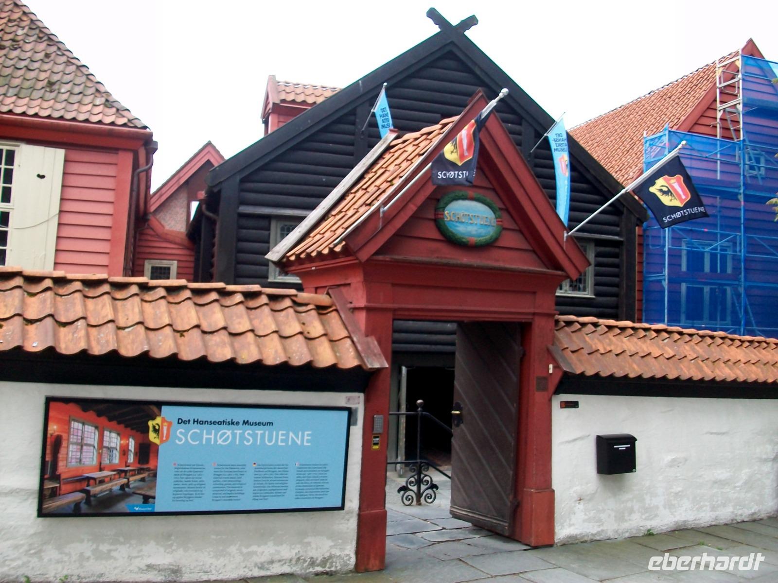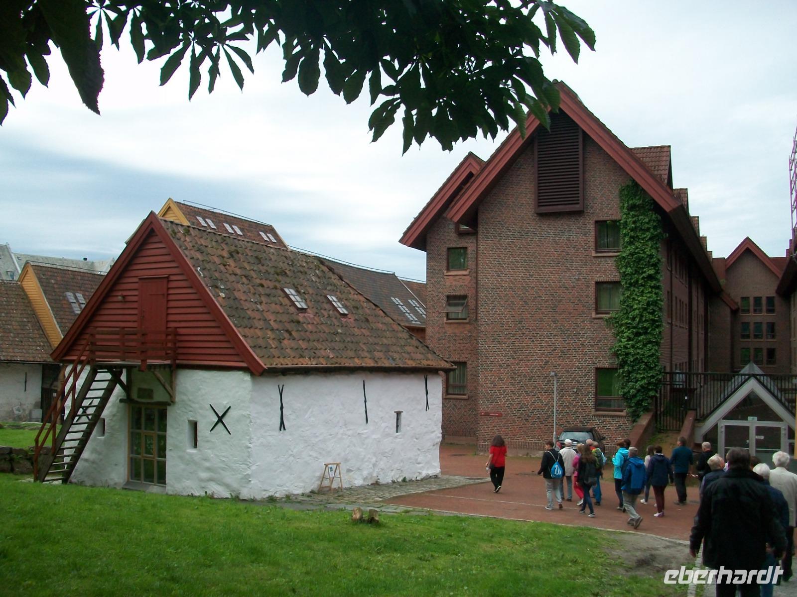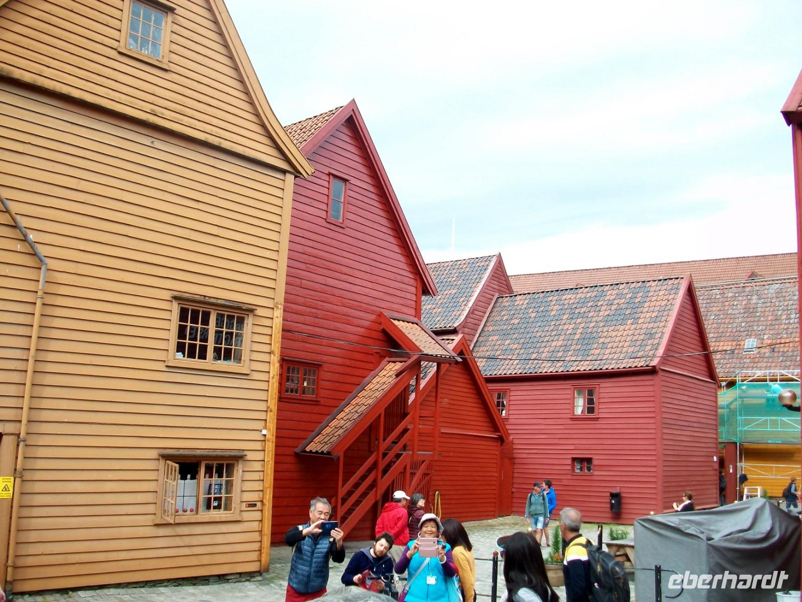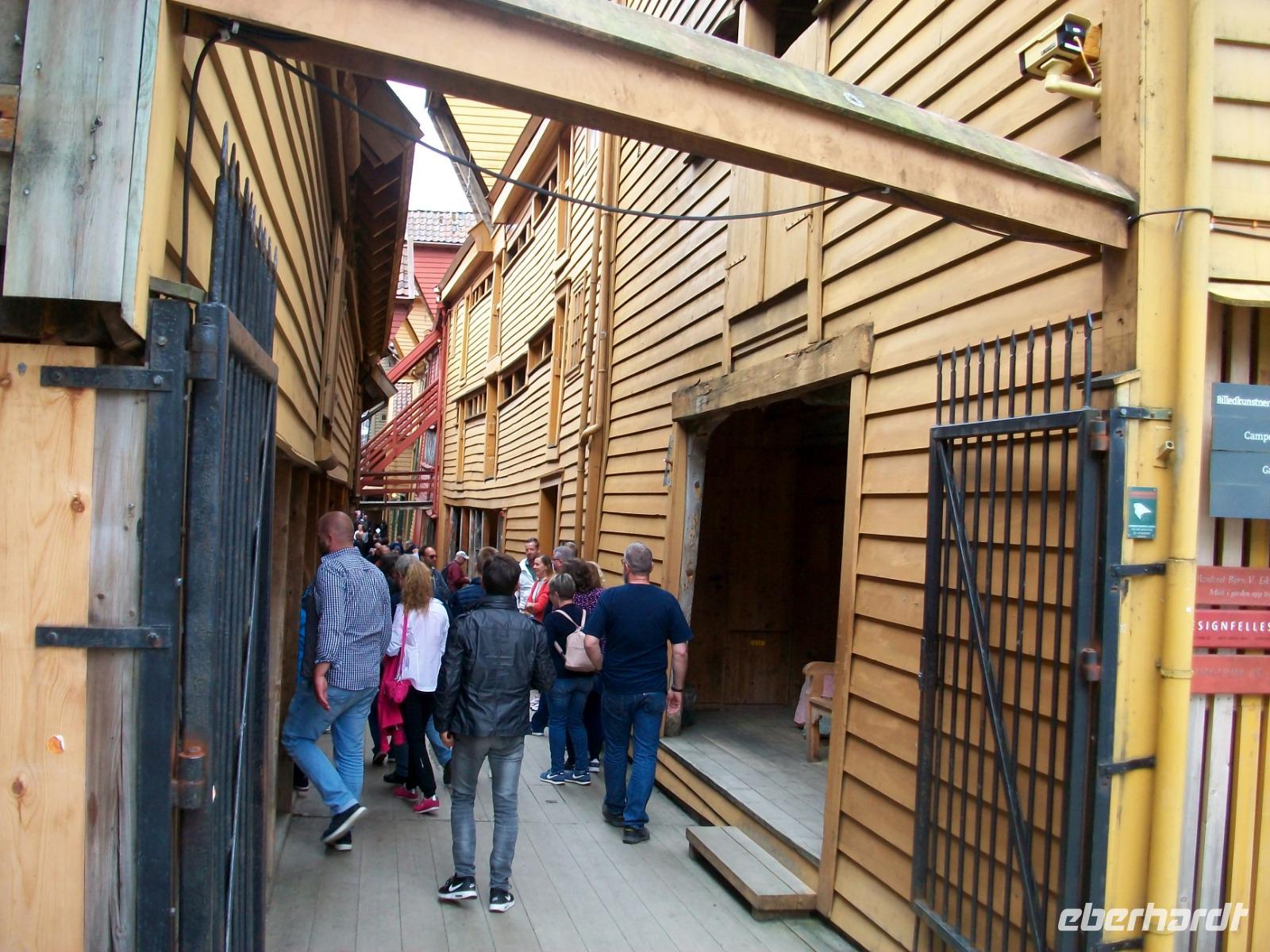 12.6.2019. Am Vormittag genießen wir eine Stadtrundfahrt durch Bergen. Wir starten gegen neun um uns einige schöne Ecken dieser Stadt anzuschauen. Wir sehen die malerische Villen, gepflegte Vorgärten und dazwischen viel Grün. Dann sind wir im modernen Teil unterwegs, gelangen in Teile des Hafens und erreichen bald das alte hanseatische Viertel Bryggen. Hier, zwischen den uralten Kontoren und Lagerhäusern, drehen wir die Zeit noch einmal um Jahrhunderte zurück. Es war die Zeit der alten Seefahrer und wir stehen staunend vor den Zeugnissen einer Epoche, die längst in den Tiefen der Zeit verschwunden ist.