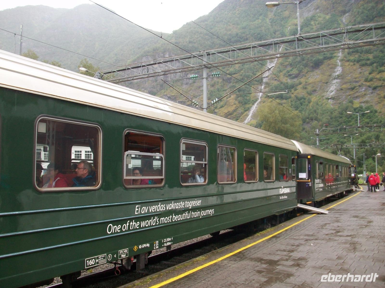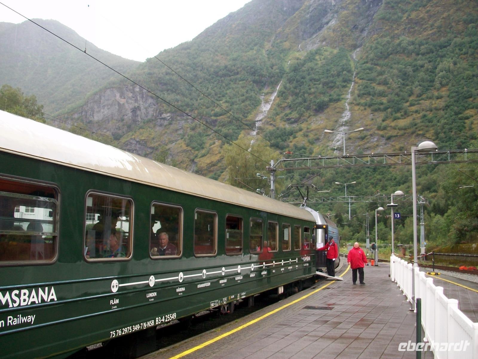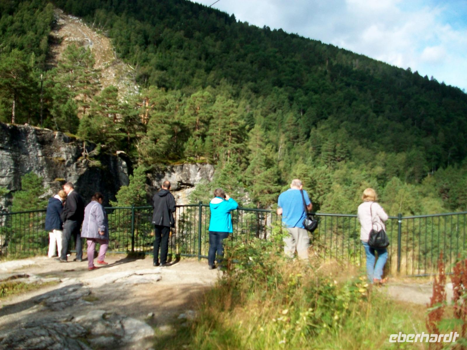 20.8.2019. Heute müssen wir etwas früher aus den Federn, es lohnt sich aber da uns ein weiterer eindrucksvoller Tag bevorsteht. Zunächst gelangen wir am Ufer des Sognefjords in den Ort Kaupanger. Hier, wo einst schon die Wikinger einen Hafen hatten, wartet unser Schiff mit dem wir nun die nächsten Stunden weitere schöne Impressionen genießen können. Pünktlich gegen neun legen wir ab und bald sind wir unterwegs; langsam ziehen die grünen Berge an den Fenstern vorbei und im weiteren Verlauf steigen die Berge fast lotrecht über Eintausend Meter an so dass wir beim Betrachten den Kopf in den Nacken legen müssen. Nun wagt sich auch zaghaft die Sonne hervor, wird sie uns auch weiterhin begleiten? Dann langen wir pünktlich in Gudvangen an und müssen uns nun sputen um nach Flåm zu gelangen wo auf uns der Zug wartet. Durch den langen Tunnel hindurch sind wir bald da, schnell zum Bahnsteig und hier können wir schon in den für uns reserviertem Wagen Platz nehmen; dann ein Ruck, und die Fahrt beginnt. Leider regnet es wieder aber die Ausblicke die wir genießen können sind dennoch grandios. Durch ein wildromantisches Tal führt die Tour, unten rauscht der Wildfluss, von den Bergen donnern Wasserfälle herab und wir sind mittendrin. Dann, an einem besonders spektakulären Wasserfall stoppt der Zug und es erscheint uns auf einem Felsen die Sagengestalt Huldra. Die Fahrt endet oben in Myrdal, wir steigen um und nun bringt uns die Bergenbahn noch ein Stück weiter, auch hier sind die Ausblicke grandios, nur das Wetter nicht.