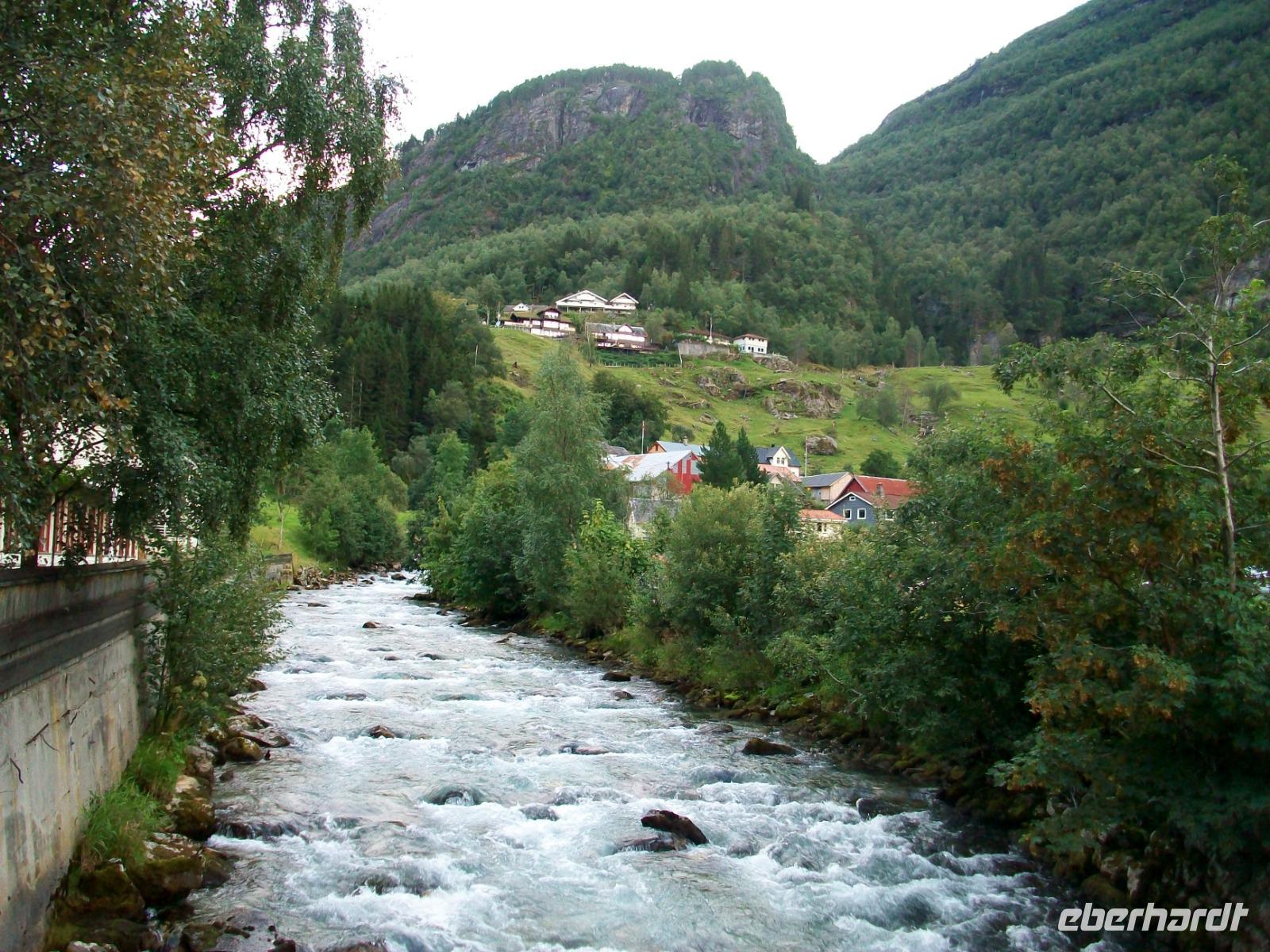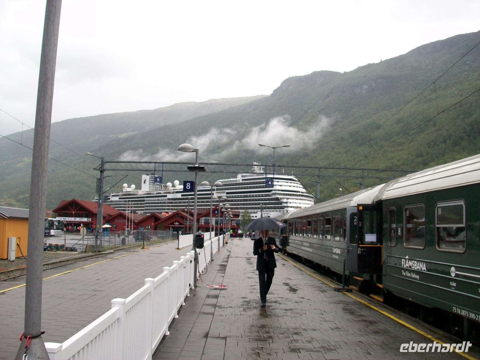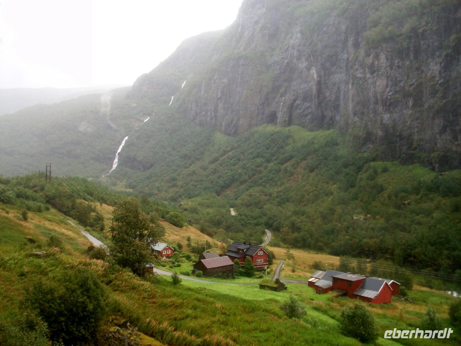 20.8.2019. Heute müssen wir etwas früher aus den Federn, es lohnt sich aber da uns ein weiterer eindrucksvoller Tag bevorsteht. Zunächst gelangen wir am Ufer des Sognefjords in den Ort Kaupanger. Hier, wo einst schon die Wikinger einen Hafen hatten, wartet unser Schiff mit dem wir nun die nächsten Stunden weitere schöne Impressionen genießen können. Pünktlich gegen neun legen wir ab und bald sind wir unterwegs; langsam ziehen die grünen Berge an den Fenstern vorbei und im weiteren Verlauf steigen die Berge fast lotrecht über Eintausend Meter an so dass wir beim Betrachten den Kopf in den Nacken legen müssen. Nun wagt sich auch zaghaft die Sonne hervor, wird sie uns auch weiterhin begleiten? Dann langen wir pünktlich in Gudvangen an und müssen uns nun sputen um nach Flåm zu gelangen wo auf uns der Zug wartet. Durch den langen Tunnel hindurch sind wir bald da, schnell zum Bahnsteig und hier können wir schon in den für uns reserviertem Wagen Platz nehmen; dann ein Ruck, und die Fahrt beginnt. Leider regnet es wieder aber die Ausblicke die wir genießen können sind dennoch grandios. Durch ein wildromantisches Tal führt die Tour, unten rauscht der Wildfluss, von den Bergen donnern Wasserfälle herab und wir sind mittendrin. Dann, an einem besonders spektakulären Wasserfall stoppt der Zug und es erscheint uns auf einem Felsen die Sagengestalt Huldra. Die Fahrt endet oben in Myrdal, wir steigen um und nun bringt uns die Bergenbahn noch ein Stück weiter, auch hier sind die Ausblicke grandios, nur das Wetter nicht.