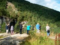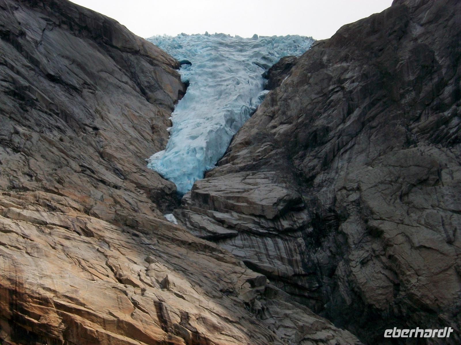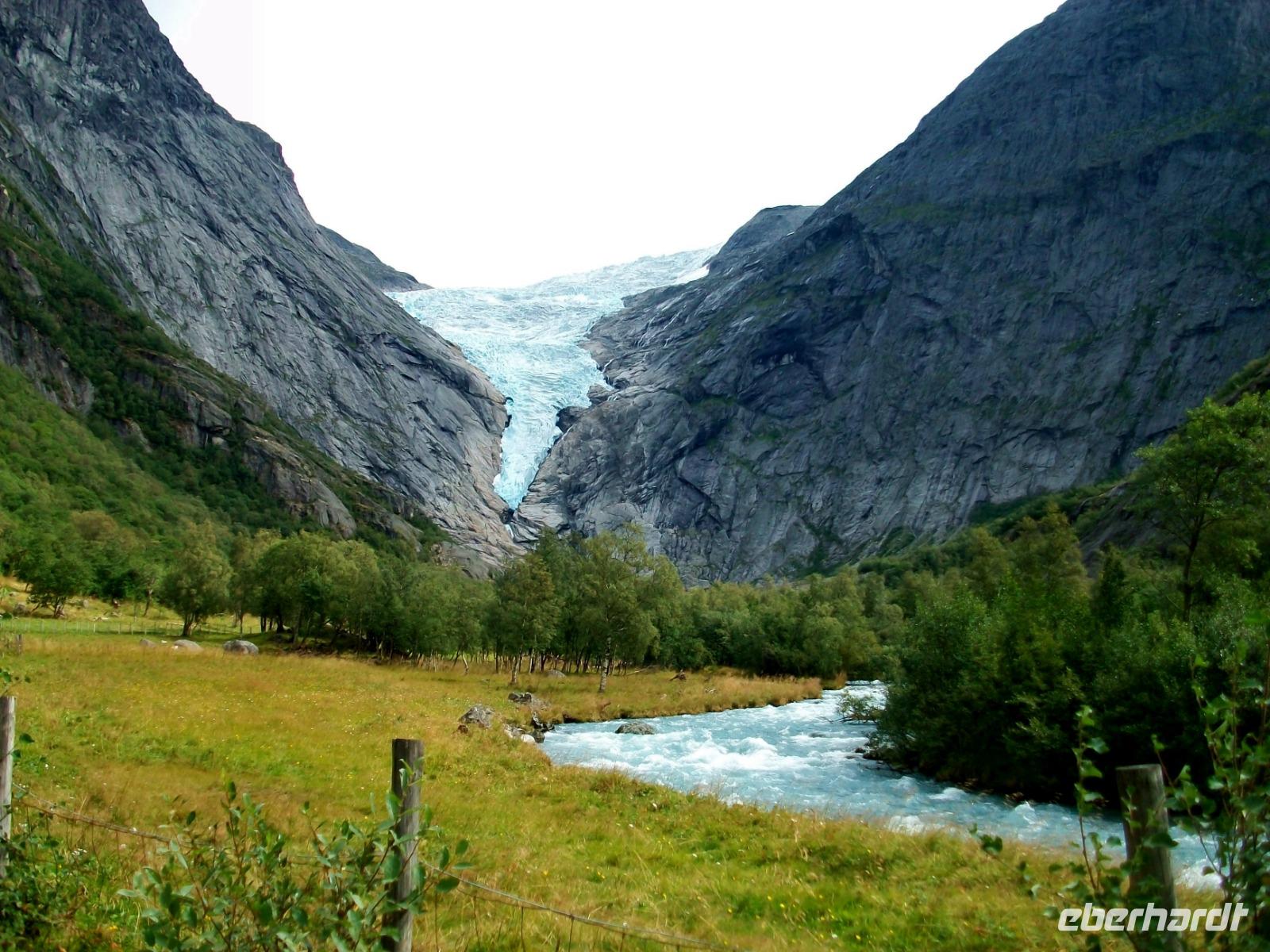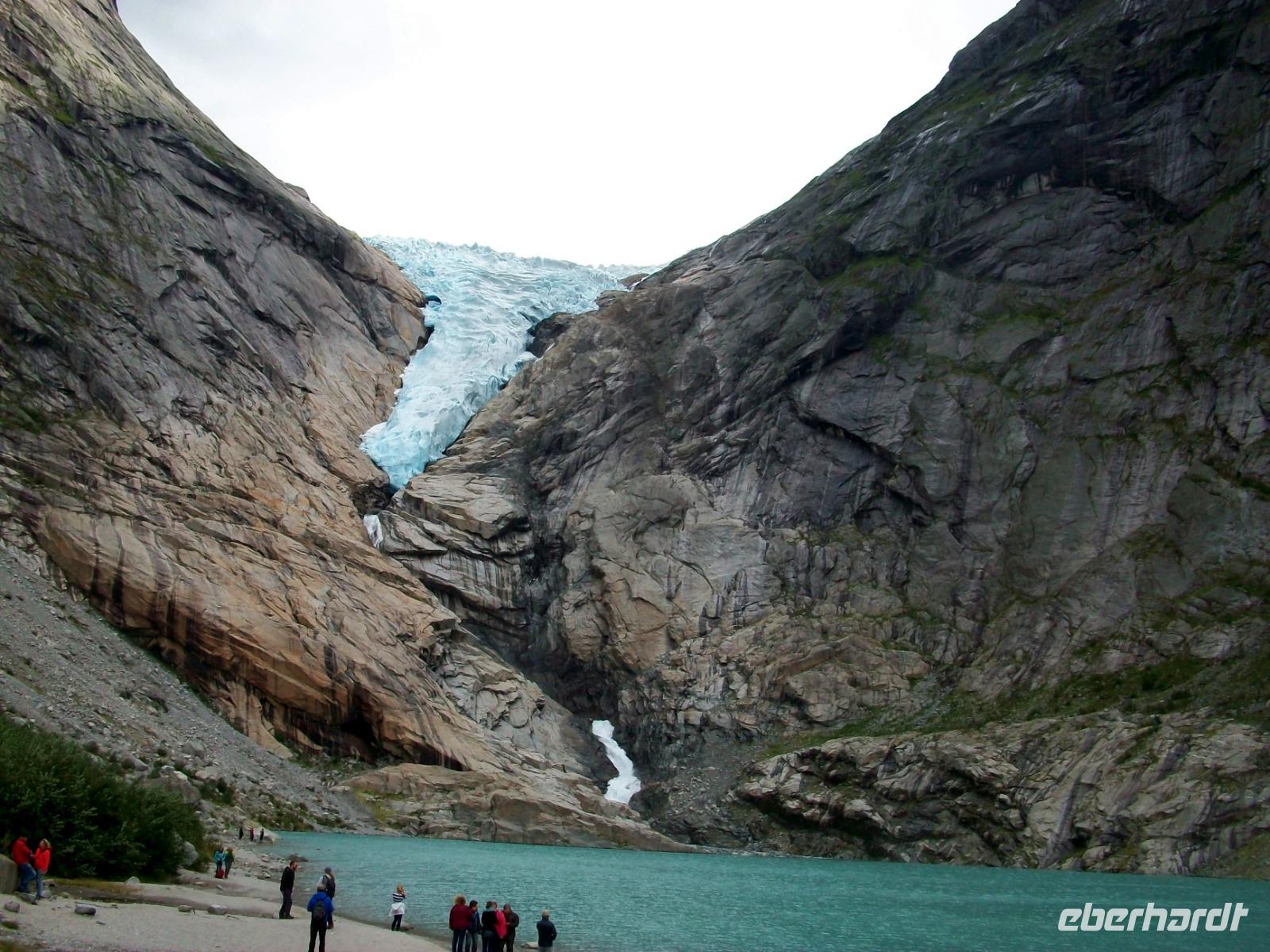 Ja, das Wetter ist gut, wir können die Wanderung wagen. Schnell sind wir in der unberührten Natur unterwegs und bald taucht vor unseren Augen die mächtige, blauschimmernde Eismasse des Briksdalsgletschers auf. Am Abfluss hat sich ein See gebildet und hier, an diesem Ort, staunen wir erneut welche Wunder uns die norwegische Natur bieten kann. Als wir den Rückweg antreten ziehen dunkle Wolken über die Berge, sie bringen neuen Regen. Etwas durchnässt erreichen wir den Bus, die gute Laune kann das Nass uns aber nicht verderben, das wunderbare Erlebnis Briksdalsbreen wird lange in unserer Erinnerung bleiben.