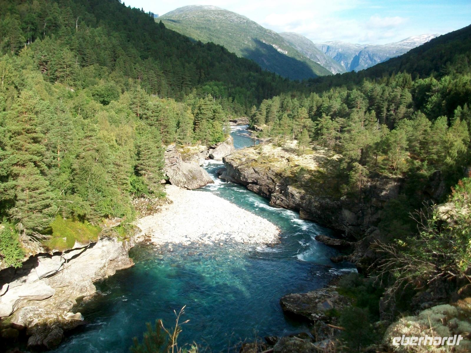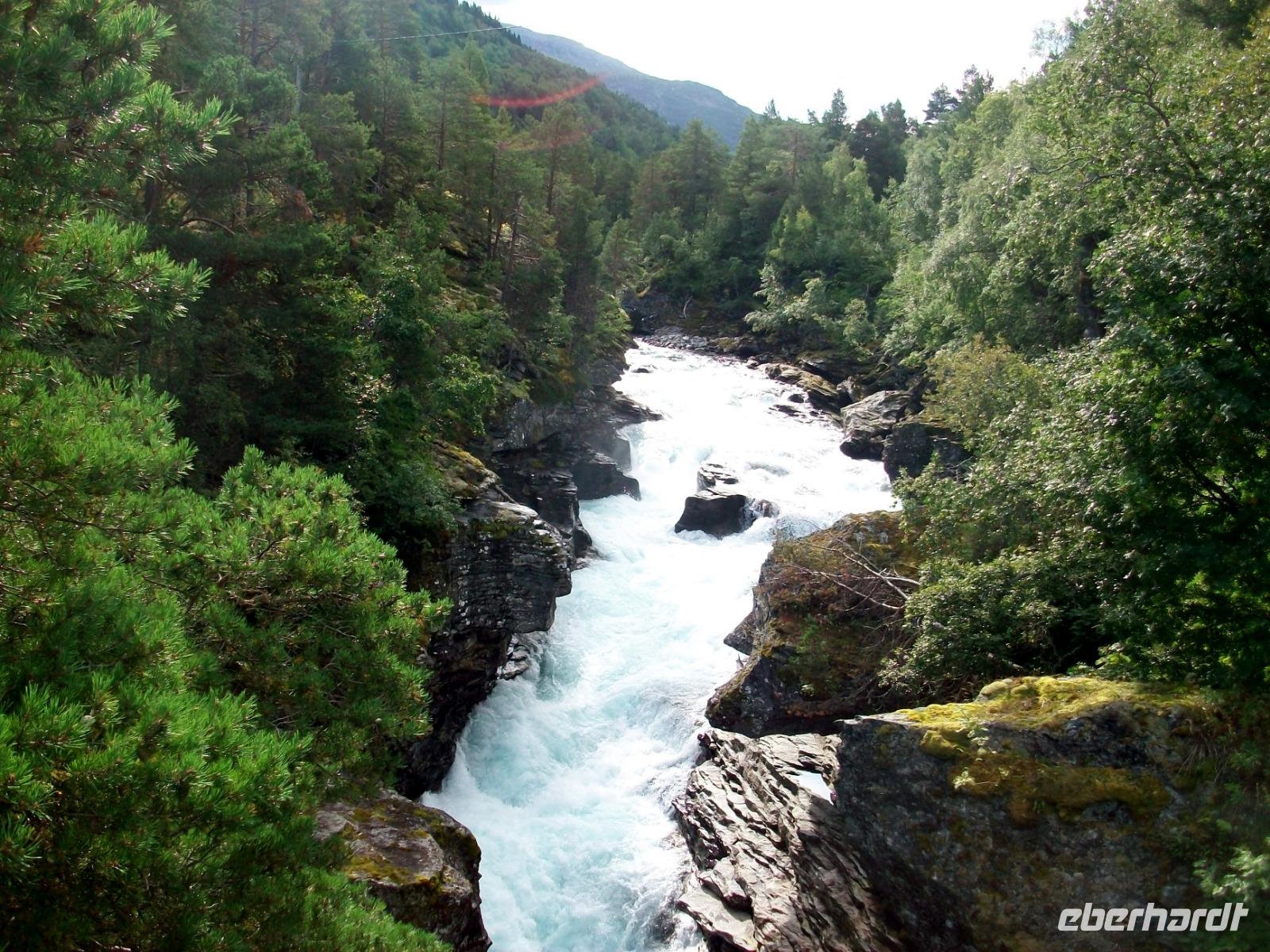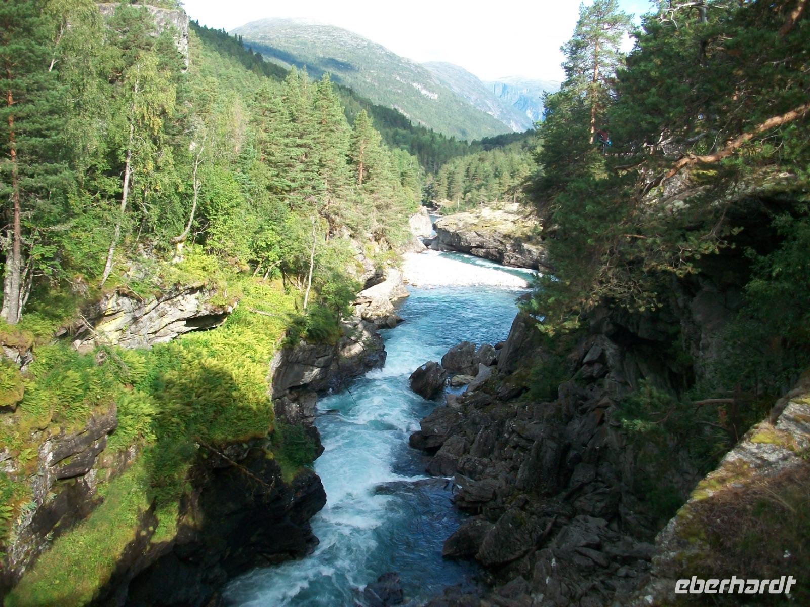 18.8.2019. Mein erster Blick nach dem Erwachen geht hinunter ins Tal. Kleine, zarte Wölkchen haben sich hier festgehangen, der Regen hat aufgehört und es gibt Wolkenlücken, das sieht schon mal gut aus. Auch heute nehmen wir gegen neun die Fahrt auf und sind gleich nach dem Start in der wunderbaren Natur Norwegens unterwegs. Überall wo wir hinschauen sehen wir kräftiges Grün; links von uns rauscht der Wildfluss und an einer besonders eindrucksvollen Stromschnelle, dem Slettafoss, genehmigen wir uns über dem tosenden Strom eine erste Pause.