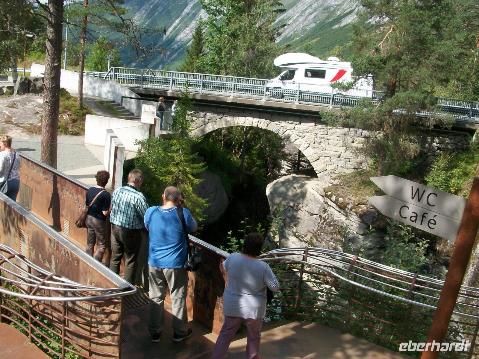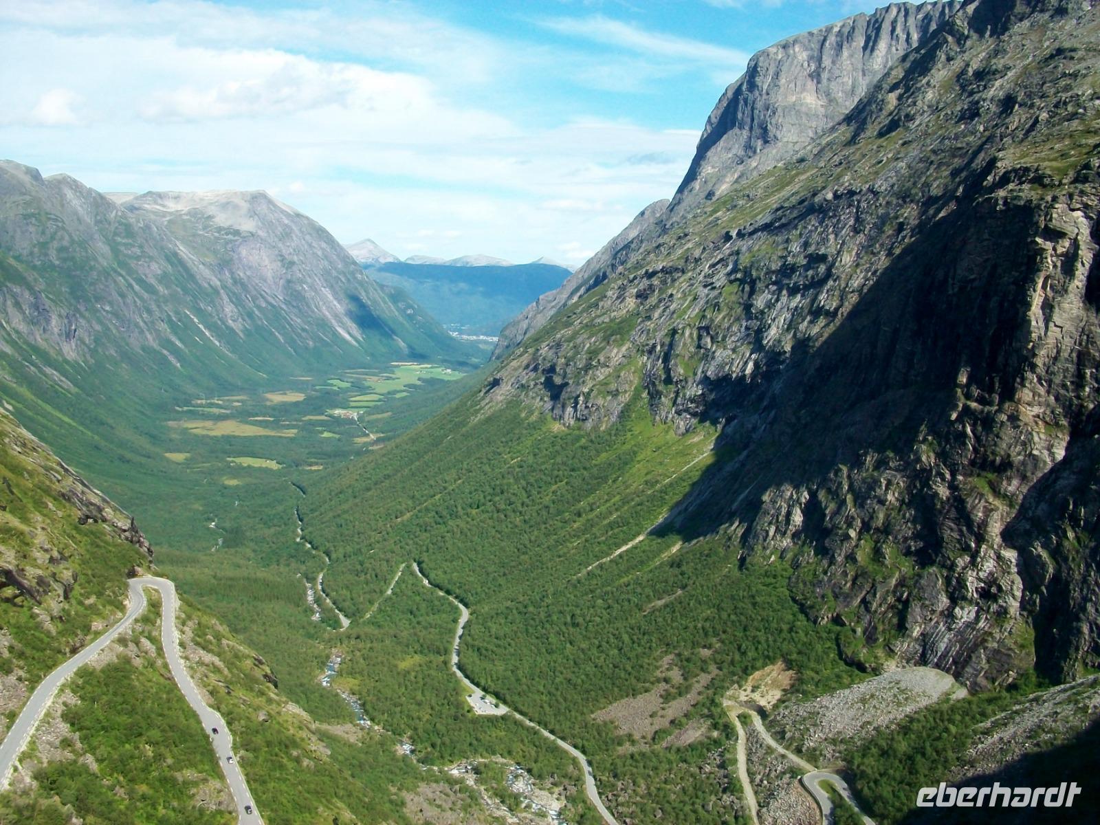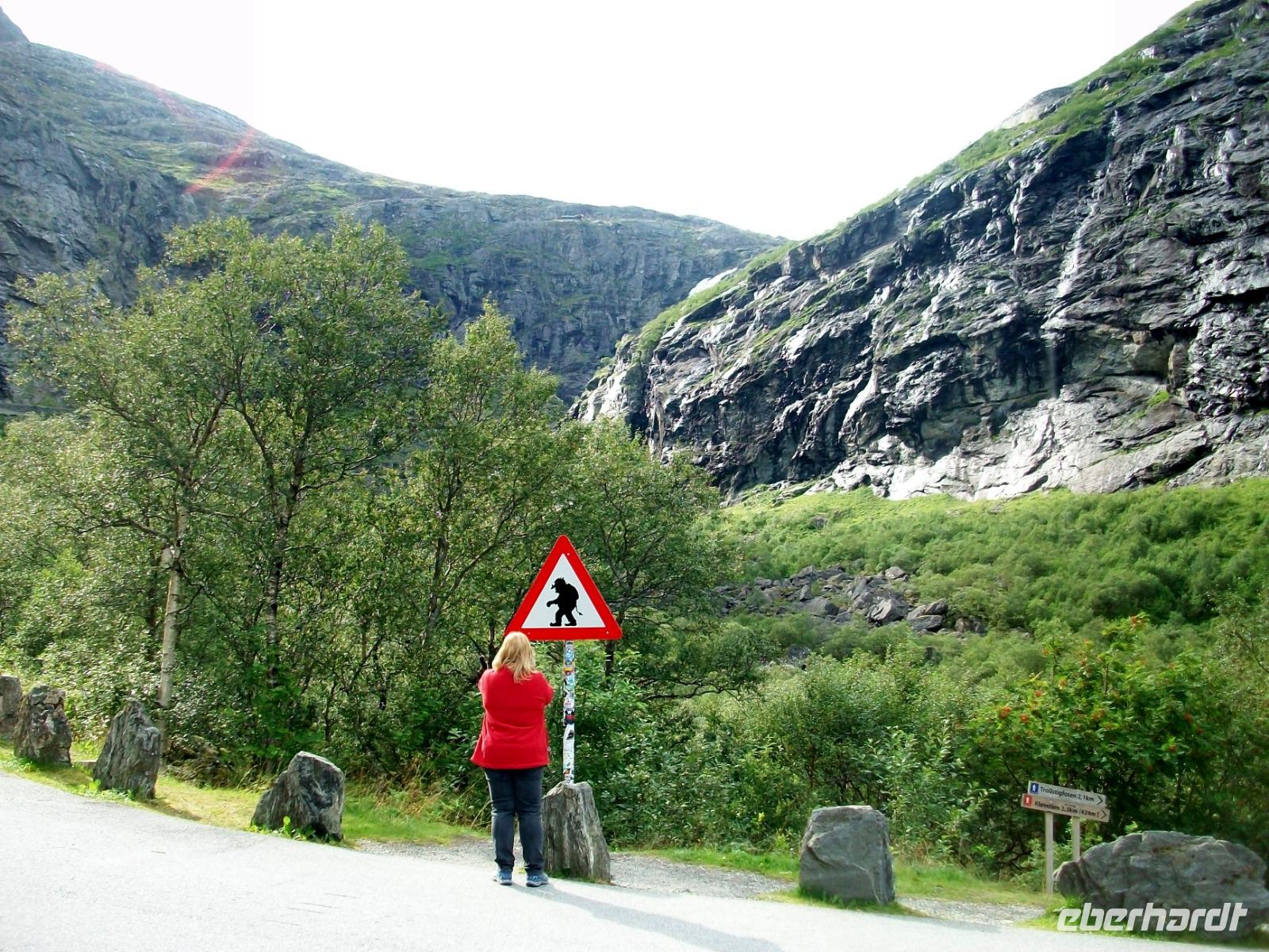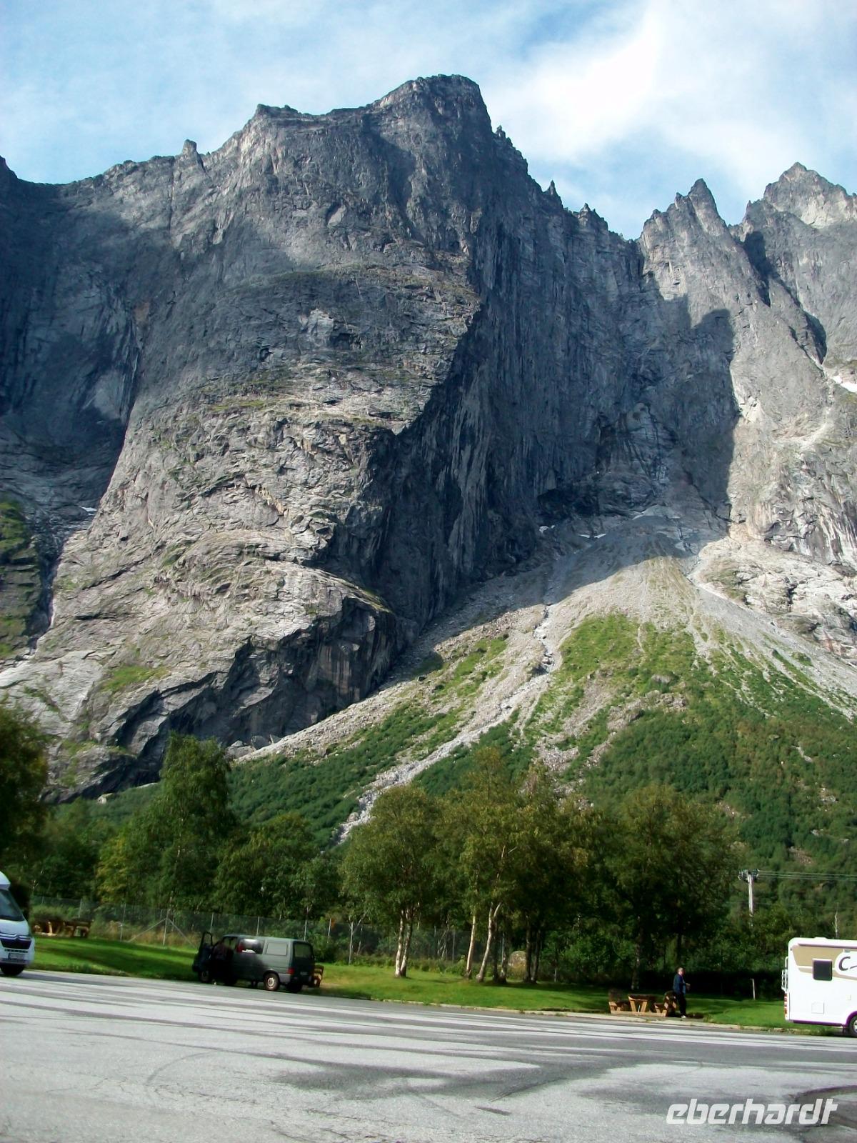 Dann geht es weiter; die Berge rücken immer näher an die Straße heran und an der berühmten Trollwand, die vom Tal senkrecht Eintausend Meter ansteigt, stehen wir staunend vor dieser Macht der Natur.