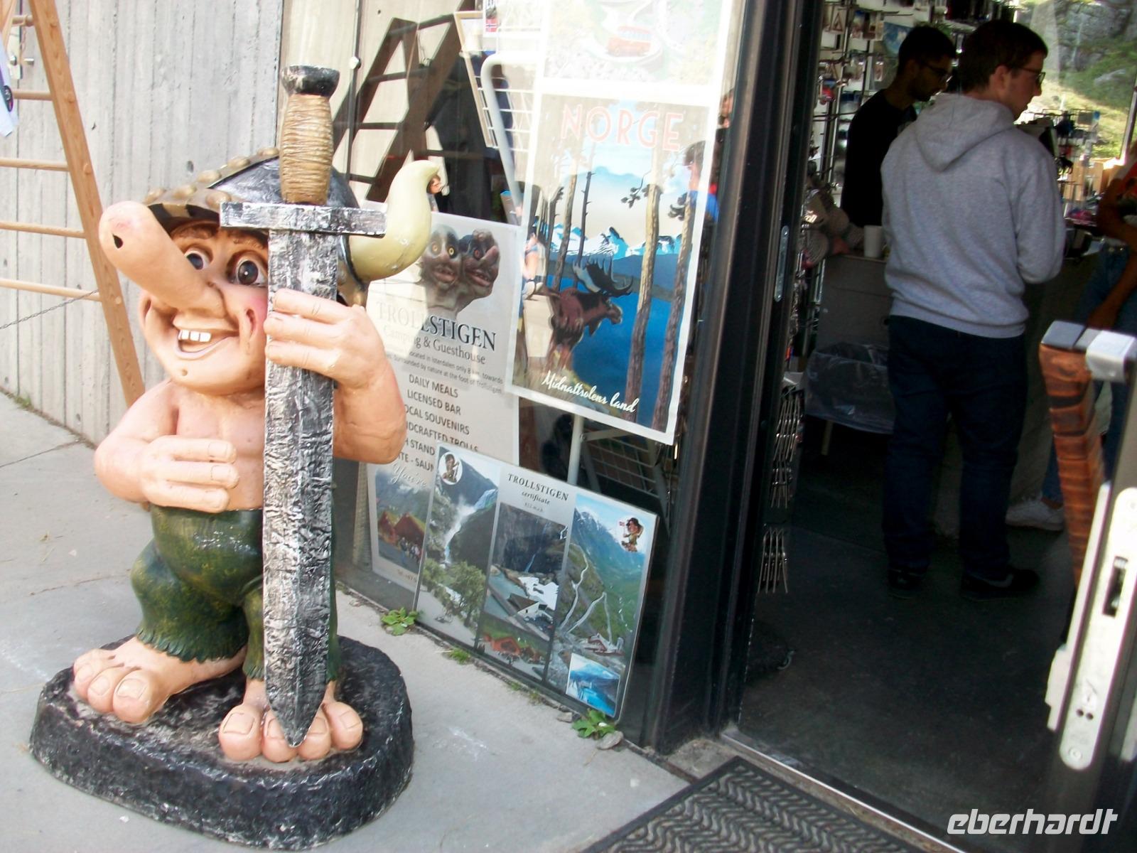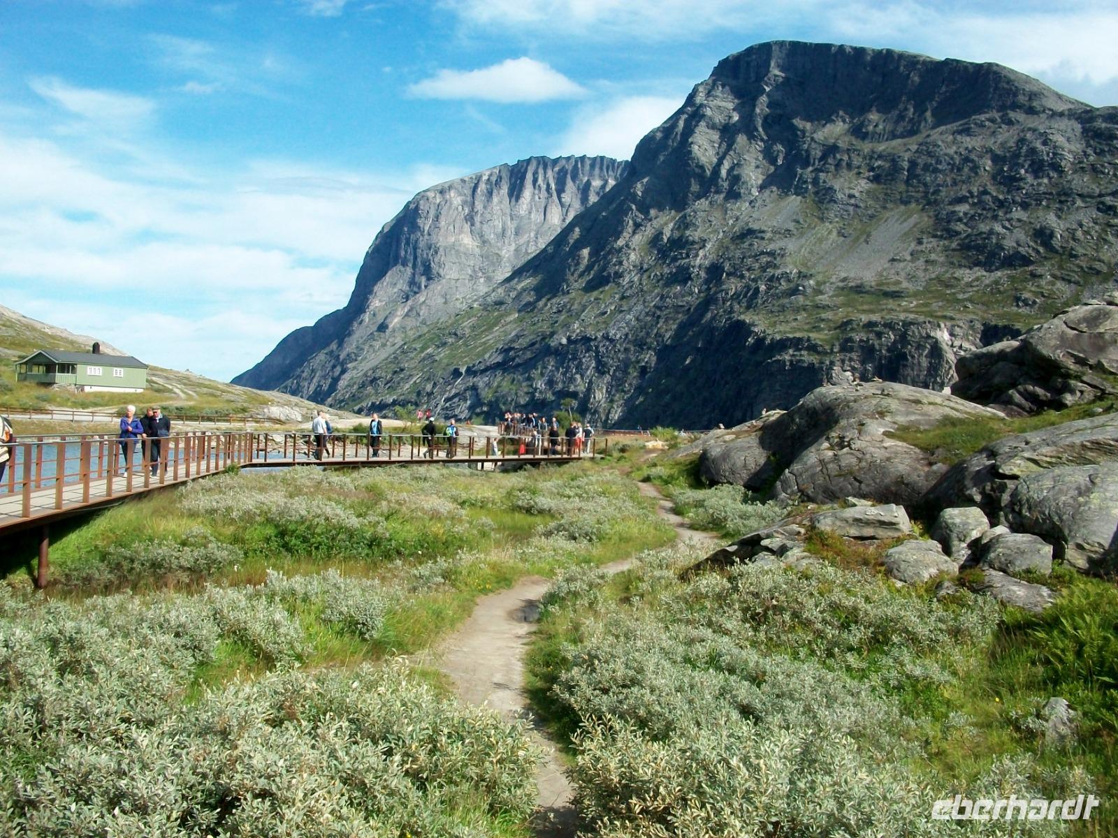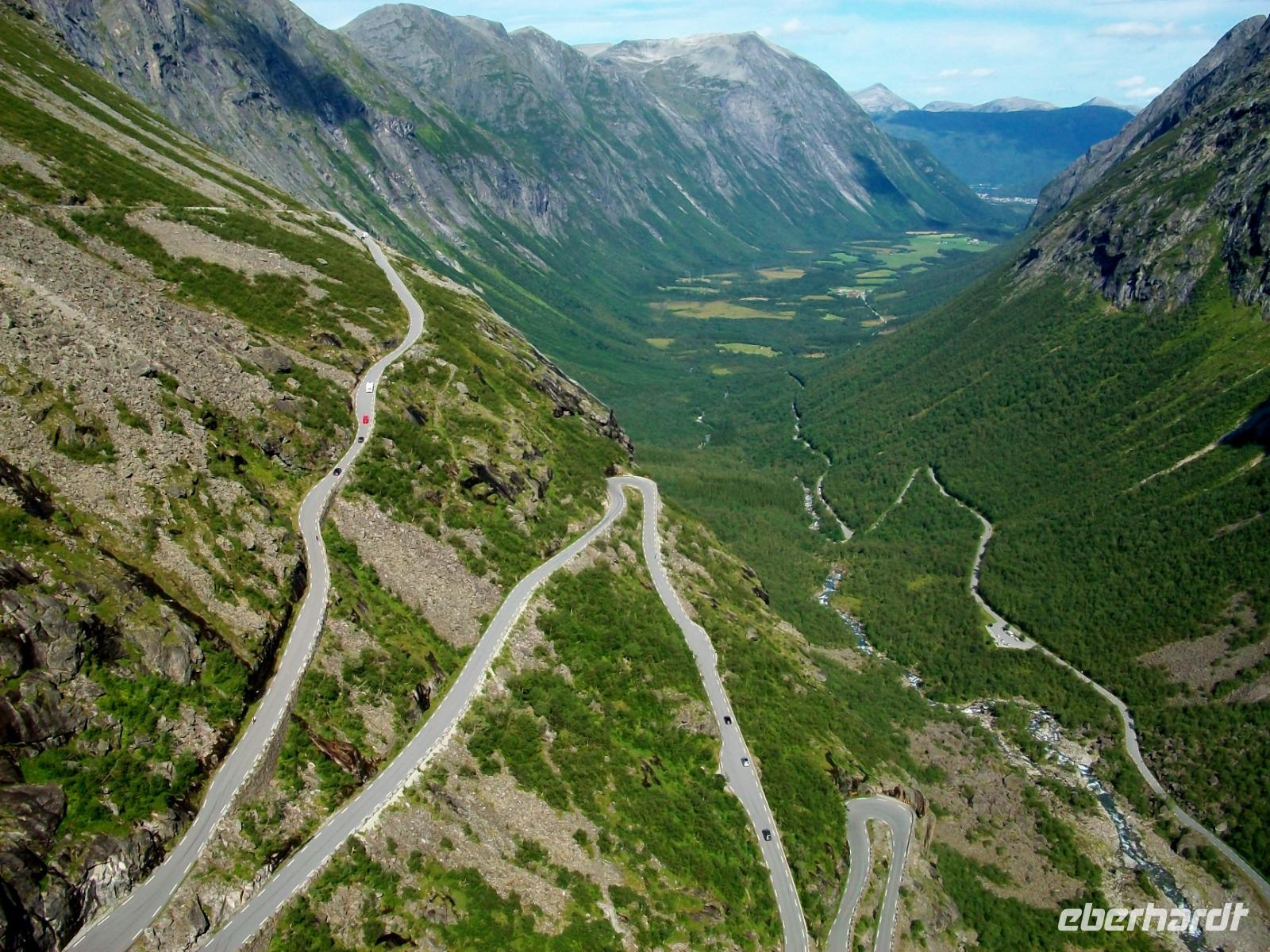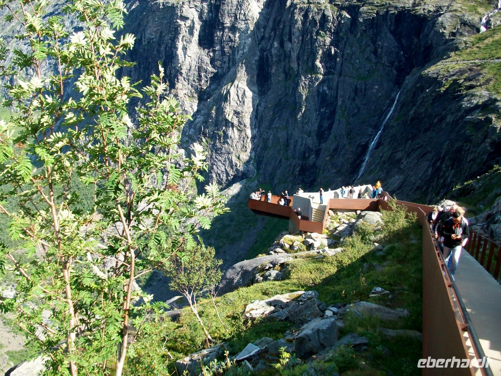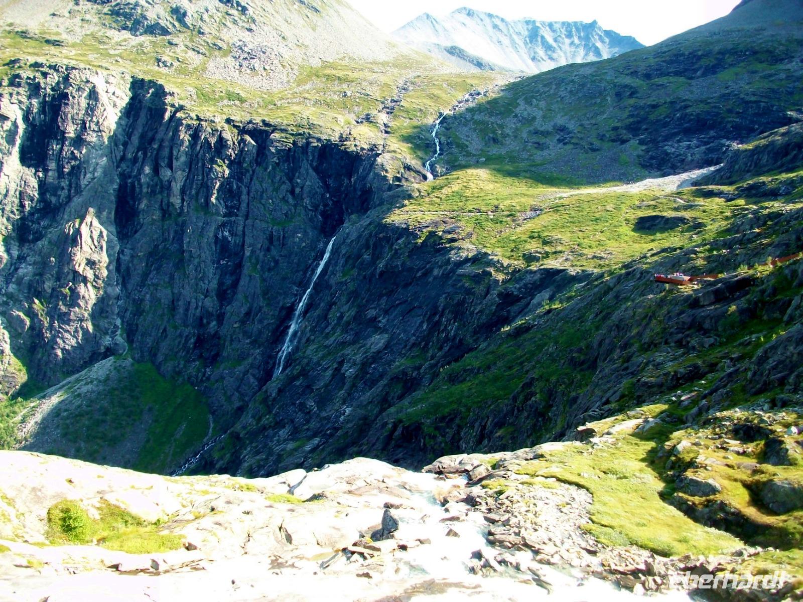Dann geht es weiter; die Berge rücken immer näher an die Straße heran und an der berühmten Trollwand, die vom Tal senkrecht Eintausend Meter ansteigt, stehen wir staunend vor dieser Macht der Natur.
