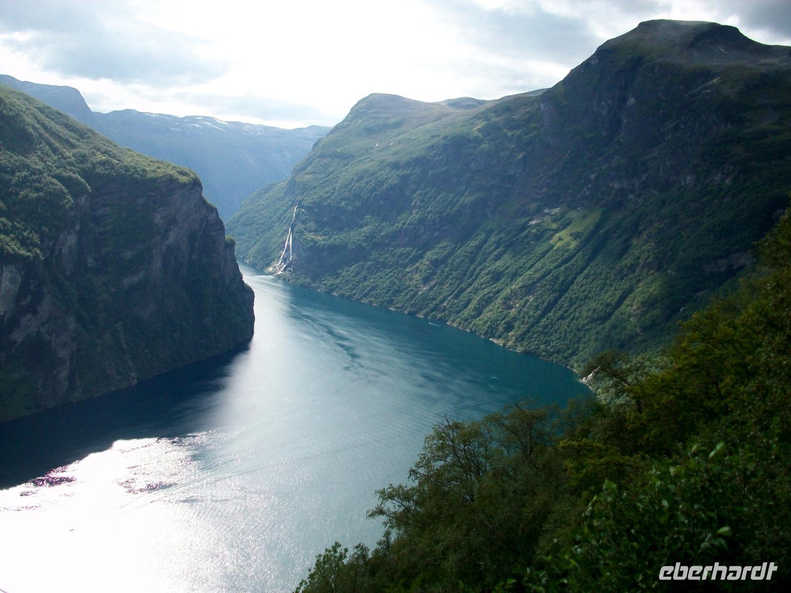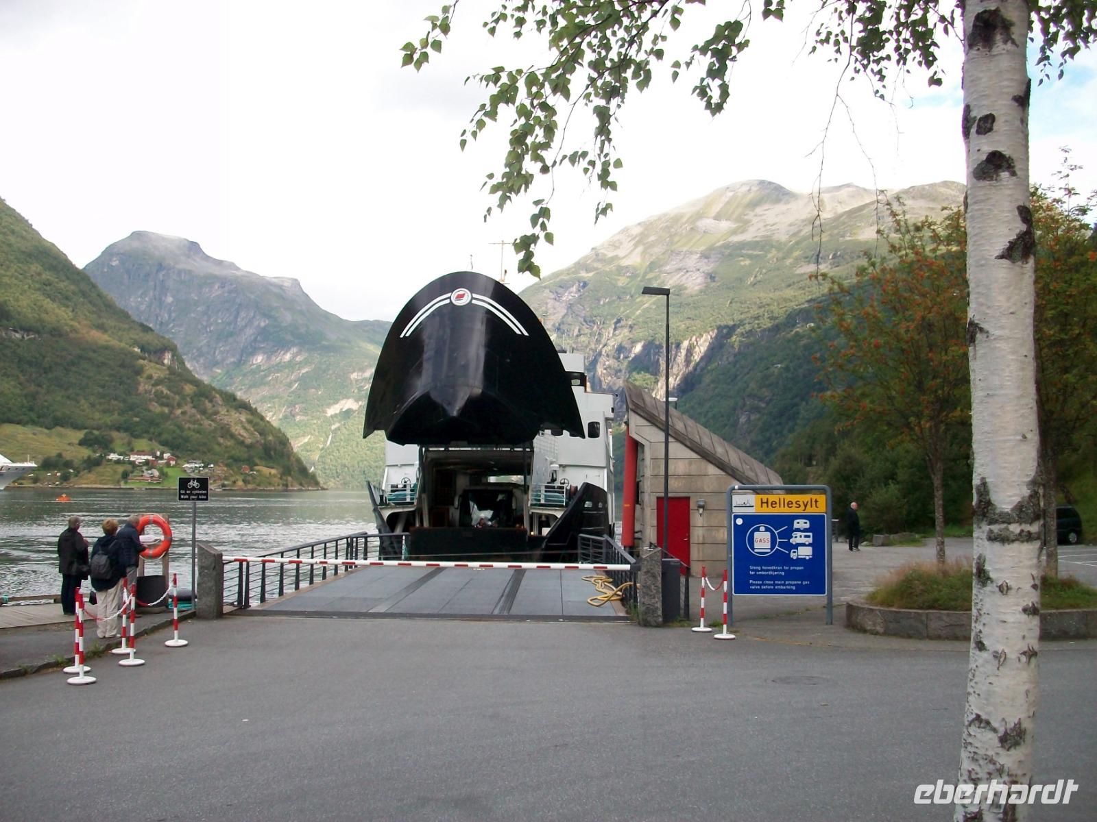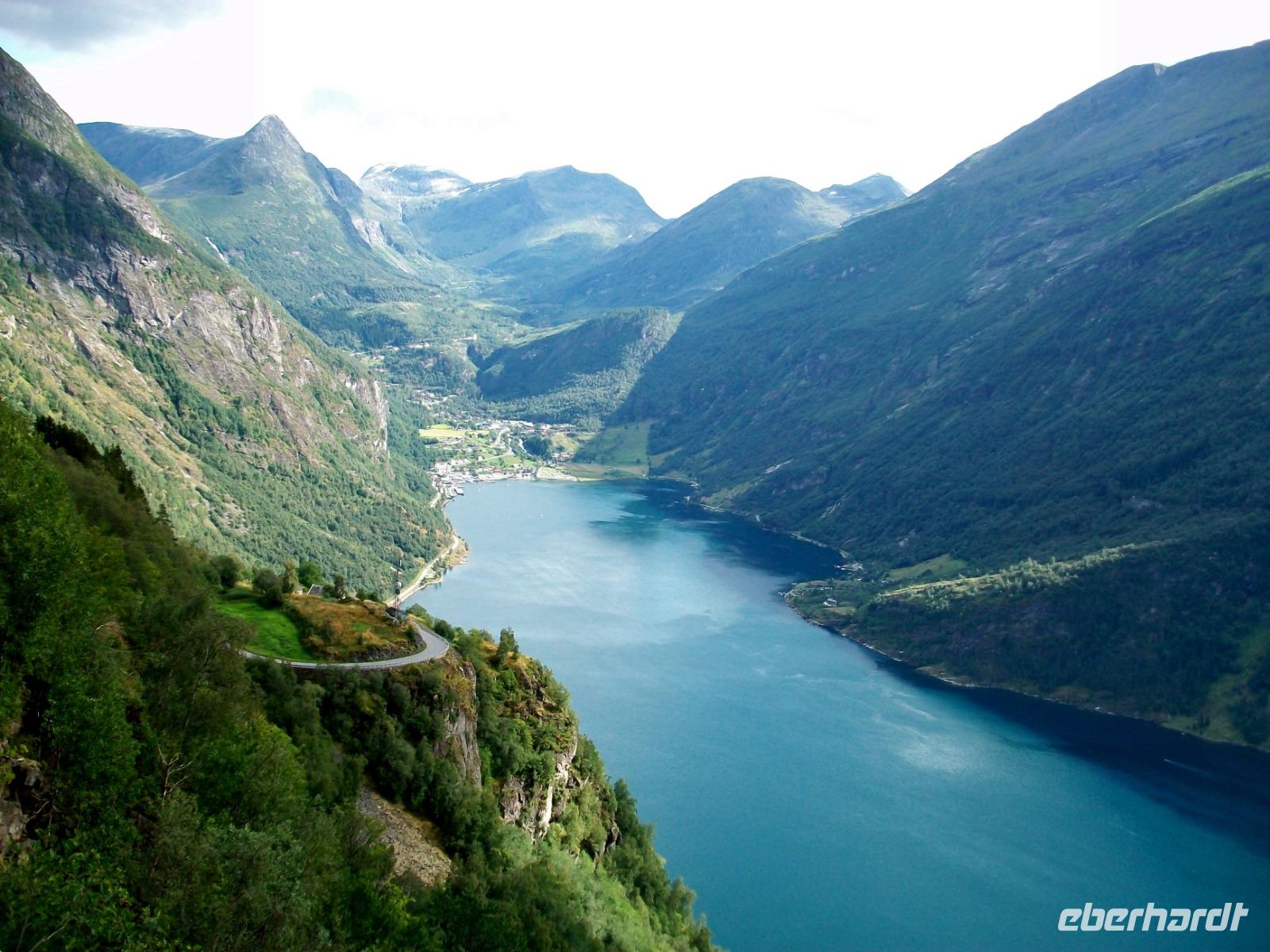 Dennoch müssen wir uns losreisen denn bis zu unserem Ziel haben wir noch ein gute Strecke zu fahren. Wir gelangen wieder hinunter auf Meeresniveau, überqueren einen Fjord mit der Fähre, durcheilen ein grünes Hochtal und langen bald an der Adlerstraße an. Sie führt uns hinunter zum Geirangerefjord, und an der oberen Kurve genießen wir einen Ausblick den man so schnell nicht vergisst!