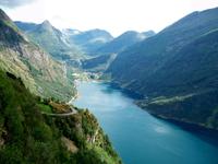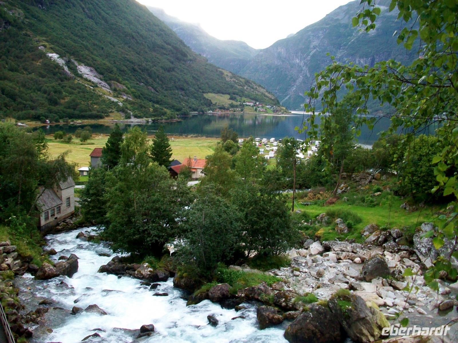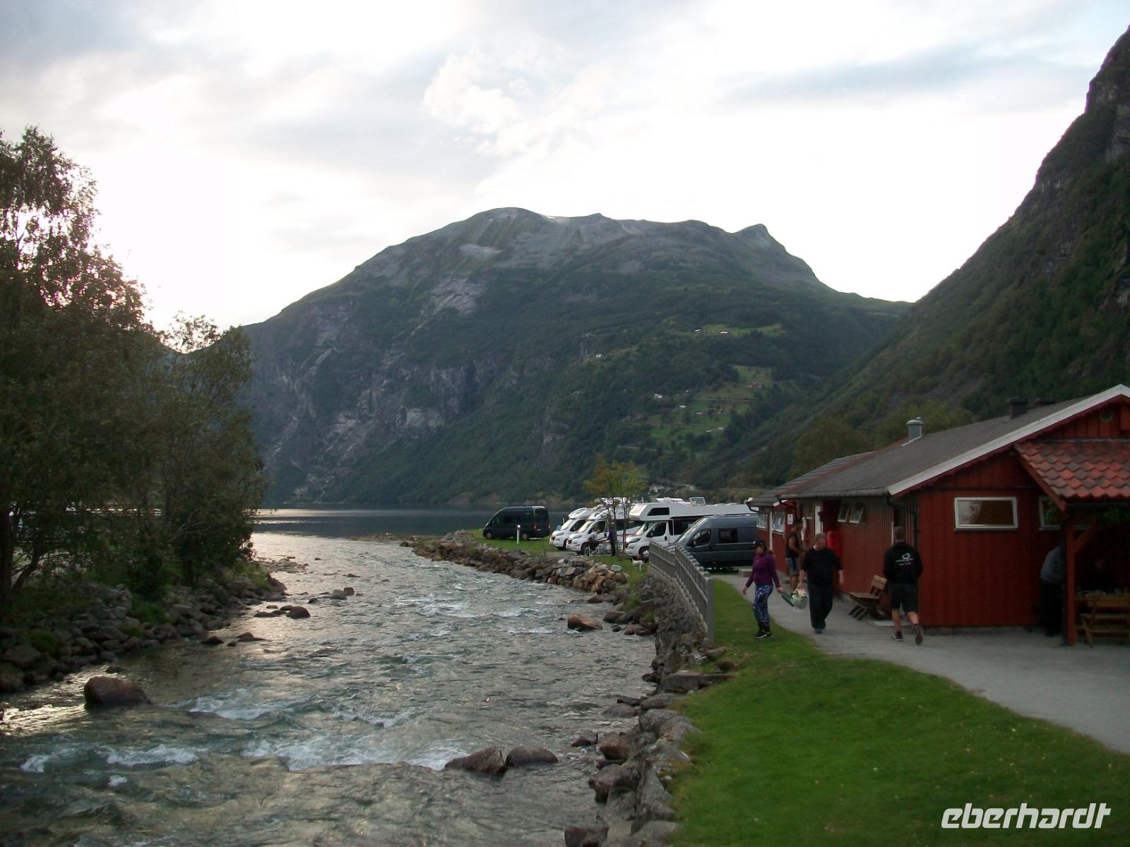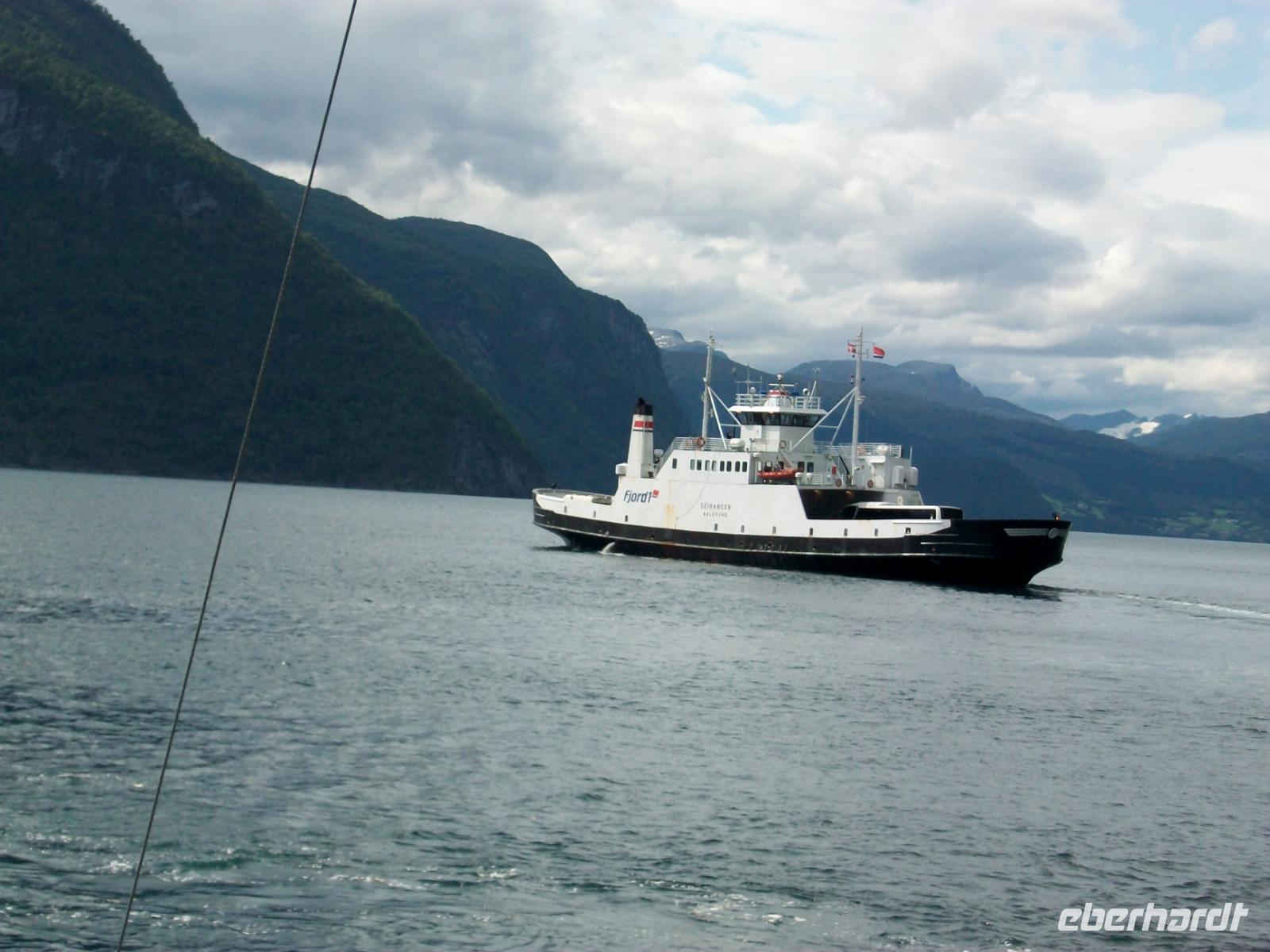 Dennoch müssen wir uns losreisen denn bis zu unserem Ziel haben wir noch ein gute Strecke zu fahren. Wir gelangen wieder hinunter auf Meeresniveau, überqueren einen Fjord mit der Fähre, durcheilen ein grünes Hochtal und langen bald an der Adlerstraße an. Sie führt uns hinunter zum Geirangerefjord, und an der oberen Kurve genießen wir einen Ausblick den man so schnell nicht vergisst!