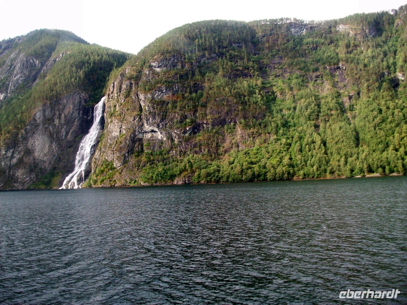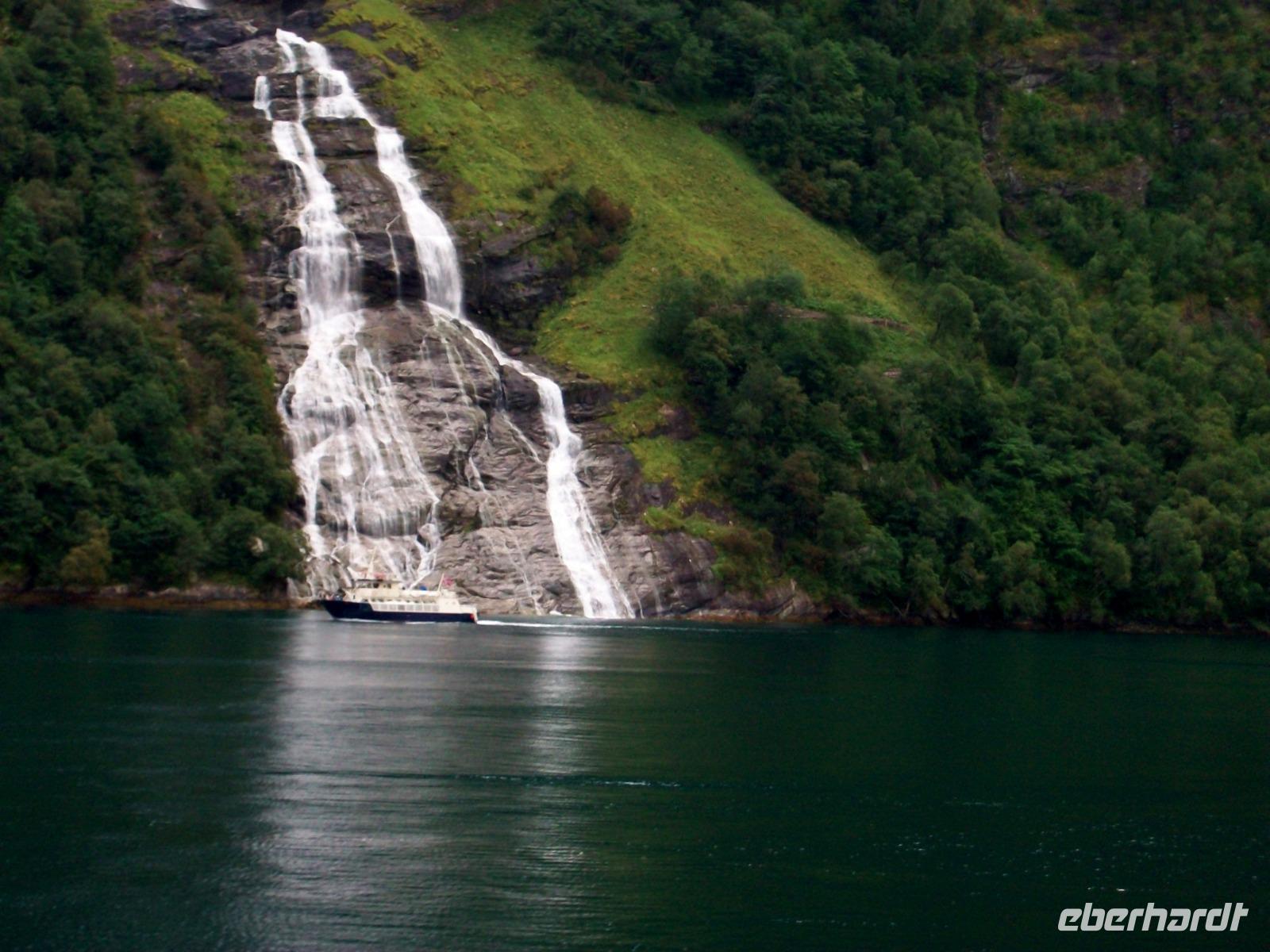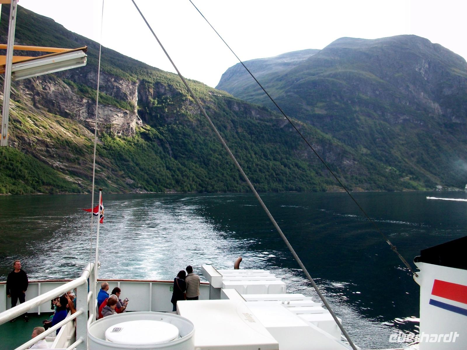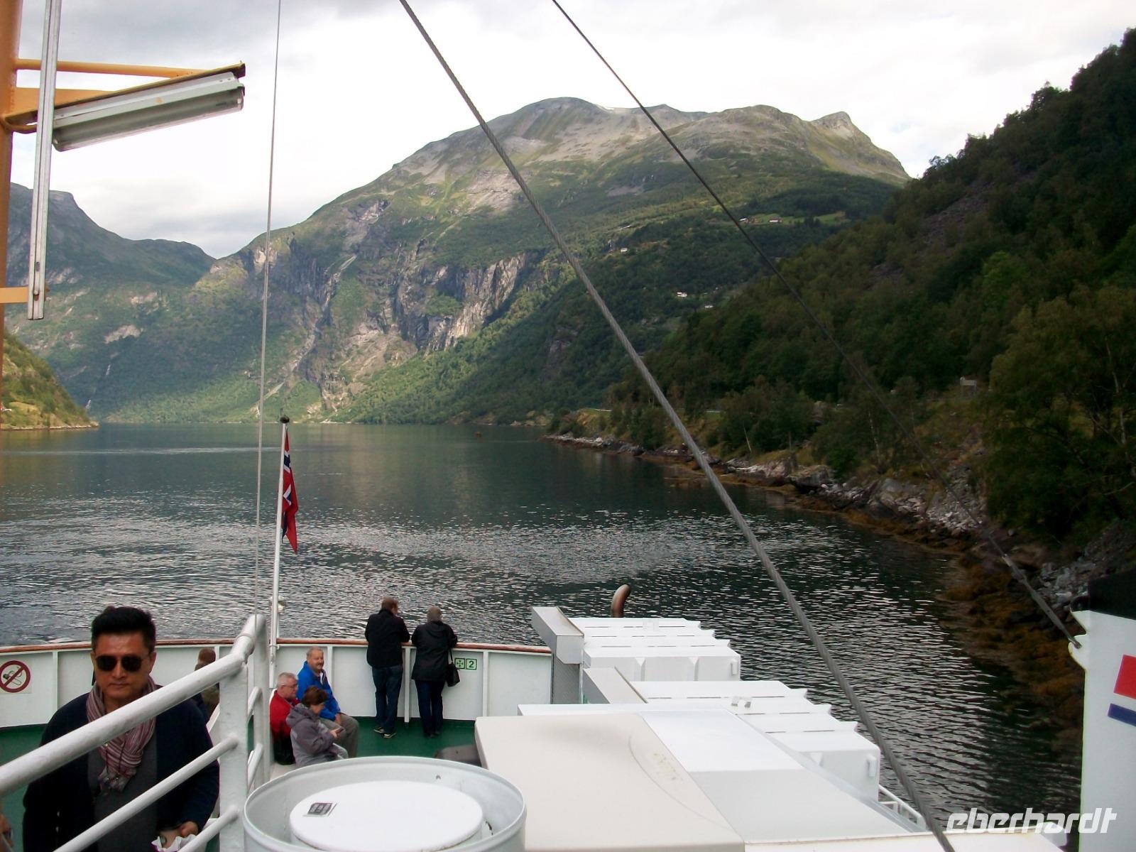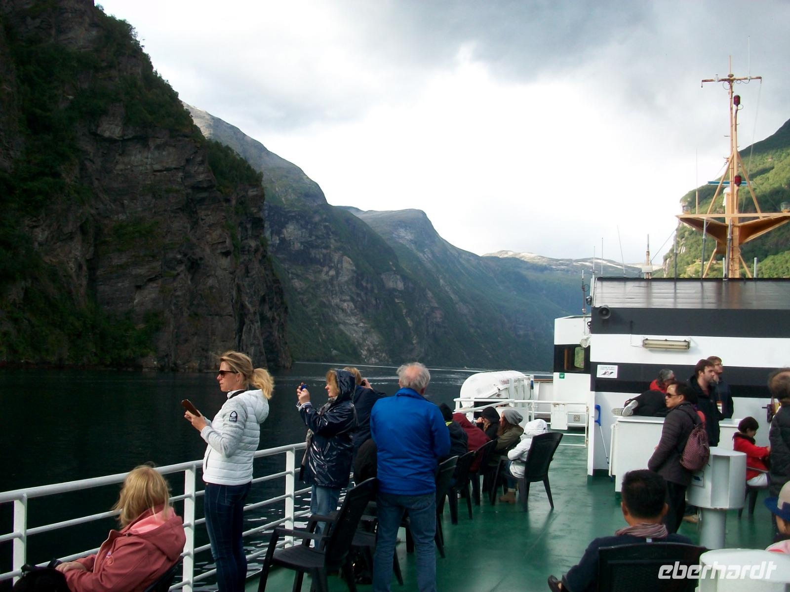 19.8.2019. Der Vormittag sieht uns in Erwartung einer besonderen Kreuzfahrt. Am Anleger von Geiranger liegt das Schiff welches uns in einer eindrucksvollen Fahrt über den Fjord bringen wird. Bald gelangen wir an Bord; auf dem Oberdeck sind die Ausblicke besonders grandios. Wir starten und bald kommen wir den steil aufsteigenden Felswänden immer näher. Wasserfälle bringen ihr schäumendes Nass aus großer Höhe herab und ein weiteres Mal halten wir den Atem an vor dieser Machtdemonstration von Mutter Natur.
