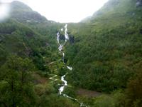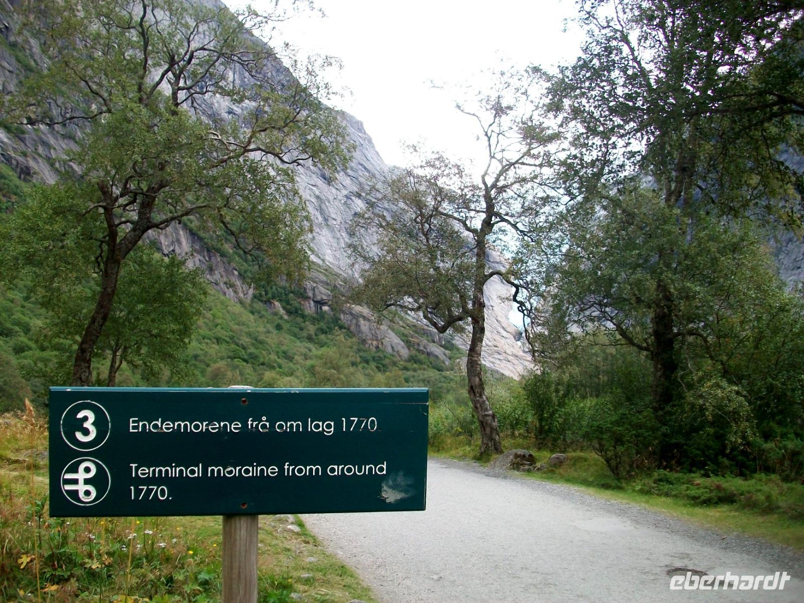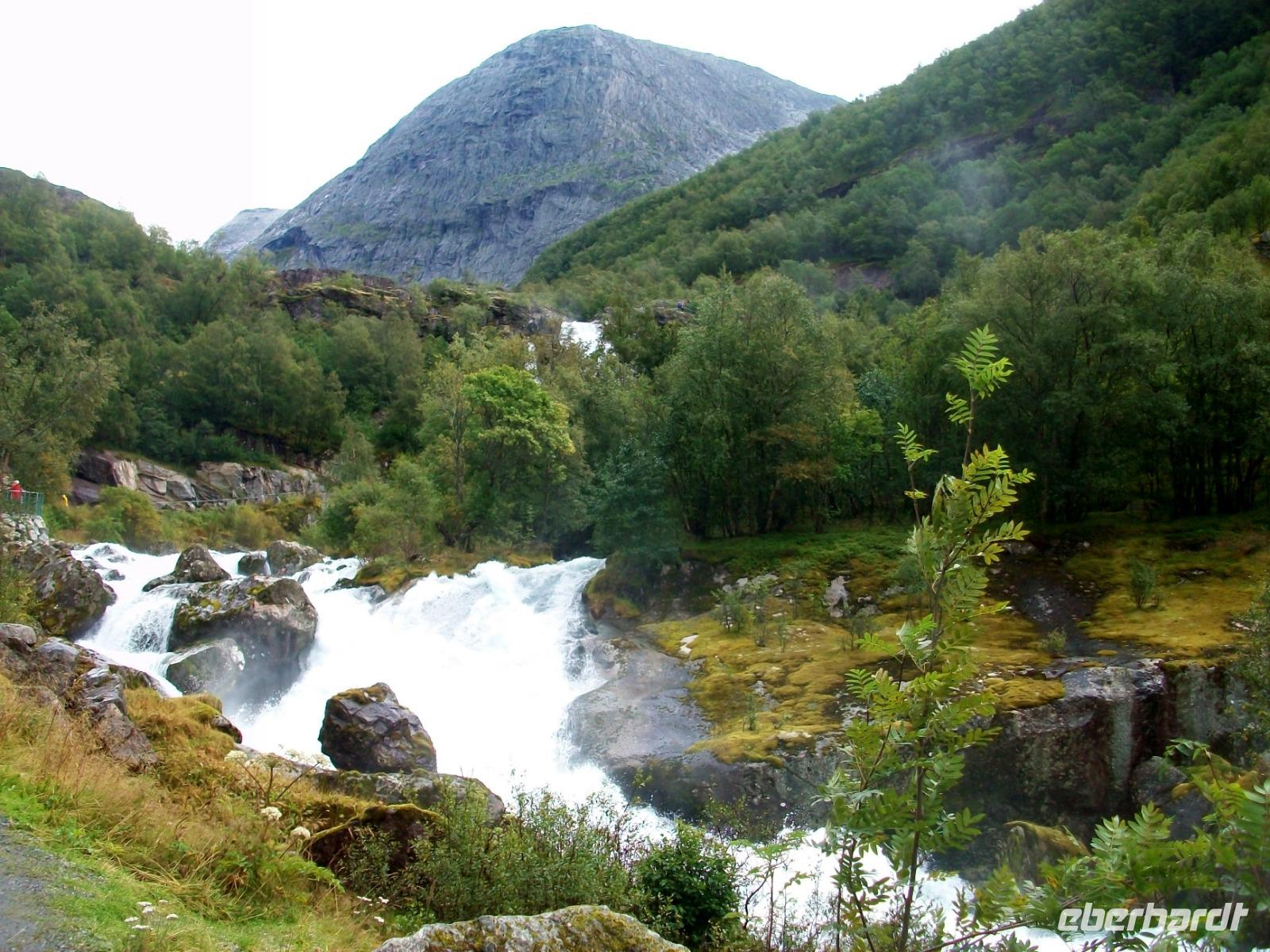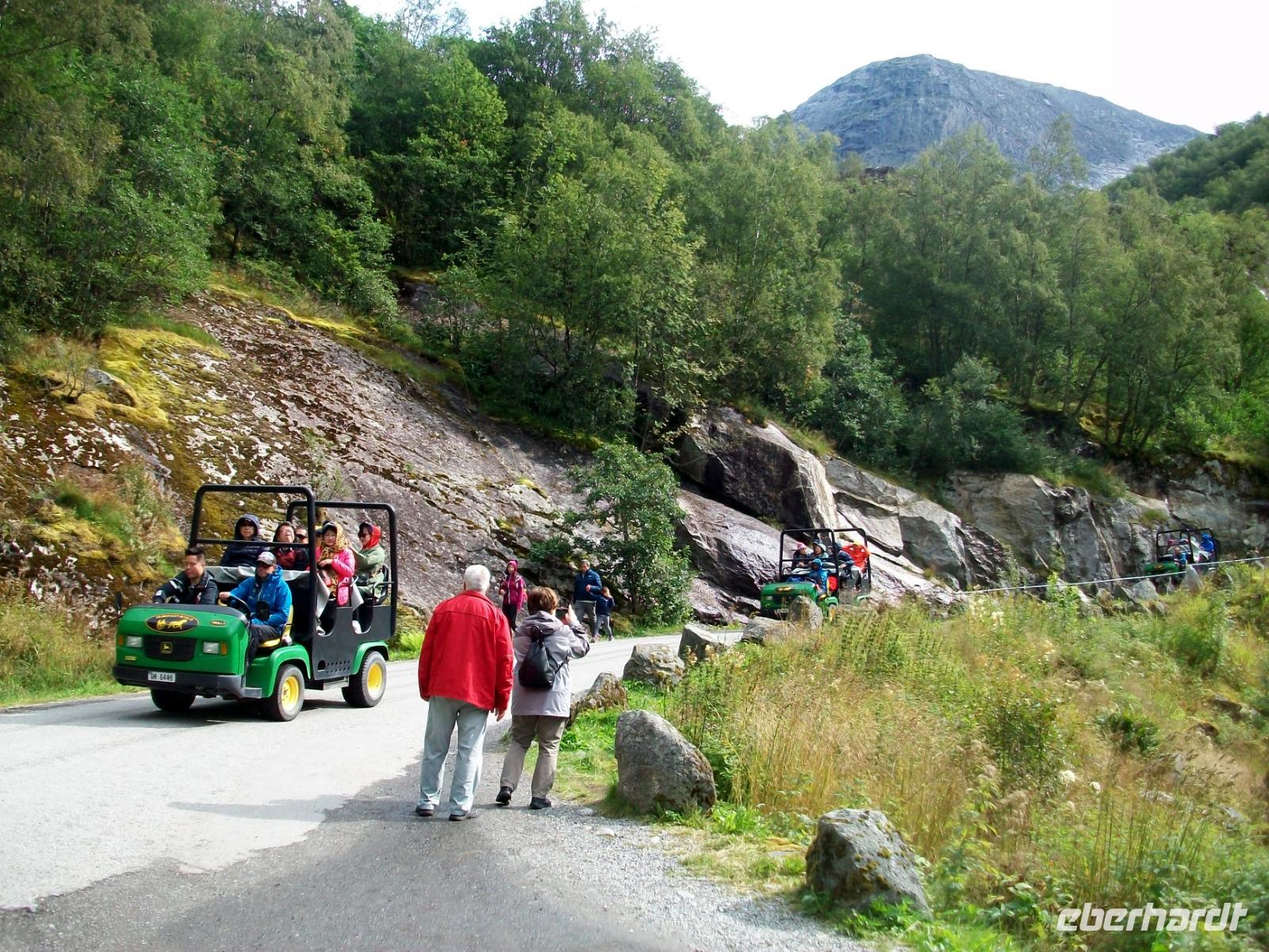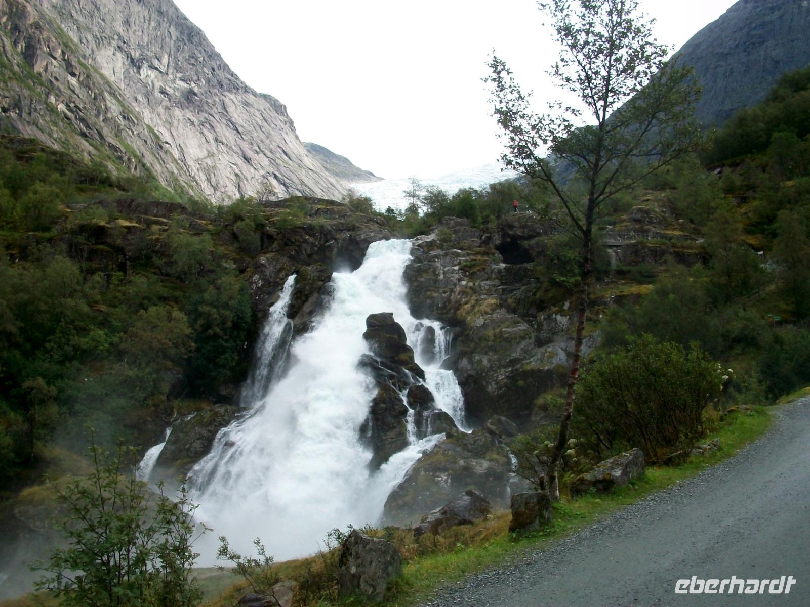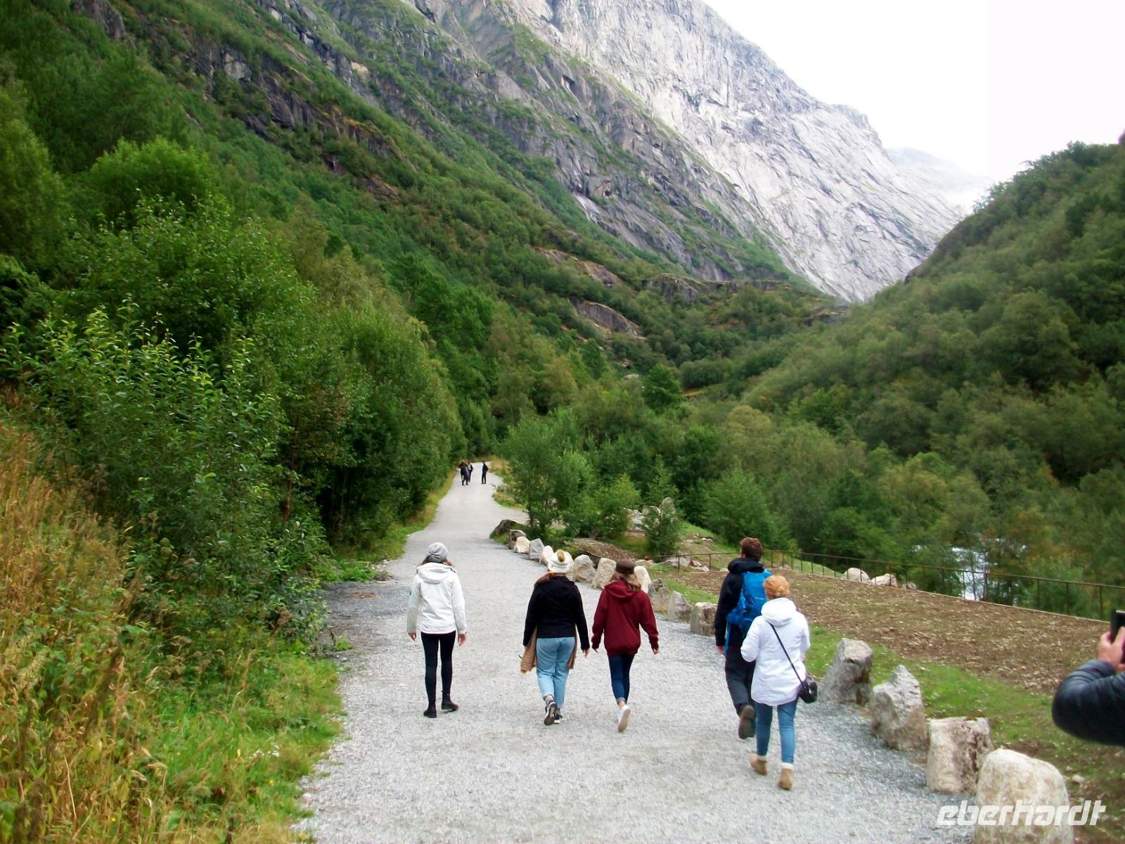 Nach einer guten Stunde langen wir am anderen Ende an und in Hellesylt verlassen wir im Bus sitzend das Schiff. Leider hat Petrus nun seine gute Laune verloren; er sendet uns Regen und gefährdet damit unser Programm etwas. Doch bald reißen die Wolken auf, entlang der Fjorde tauchen wir in ein Tal ein an dessen Ende es einen besonderen Gletscher zu besuchen gilt.