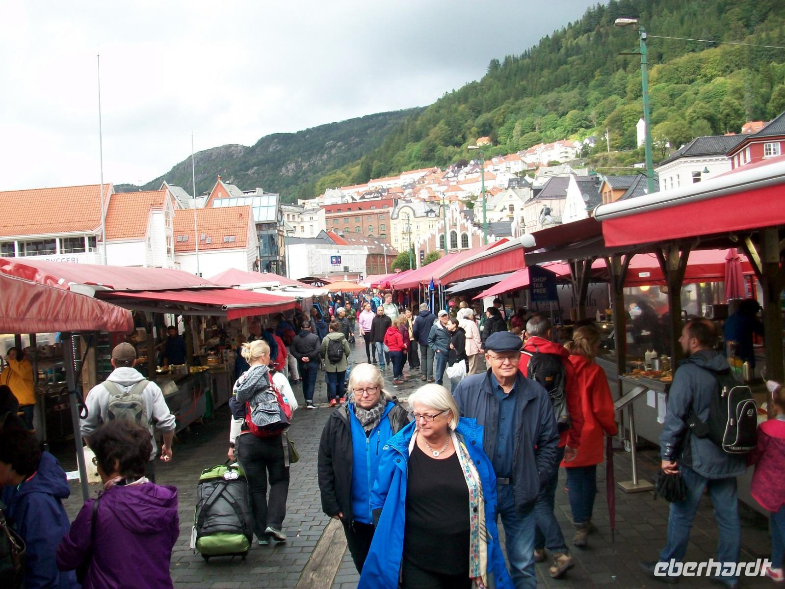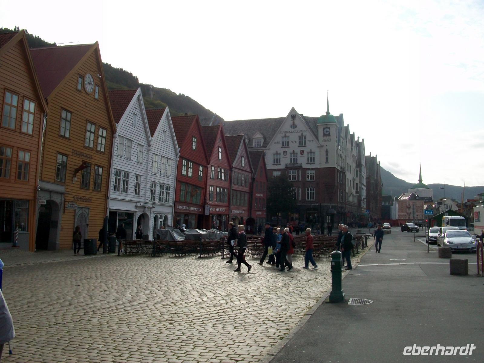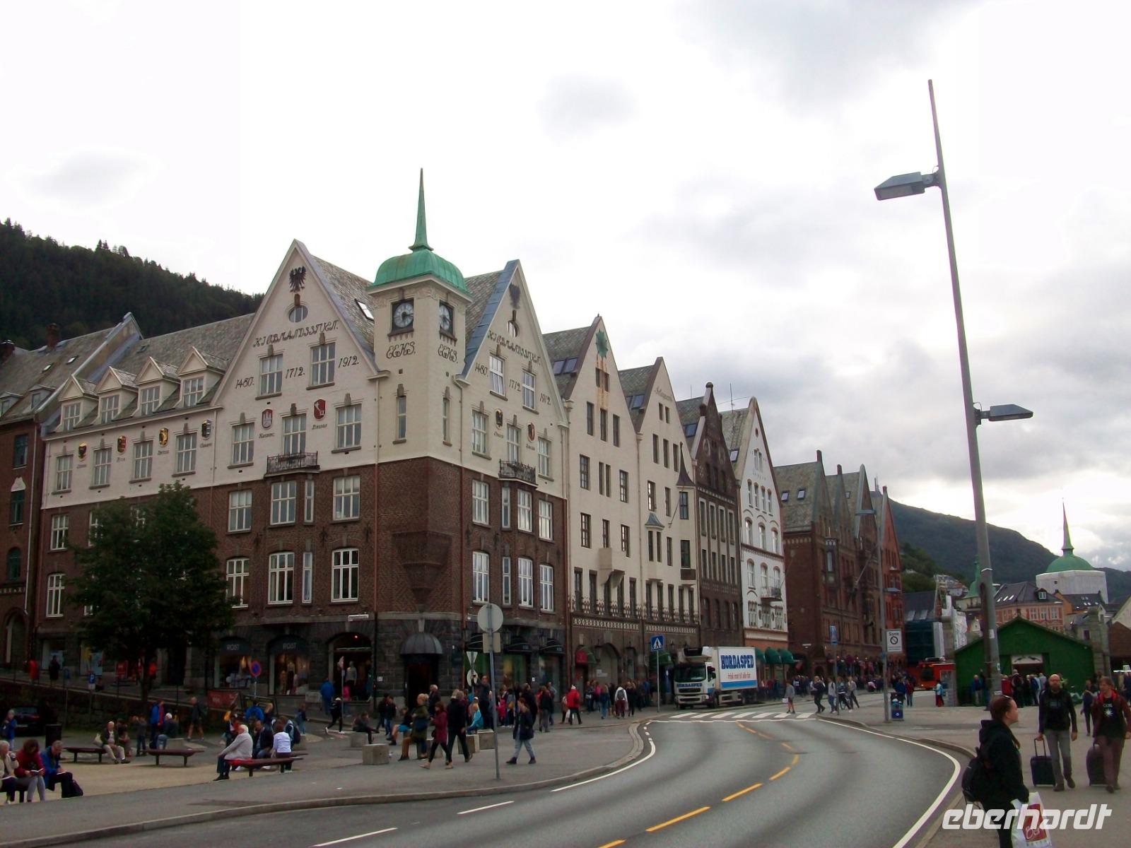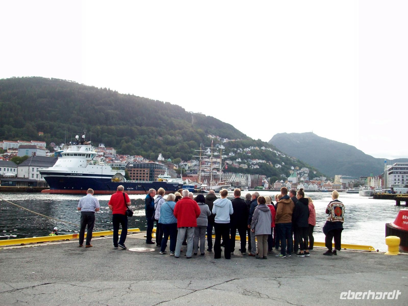 21.8.2019. Pünktlich gegen neun hat sich unser Stadtführer Bernard eingestellt, er wird uns in den nächsten zwei Stunden Bergen zeigen. Zunächst sehen wir zahlreiche Höhepunkte der Stadt vom Bus aus. Bunte Holzhäuser wechseln sich mit Jugendstilarchitektur ab; wir gelangen durch das Zentrum mit dem Theater und der Konzerthalle, benannt nach dem großen Sohn der Stadt, Edvard Grieg. Den schönsten Teil erschließen wir uns aber zu Fuß: Bryggen. Hier hatte einst die Hanse eines ihrer Kontore, die alten Holzhäuser mit den schmalen Gasen zeugen von der einstigen Macht dieser Herren. Nachdem sich Bernard verabschiedet hat geht es noch für ein Stündchen auf eigene Entdeckungen und danach müssen wir uns aber aufmachen, unser Weg ist noch weit.