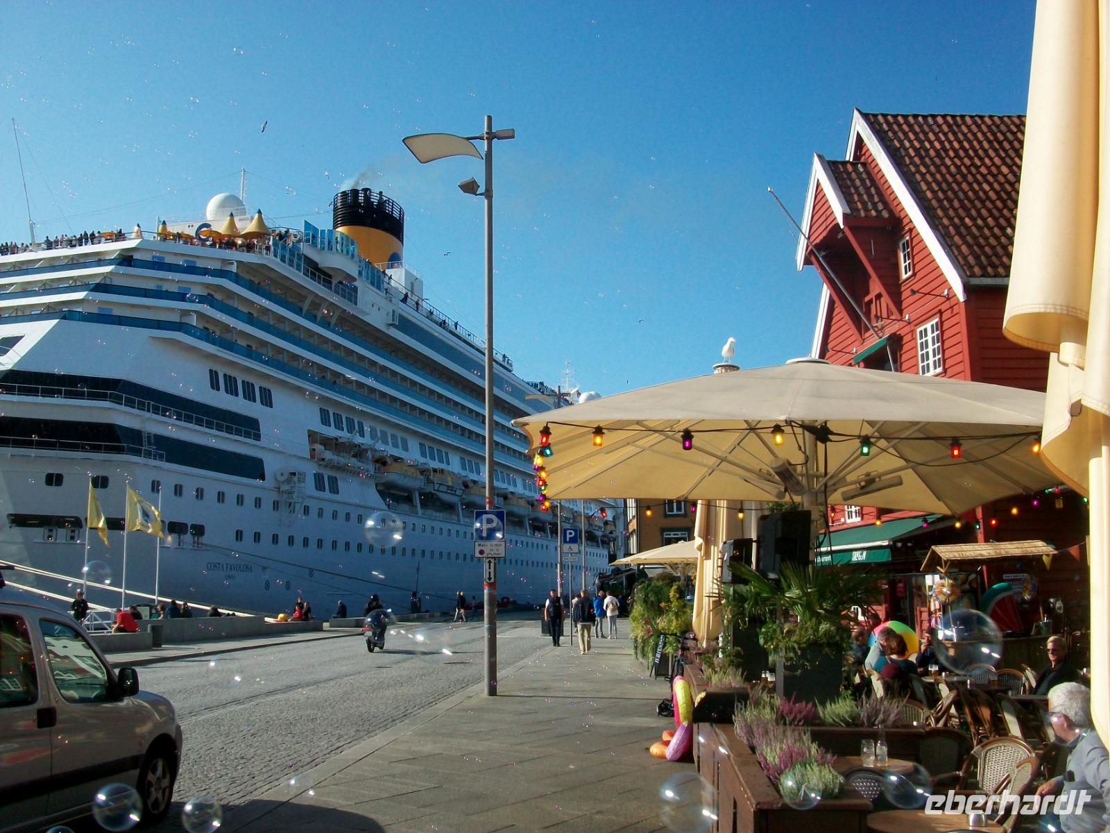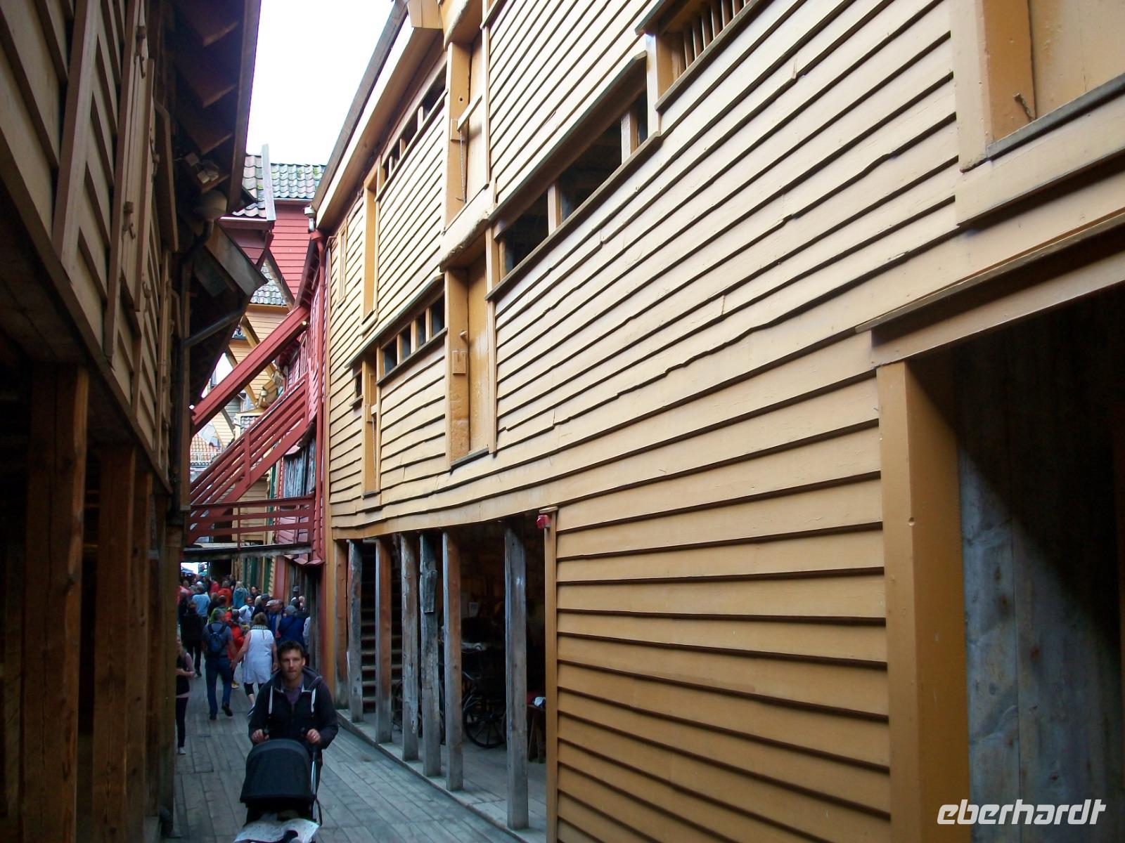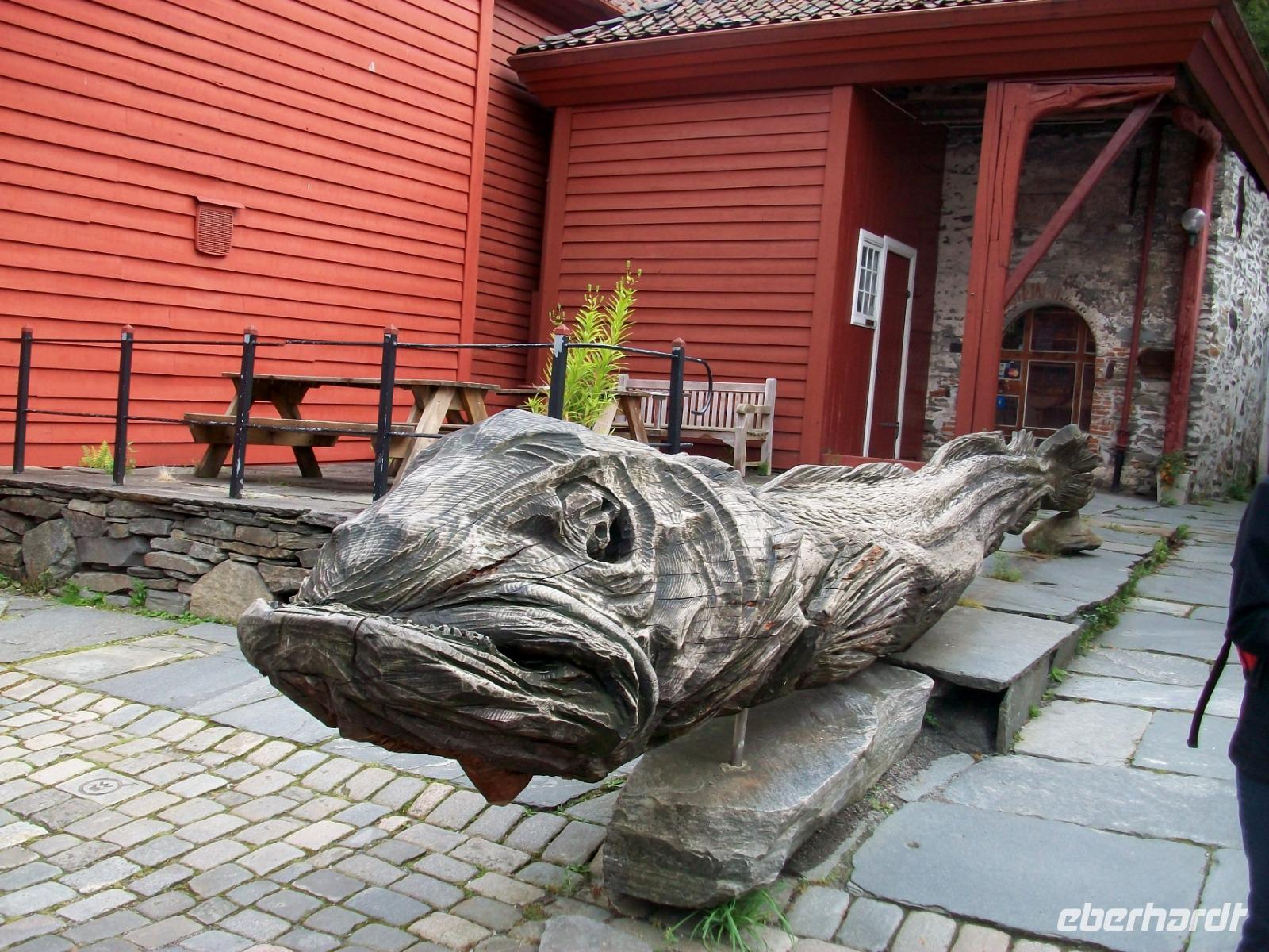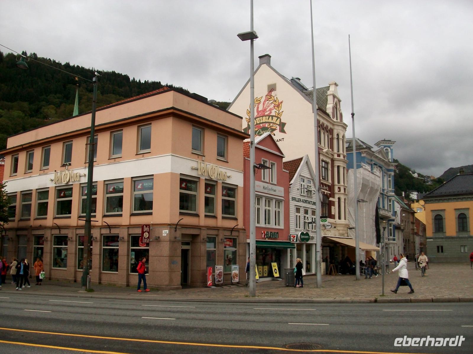 21.8.2019. Pünktlich gegen neun hat sich unser Stadtführer Bernard eingestellt, er wird uns in den nächsten zwei Stunden Bergen zeigen. Zunächst sehen wir zahlreiche Höhepunkte der Stadt vom Bus aus. Bunte Holzhäuser wechseln sich mit Jugendstilarchitektur ab; wir gelangen durch das Zentrum mit dem Theater und der Konzerthalle, benannt nach dem großen Sohn der Stadt, Edvard Grieg. Den schönsten Teil erschließen wir uns aber zu Fuß: Bryggen. Hier hatte einst die Hanse eines ihrer Kontore, die alten Holzhäuser mit den schmalen Gasen zeugen von der einstigen Macht dieser Herren. Nachdem sich Bernard verabschiedet hat geht es noch für ein Stündchen auf eigene Entdeckungen und danach müssen wir uns aber aufmachen, unser Weg ist noch weit.