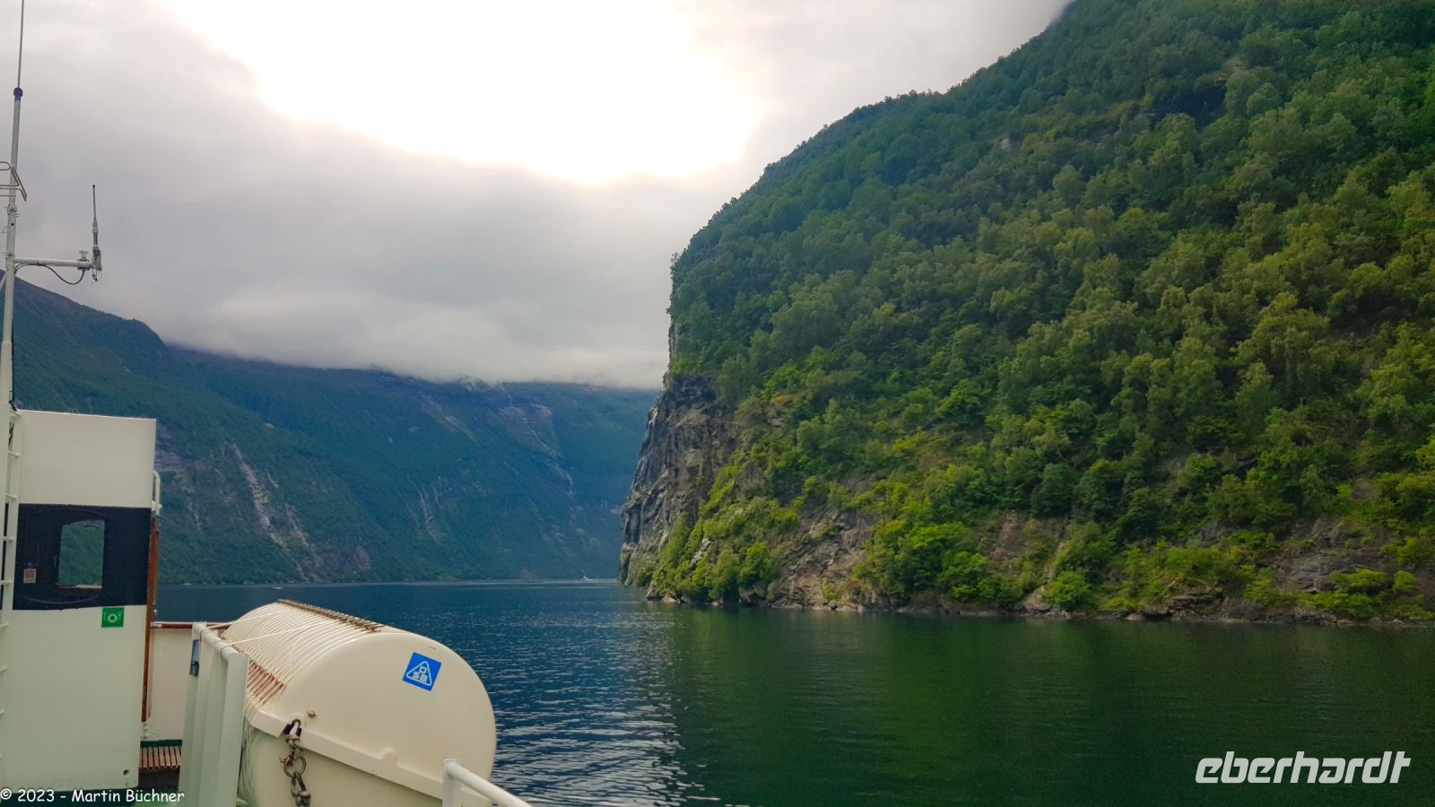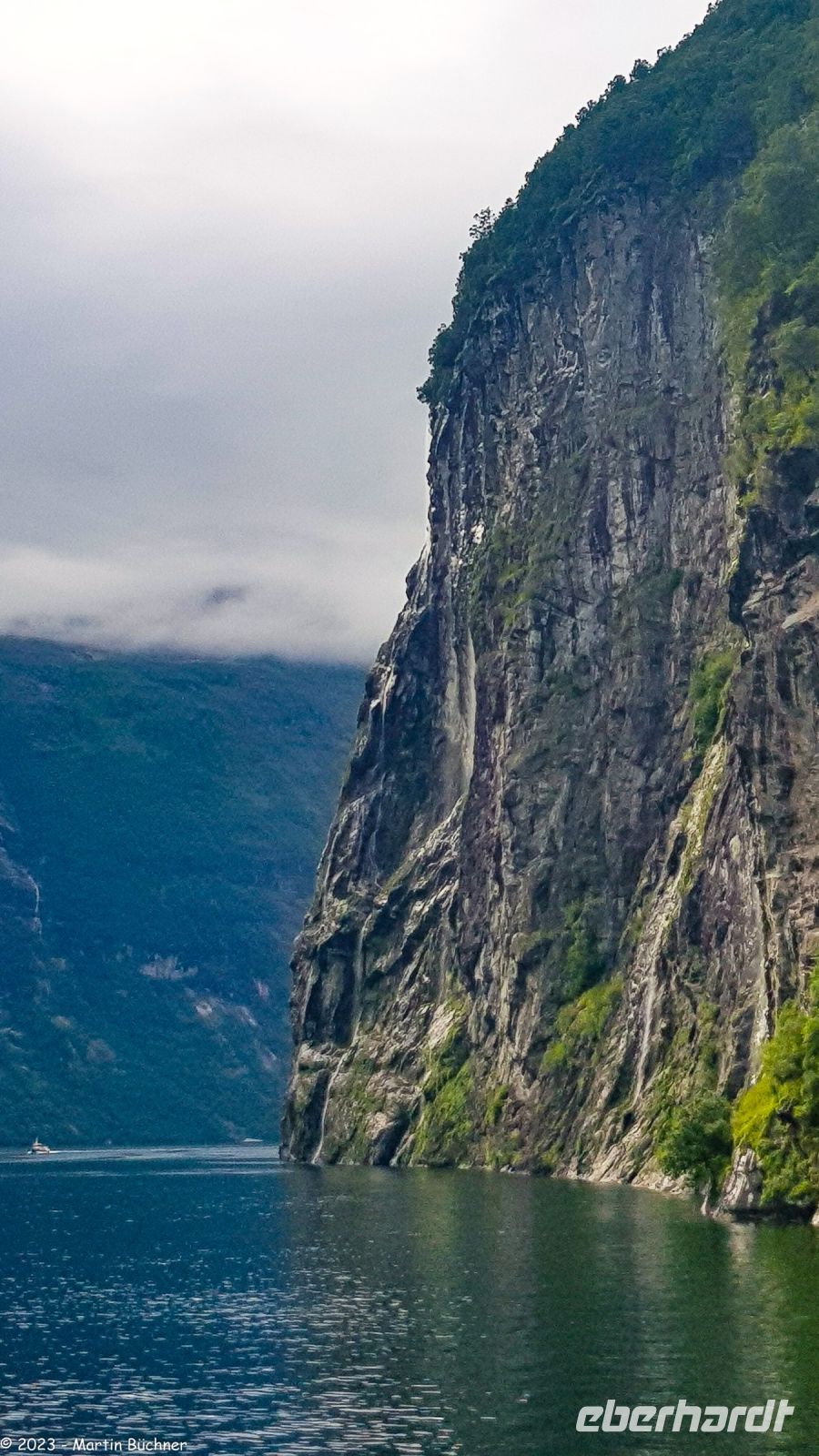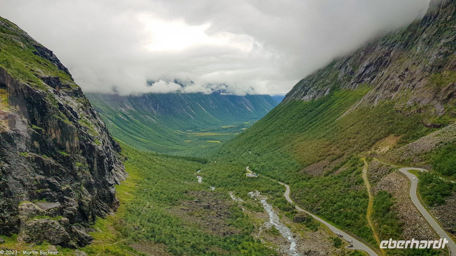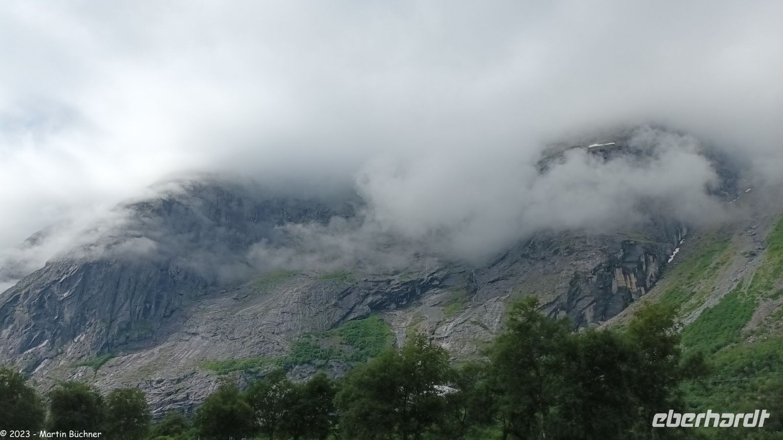 Wir erreichen die Trollwand (Trollveggen), über 1.000 Meter senkrechter Fels. Leider heute von Wolken verhangen.