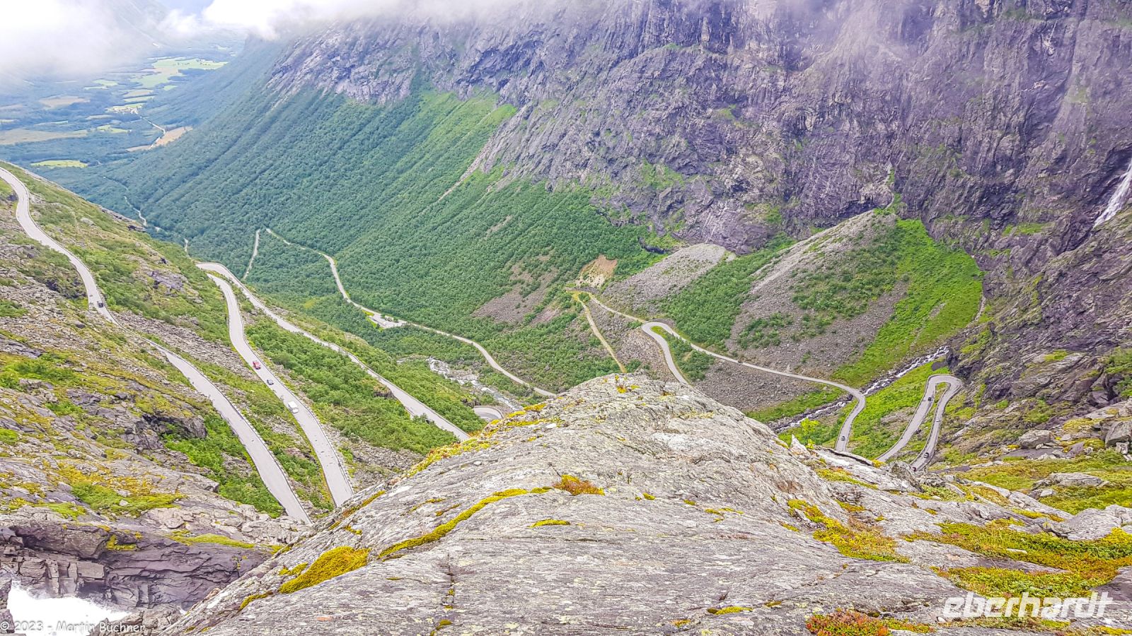 Über den berühmten Trollstigen geht es hinauf in die Berge. In elf Serpentinen windet sich eine der spektakulärsten Panoramastraßen Norwegens hinauf zum 850 Meter hohen Pass.