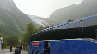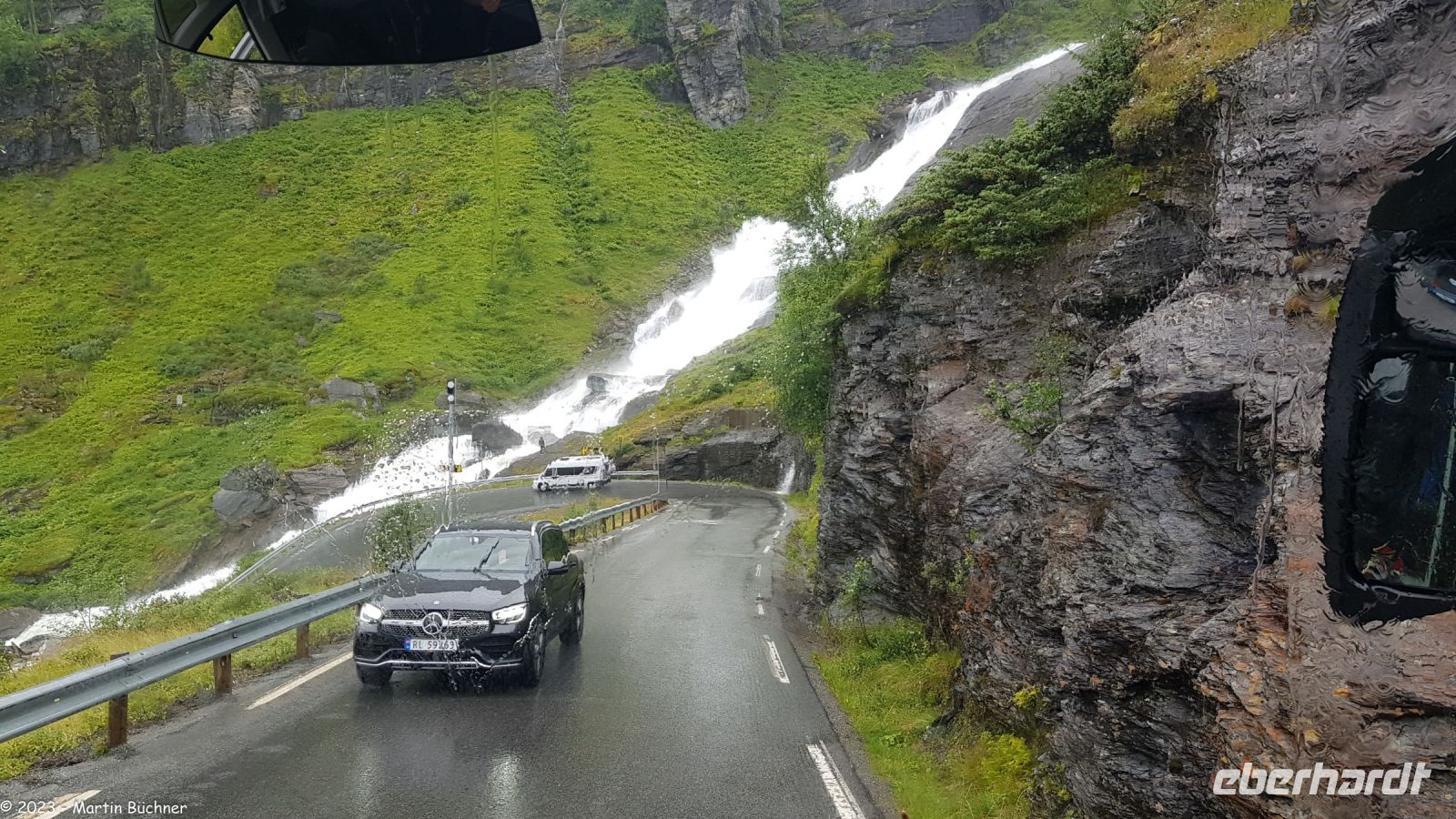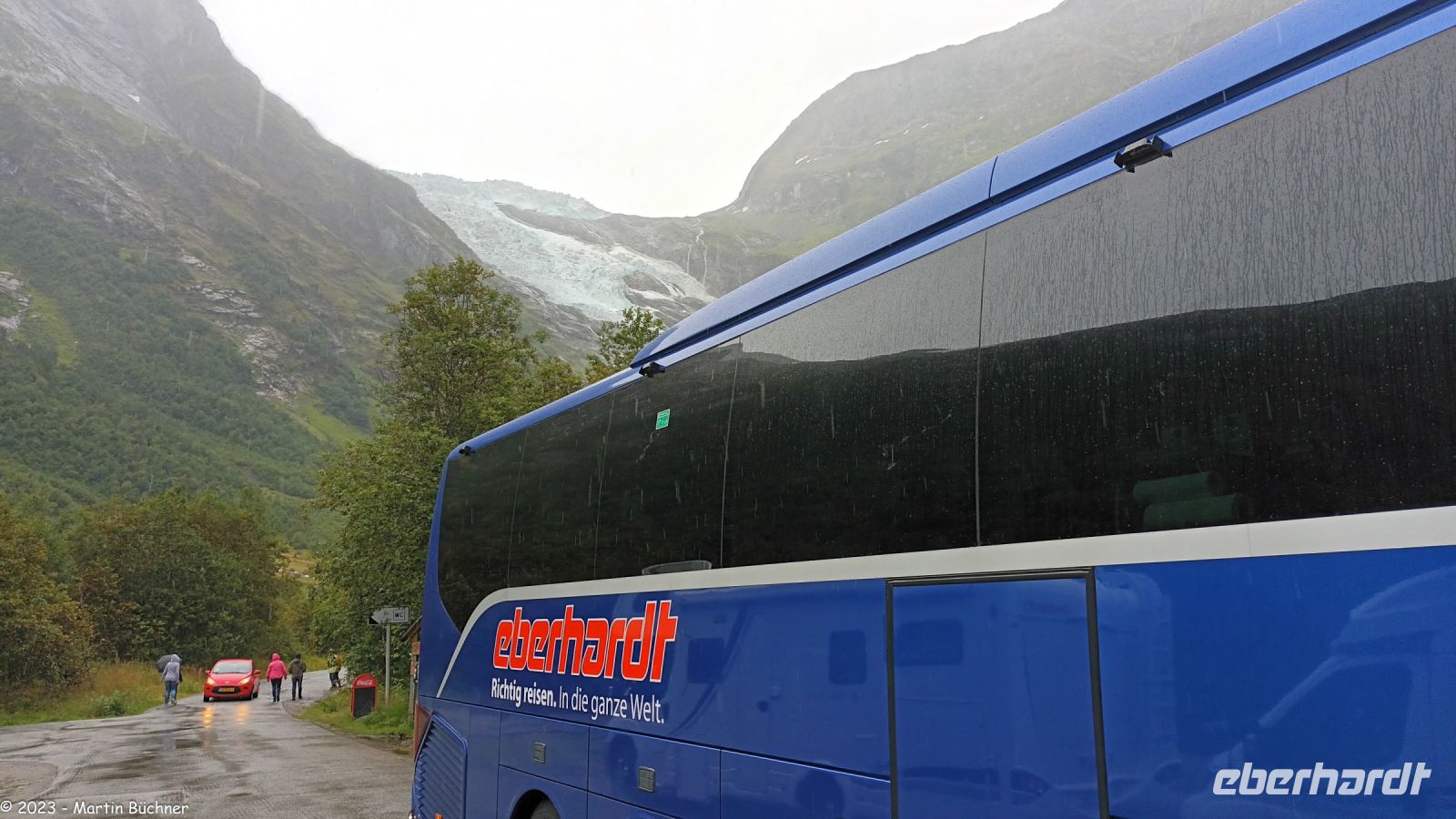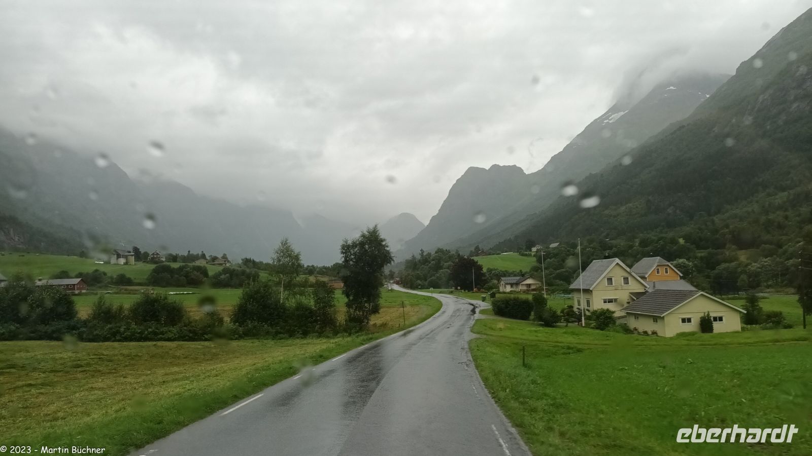 Wir entscheiden nach Briksdal zu fahren, verzichten aber aufgrund massiver Wetterwarnungen und Regen in Bindfäden auf die fakultative Fahrt mit den Trollautos bzw. der Wanderung zum Briksdalsbreen. Sicherheit geht für uns vor – auch hinsichtlich der weiteren Entwicklungen auf den Straßen. Auch wenn das andere Gruppen nicht so einschätzen.