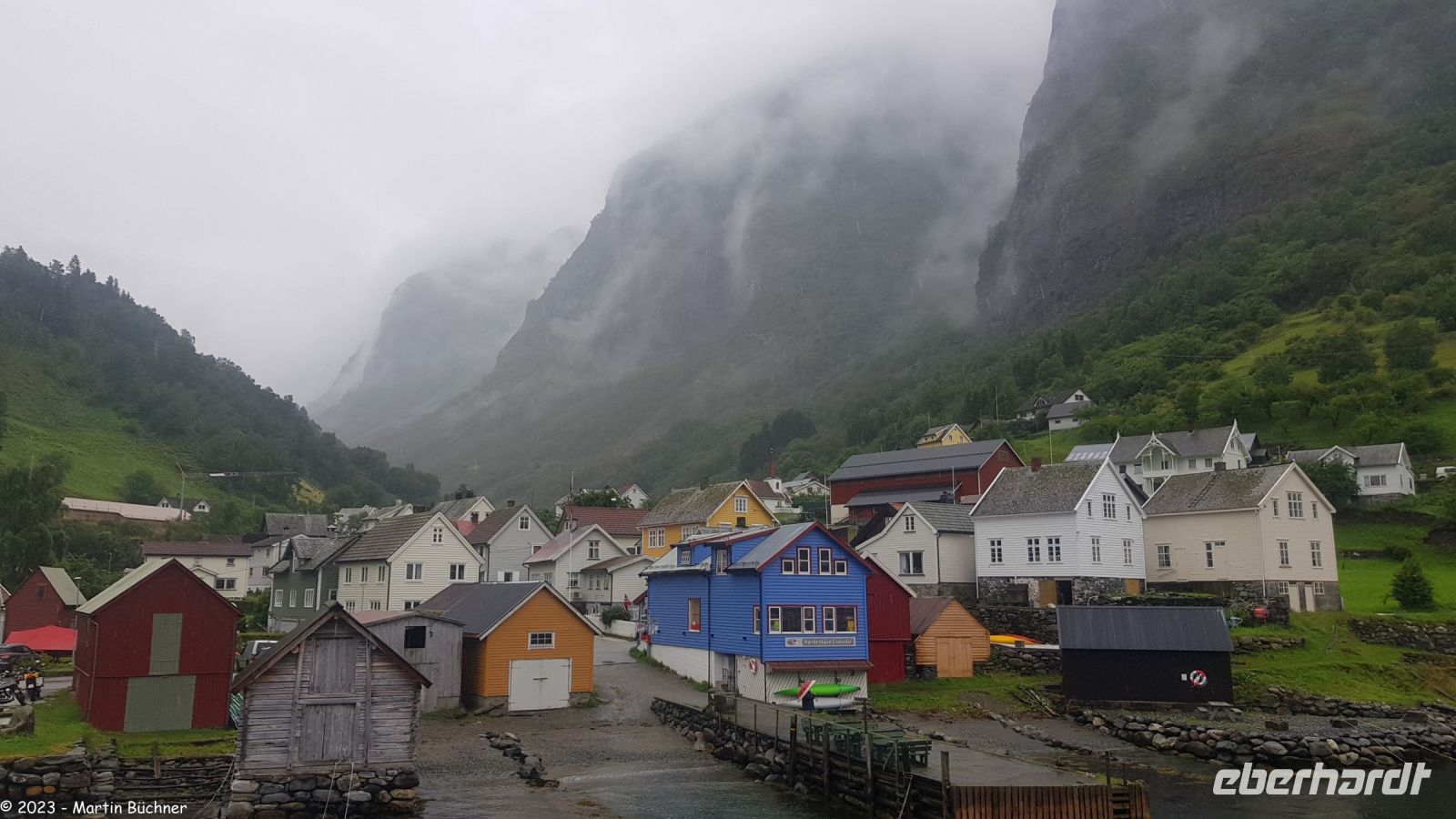 Wir erreichen Flåm, am Ende des Aurlandsfjordes. Damit betuchte Gäste den Ort auch auf dem Landweg erreichen konnten, begann man mit dem Bau der Flåmsbane, der bis heute steilsten Eisenbahnstrecke der Welt, die noch von normalen Zügen ohne weitere technische Hilfsmittel wie Zahnrad befahren wird. Auf gut 20 km Strecke überwindet der Zug über 800 Höhenmeter. Wie sich später herausstellte haben wir erneut riesiges Glück. Den gesamten Vormittag war die Strecke wegen umgestürzter Bäume, durch Extremwetter Hans, gesperrt. Unsere Abfahrt war die erste reguläre Abfahrt des Tages.