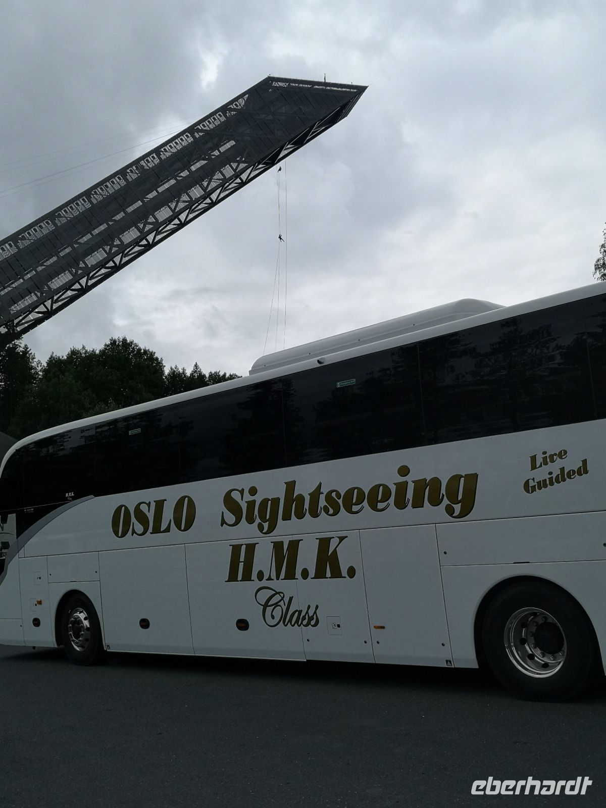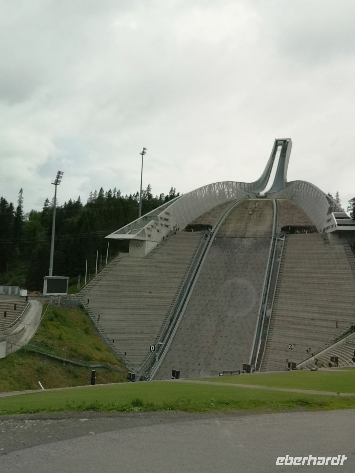 Vikingskipet – das umgedrehte Wikingerschiff – in Hamar war das erste Objekt aus der olympischen Arena aus dem Jahr 1994, das uns gegrüßt hat, gefolgt von den Lysgardsbakkene Sprungschanze in Lillehammer. Da hatten wir Glück, einige „Skiflieger“ beim Sommertraining zu beobachten.