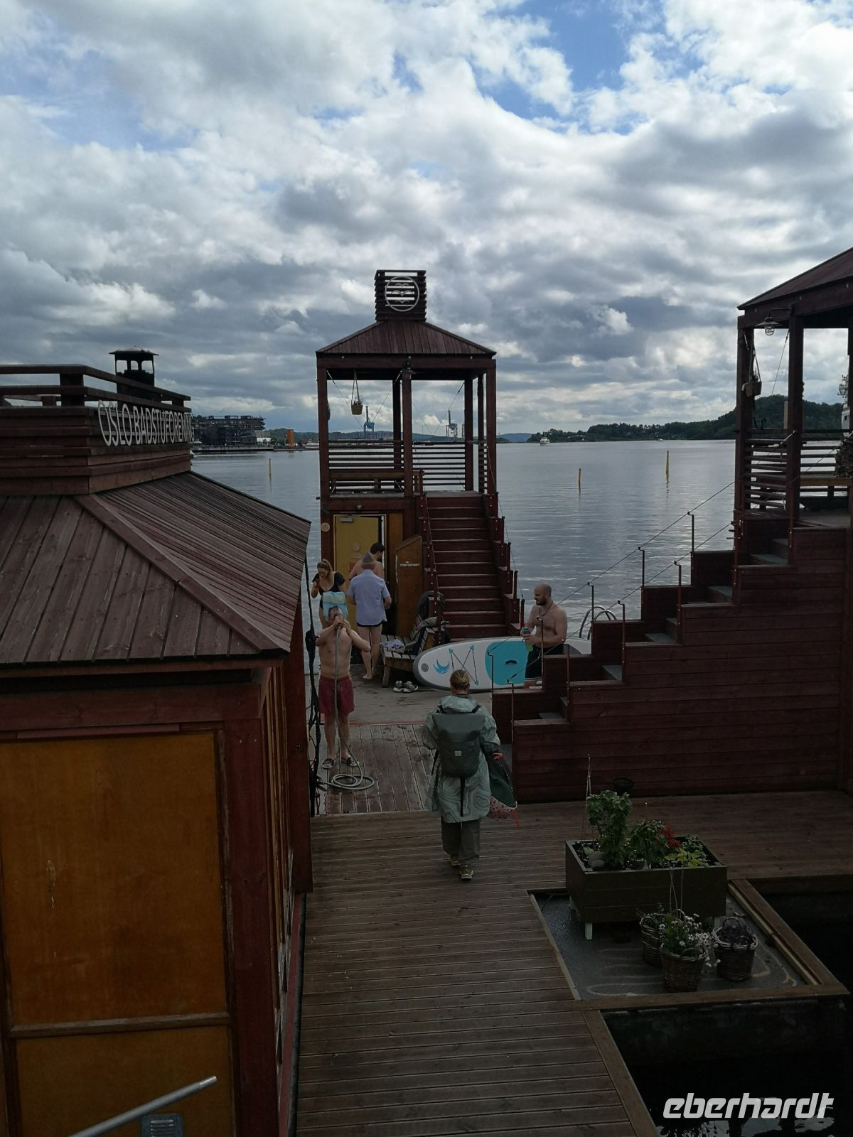 Unser junger, kühner Busfahrer Dominik steuerte zuversichtlich den Bus nach den Anweisungen des Stadtführers Heino. Ein Rheinländer, der schon seit Jahren in Oslo seine Bleibe gefunden hat, zeigte uns die Perlen von der norwegischen Hauptstadt Oslo, führte uns rauf auf den Holmenkollen und als er uns in den Vigeland Park führen wollte, kam alles, was vom Regen im Himmel vorhanden war, hier runter. Also musste Plan B her: Museumsinsel. Da konnten wir dann trocknen Fußes doch einiges sehen: das königliche Sommeranwesen samt königlichen Kühen mit Krönchen auf der Stirn (Augenzwicke ??) und königlichen Wachen an ihren Posten, Fram Museum …… Unser gemeinsamer Weg endete dann an der Akershus Festung und, Gott sei Dank, da hörte auch Regen auf. Wir konnten unsere freie Zeit doch noch im Trockenen gestalten. Jeder wählte seine persönliche Route und persönlichen Ziele aus – bummeln ist angesagt. Mich zog es zuerst in eine Konditorei ein – Lefse mit Braunkäse und Römme (wie Sauerrahm, nur noch fetthaltiger) lockte wie eine Huldra. Das ist, übrigens, ein weiblicher Troll(in), sehr verführerisch und gefährlich. Na ja, so lebensgefährlich ist Lefse nicht, außer paar Gramm Fett mehr auf den Rippen. Aber, das ist es wert. Solch Versuchungen hatten wir auf unserer Reise noch in Fülle – zB. Waffeln mit Römme und Erdbeermarmelade, Zimt- oder Kardamomschnecken…… Danach musste ich mir nochmal den „Badestrand“ genauer anschauen. Der ist bei (für uns zumindest) sehr niedrigen Temperaturen schon längst eröffnet. Obelix würde sagen: „die spinnen, die Osloer!“